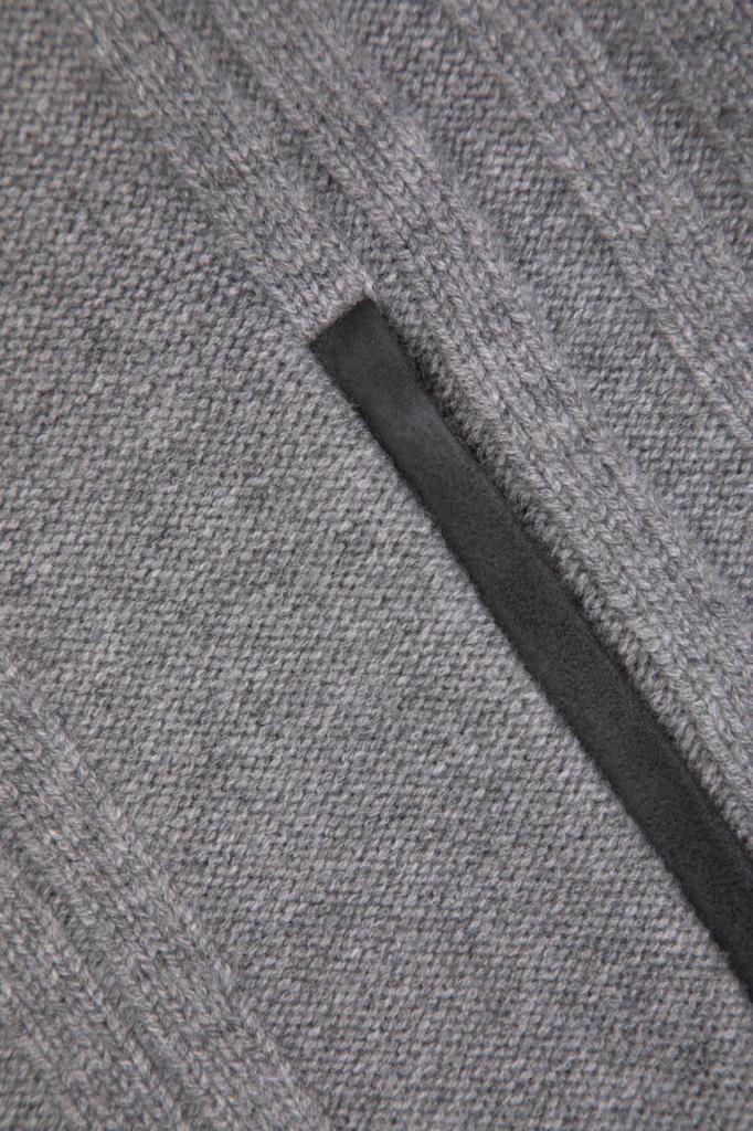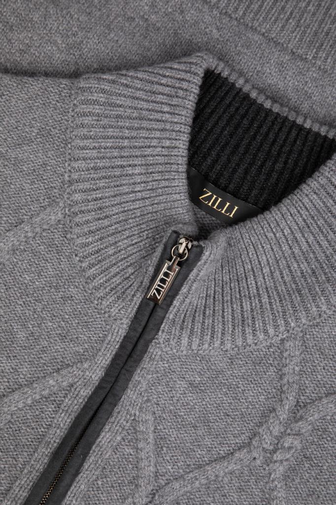 Кашемировый кардиган серого цвета от ZILLI. В изделии с невысоким воротником-стойкой будет комфортно и зимой, и в период межсезонья. Грудь модели подчёркнута геометрическим узором Rhombus, который переходит в рельефные вертикальные полосы. Врезные боковые карманы и планка встречной молнии с двумя брендированными пуллерами, покрытыми рутением, укреплены бархатистой тёмно-серой замшей. Увеличенная горловина, манжеты рукавов и пояс подобраны на широкую резинку.