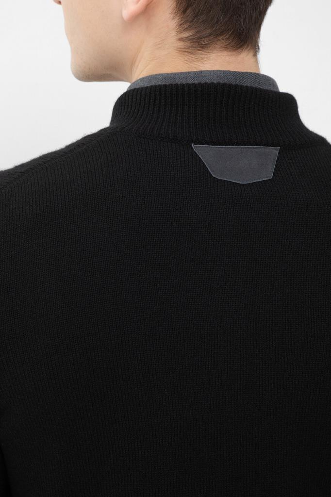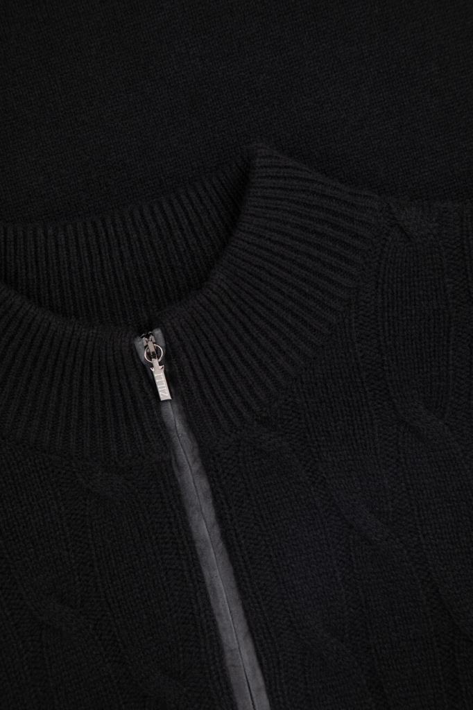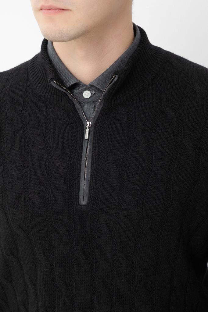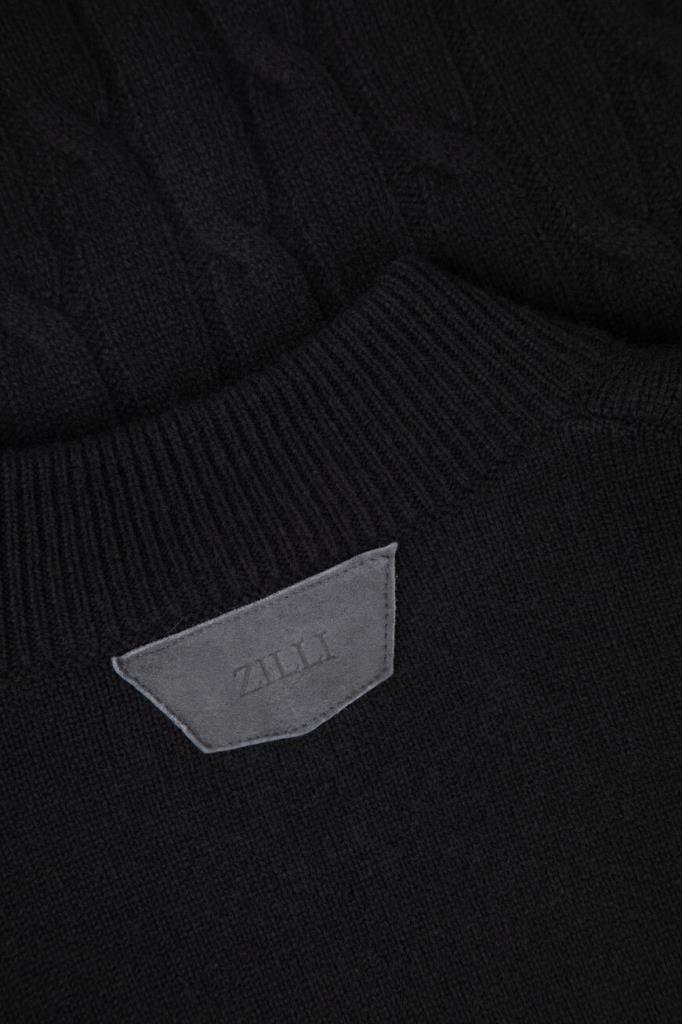 Чёрный свитер Zilli с фактурным геометрическим узором «косы» спереди. Изделие, связанное из мягкого кашемира чулочной вязкой, отличается прямым кроем и наличием длинных рукавов. Невысокий воротник-стойка оснащён короткой молнией с брендированным бегунком и отделкой из бархатистой замши вдоль планки. О принадлежности свитера Дому напоминает тиснёный логотип на замшевой вставке сзади.