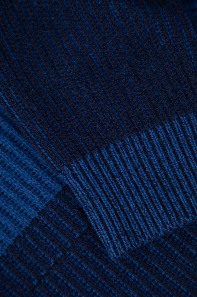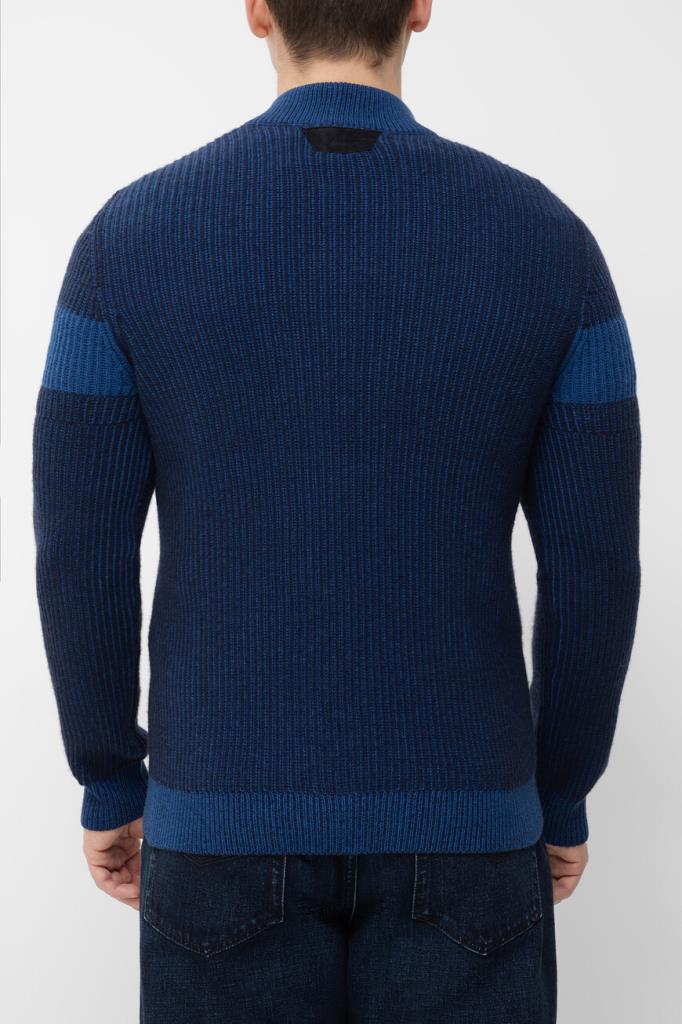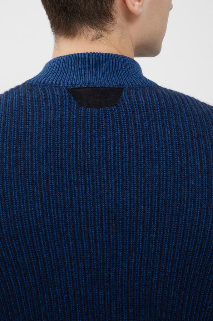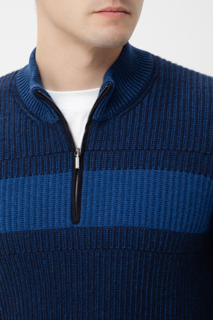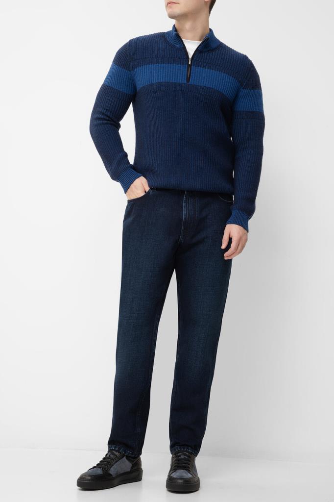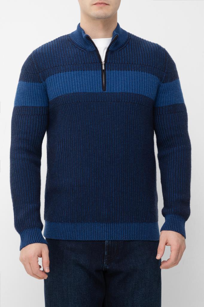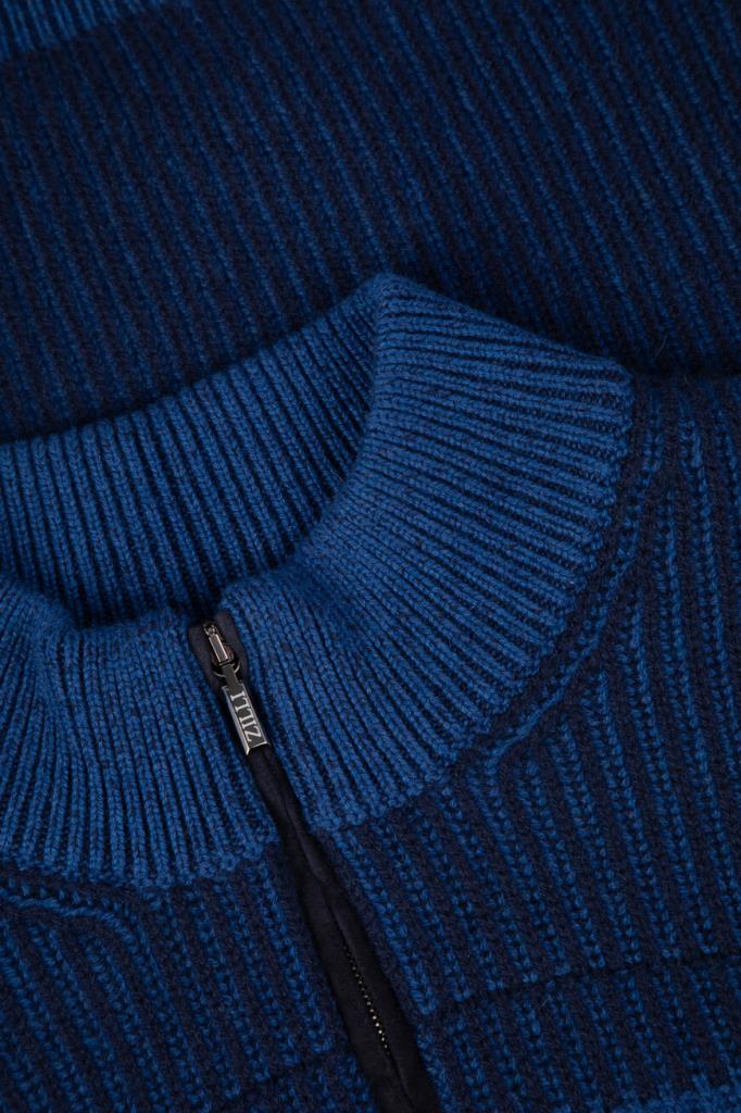 Тёмно-синий свитер Zilli с широкой горизонтальной полосой на груди и рукавах. Фасон изделия, связанного из мягкой шерсти и кашемира фактурной вязкой, предполагает прямой силуэт и застёжку на короткую молнию с брендированным бегунком и замшевой отделкой вдоль планки. Атрибутом Дома является тиснёный логотип на вставке из бархатистой замши, размещённой на спинке под воротником.