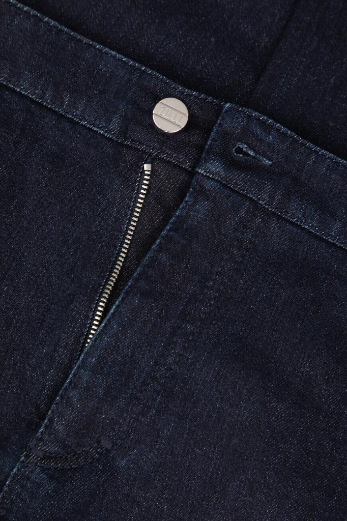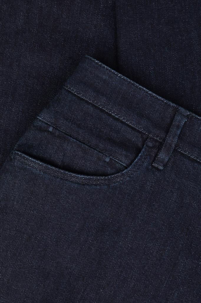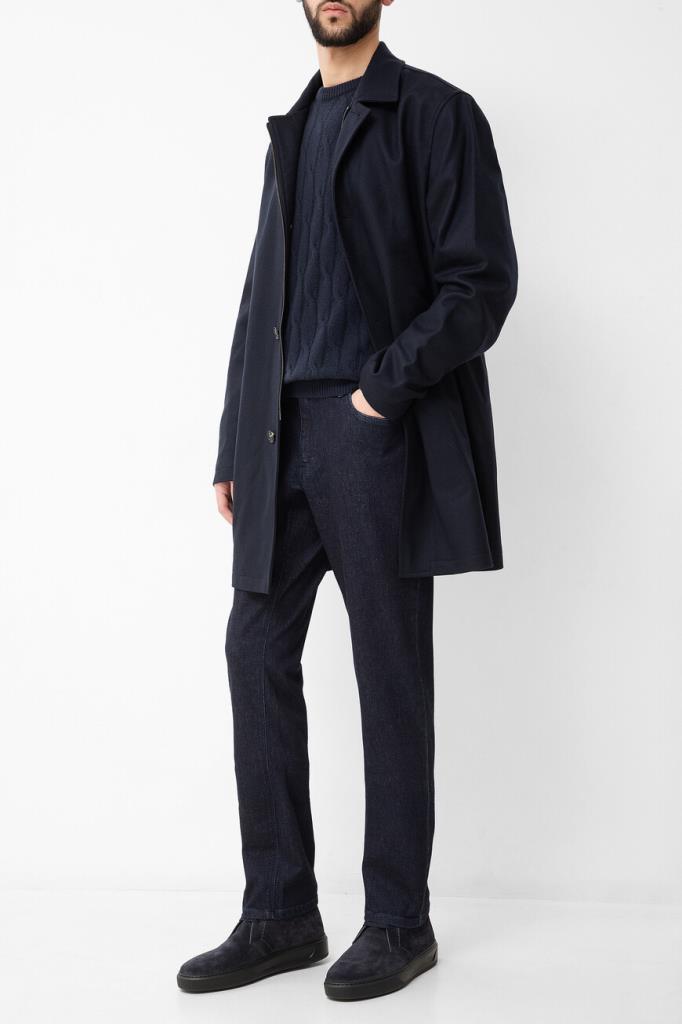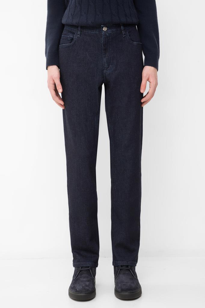 Джинсы Zilli на потайной молнии и брендированной металлической пуговице. Модель изготовлена из мягкого эластичного денима на основе хлопка и кашемира тёмно-синего цвета с эффектом делаве. Отличительными деталями стали синяя прямоугольная накладка из нубука с тиснёными логотипом и узором в полоску на поясе сзади, а также горизонтальная вышивка в виде полос в чёрном и синем тонах на задних карманах.