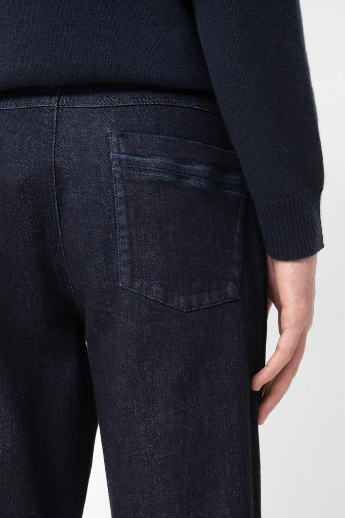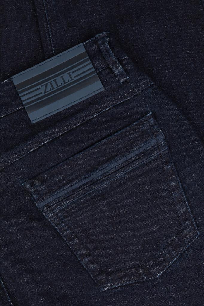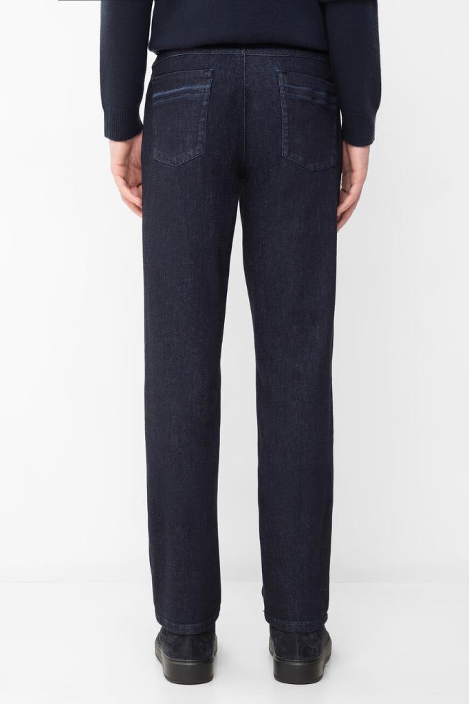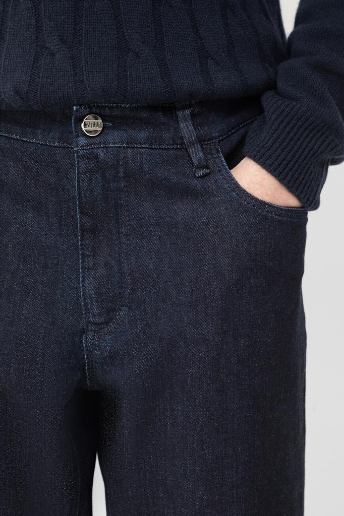 Джинсы Zilli на потайной молнии и брендированной металлической пуговице. Модель изготовлена из мягкого эластичного денима на основе хлопка и кашемира тёмно-синего цвета с эффектом делаве. Отличительными деталями стали синяя прямоугольная накладка из нубука с тиснёными логотипом и узором в полоску на поясе сзади, а также горизонтальная вышивка в виде полос в чёрном и синем тонах на задних карманах.