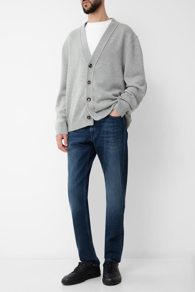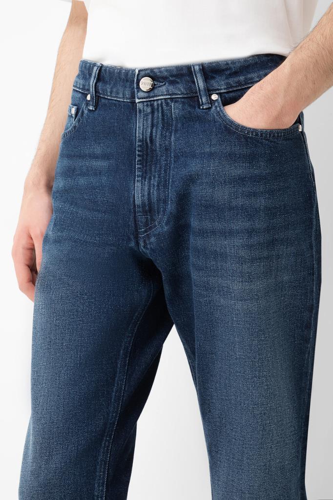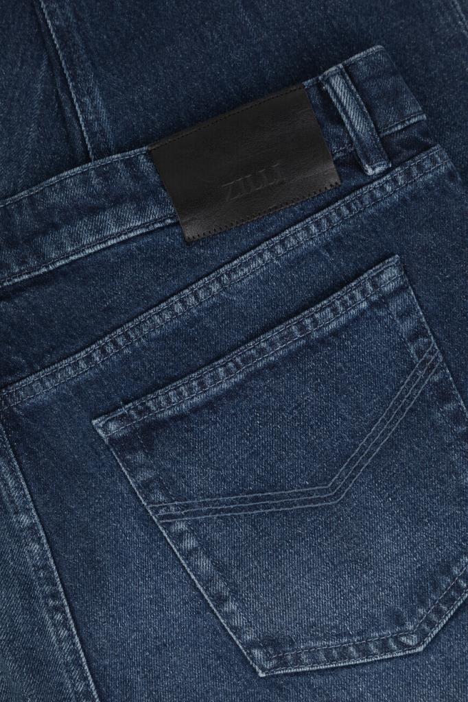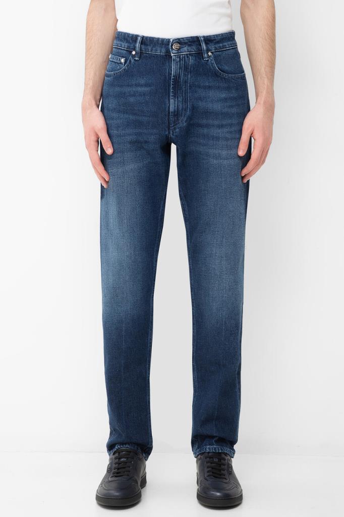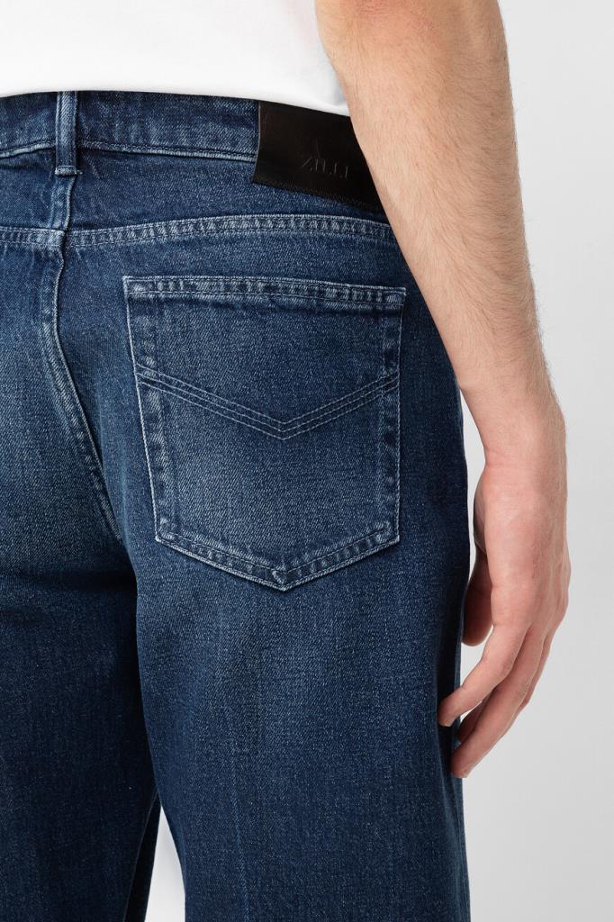 Хлопковые джинсы синего цвета от Zilli. Для пошива модели прямого силуэта выбран мягкий деним с добавлением эластичных волокон. Изделие отличается дизайнерскими потёртостями, кожаным патчем с тиснёным логотипом Дома на поясе сзади и тройной строчкой-вышивкой в тон на задних карманах. Джинсы с завышенной линией талии станут удачной инвестицией в повседневный гардероб.