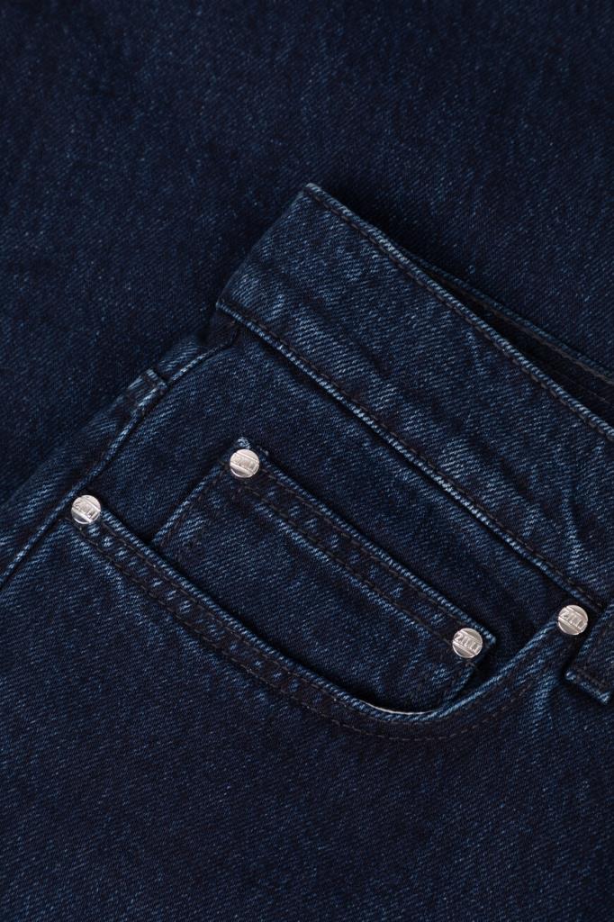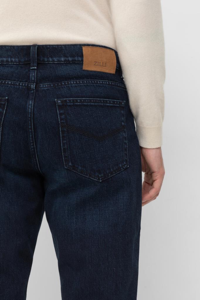 Джинсы из мягкого хлопкового денима от Zilli. Повседневная модель выполнена в тёмно-синем цвете с эффектом делаве и пятью карманами. На поясе сзади расположена коричневая накладка с тиснёным логотипом Дома, а задние карманы декорированы тройной дизайнерской строчкой-вышивкой в тон.