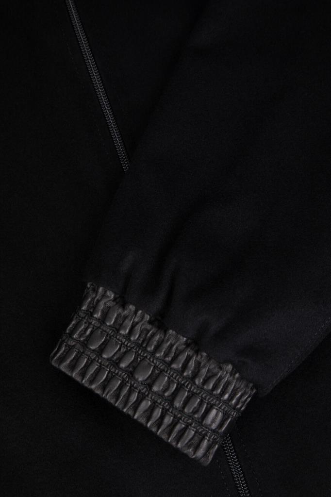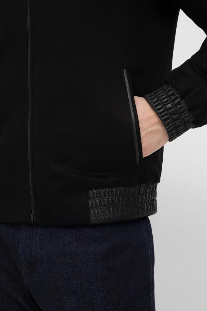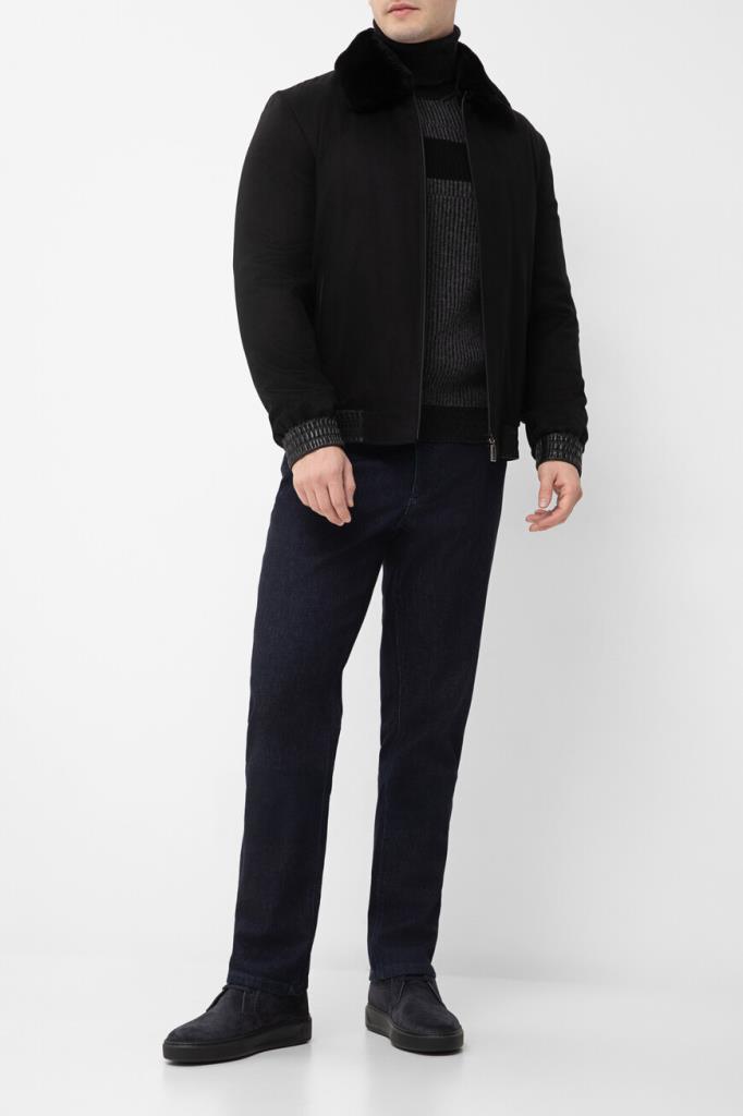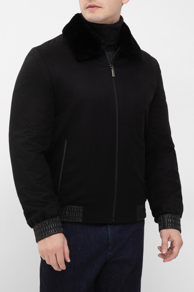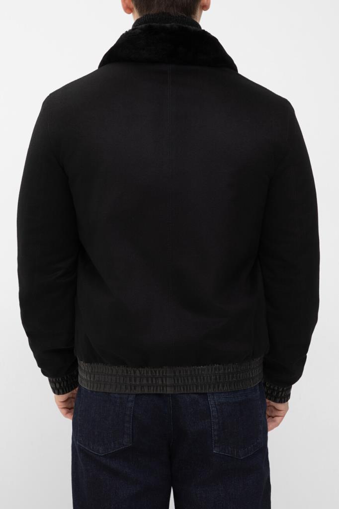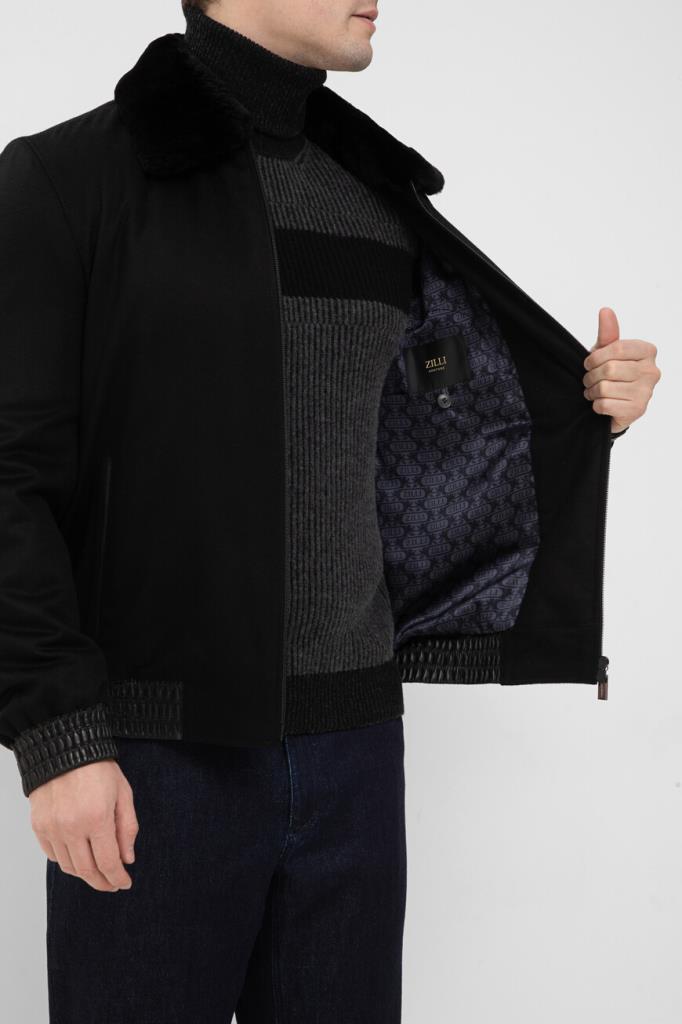 Комбинированная куртка чёрного цвета от ZILLI. Основа изделия выполнена из мягкого кашемира, широкий эластичный пояс и манжеты-резинки для комфортной посадки изготовлены из овчины и оформлены резинкой, а для изготовления отложного воротника используется натуральный мех бобра. Принадлежность модели прямого силуэта Дому обозначена гравировкой на серебристом металлическом бегунке и брендированием на серой шелковой подкладке.