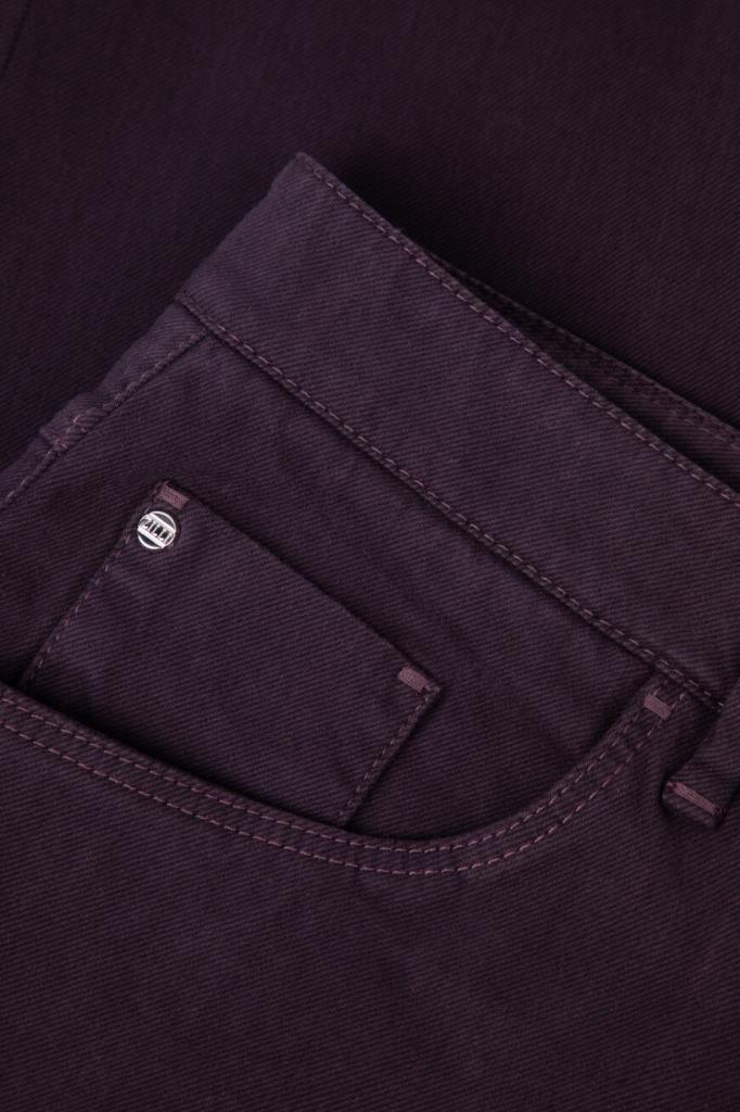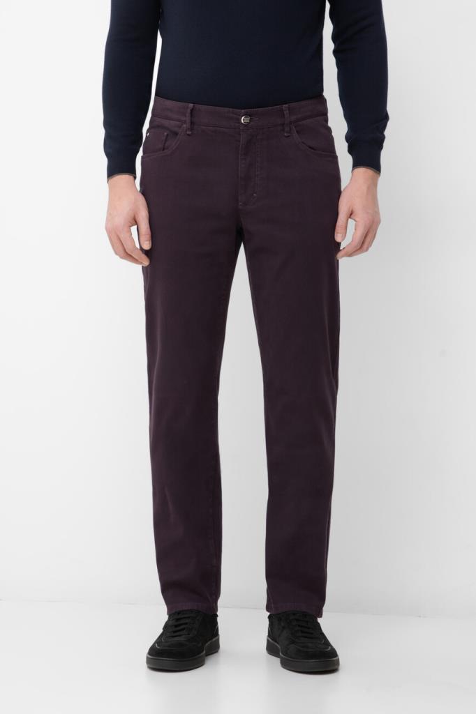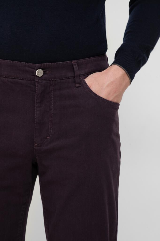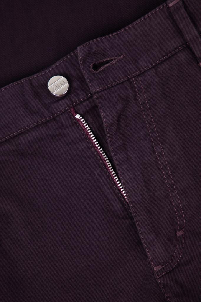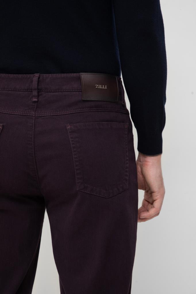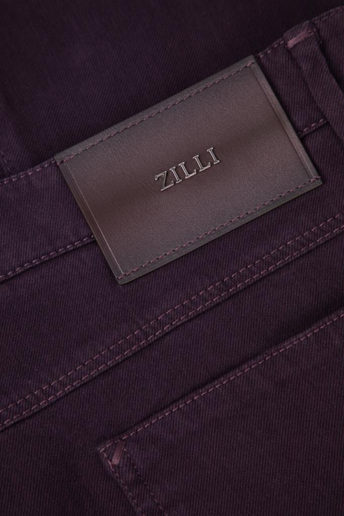 Зауженные джинсы Zilli с минималистичным декором. Изделие сшито из эластичного хлопкового денима баклажанового оттенка. Фасон повседневной модели предполагает пять карманов и застёжку на потайную молнию и брендированную металлическую пуговицу с планкой. Отличительной деталью является кожаная накладка с серебристой надписью-логотипом, размещенная на поясе сзади.