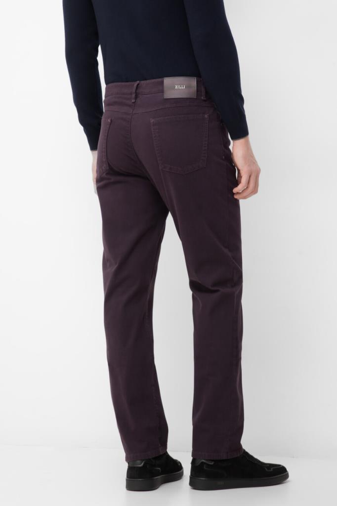 Зауженные джинсы Zilli с минималистичным декором. Изделие сшито из эластичного хлопкового денима баклажанового оттенка. Фасон повседневной модели предполагает пять карманов и застёжку на потайную молнию и брендированную металлическую пуговицу с планкой. Отличительной деталью является кожаная накладка с серебристой надписью-логотипом, размещенная на поясе сзади.
