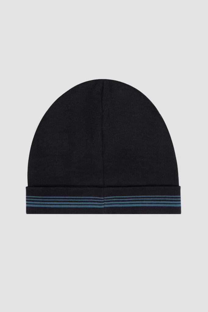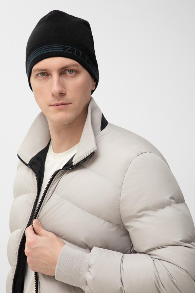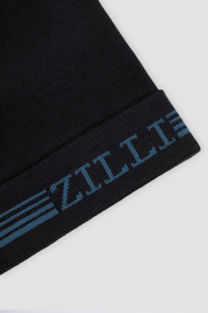 Шапка бини от Zilli связана лицевой гладью. Аксессуар выполнен из полушерстяной пряжи чёрного цвета с добавлением шёлка и кашемира. Широкий эластичный отворот декорирован геометрическим мотивом Four Stripes и крупным логотипом Дома голубого оттенка в технике интарсия.