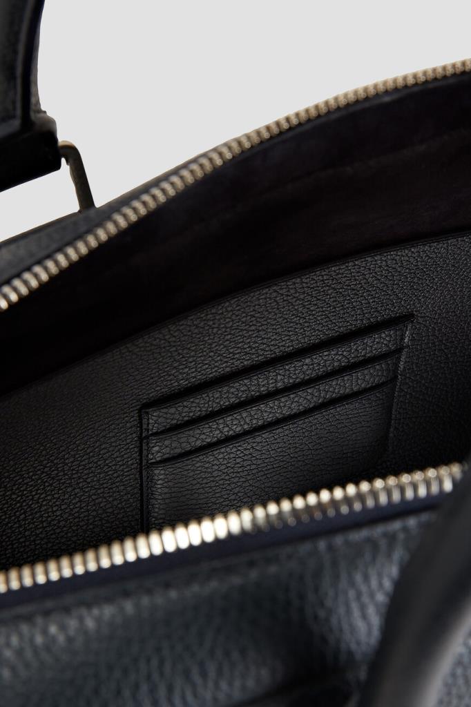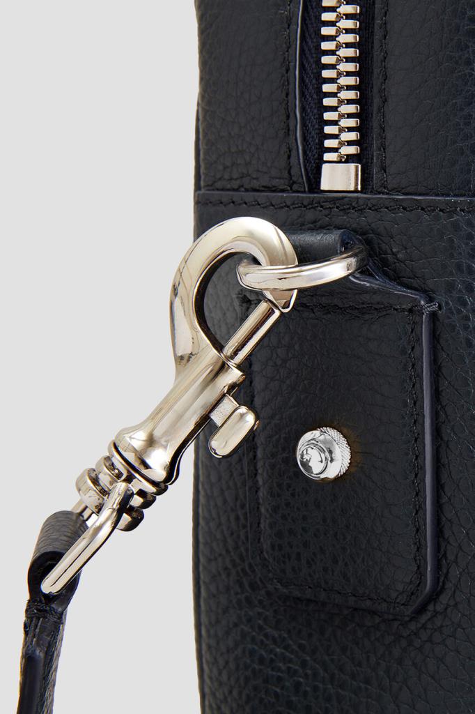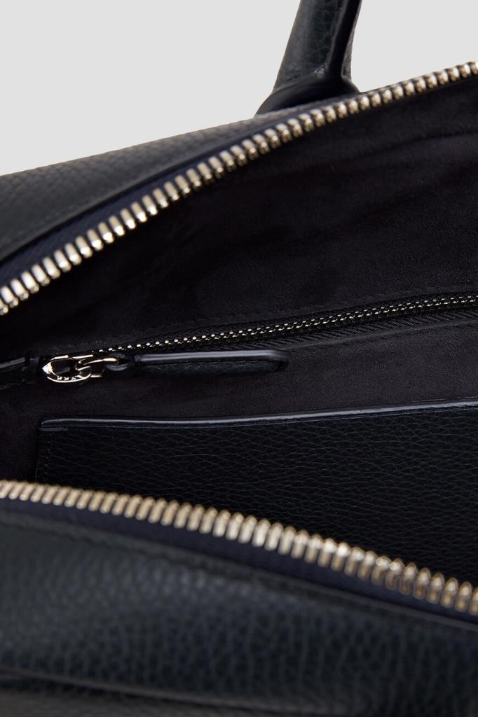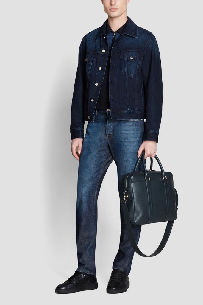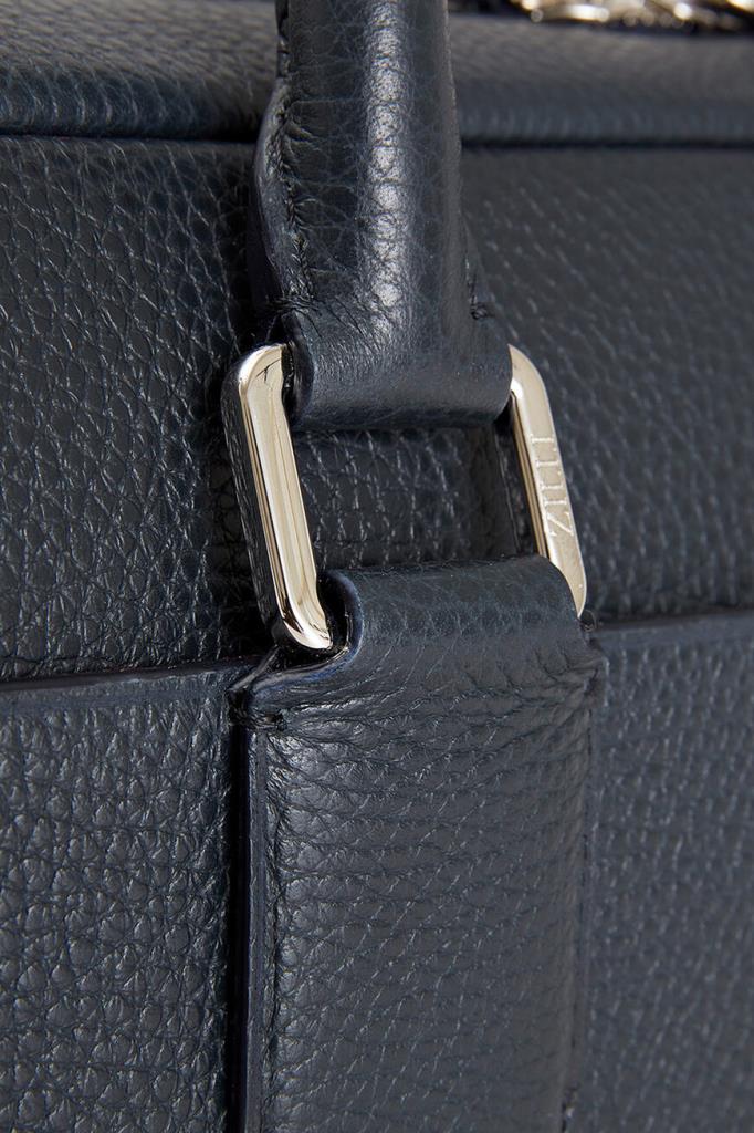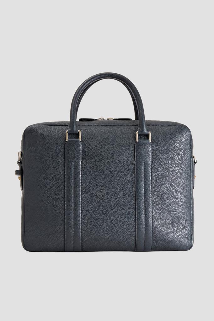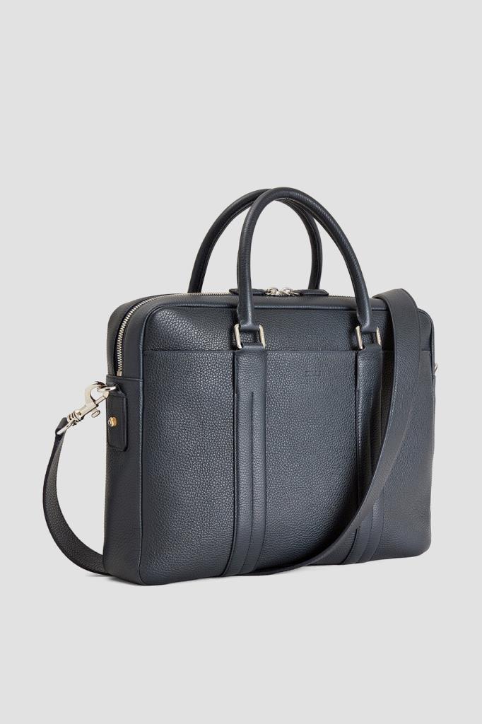 Тёмно-синий портфель Zilli с тиснёным логотипом спереди. Для изготовления прямоугольной модели выбрана мягкая телячья кожа с зернистой текстурой. Короткие округлые ручки сверху и плечевой ремень с серебристыми карабинами предполагают несколько вариантов переноски: в руке, на плече или через плечо. Отличительными особенностями аксессуара стали широкие рельефные полосы-продолжение ручек и внутренняя отделка из бархатистой замши в тон.