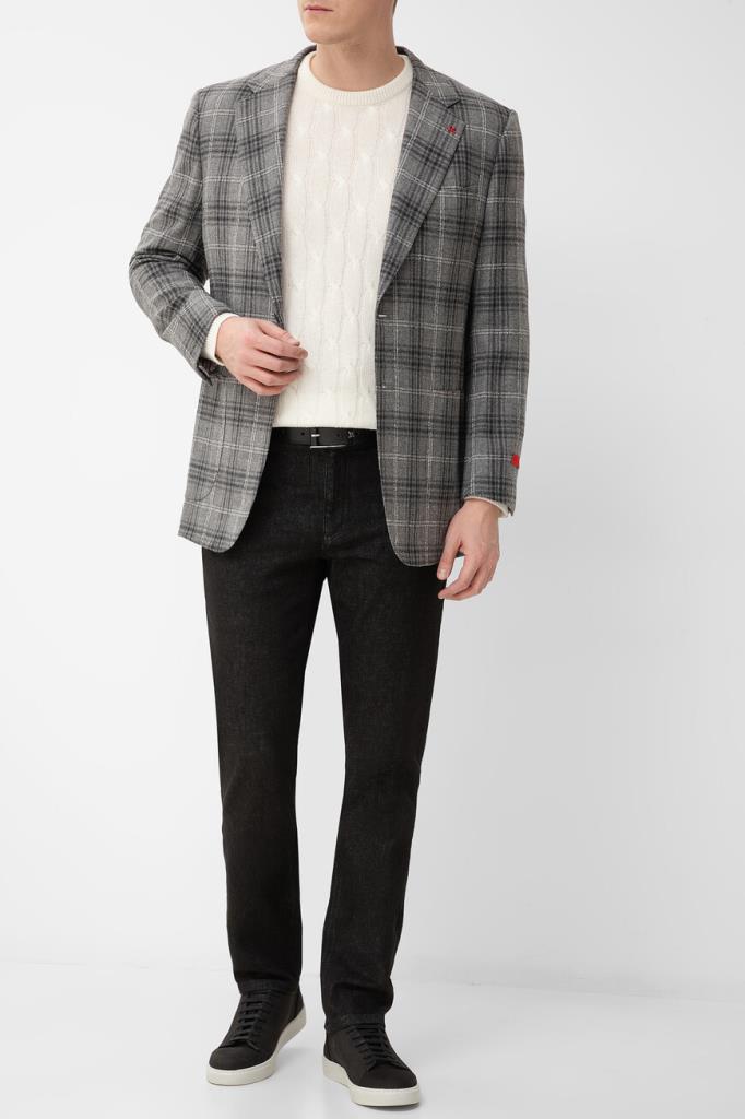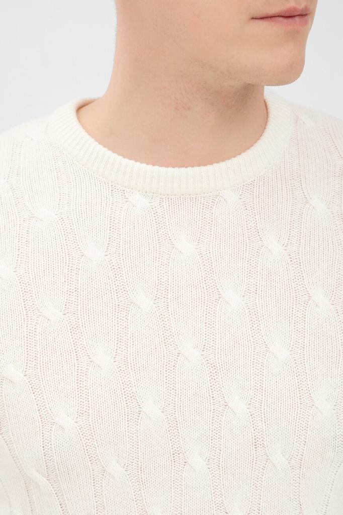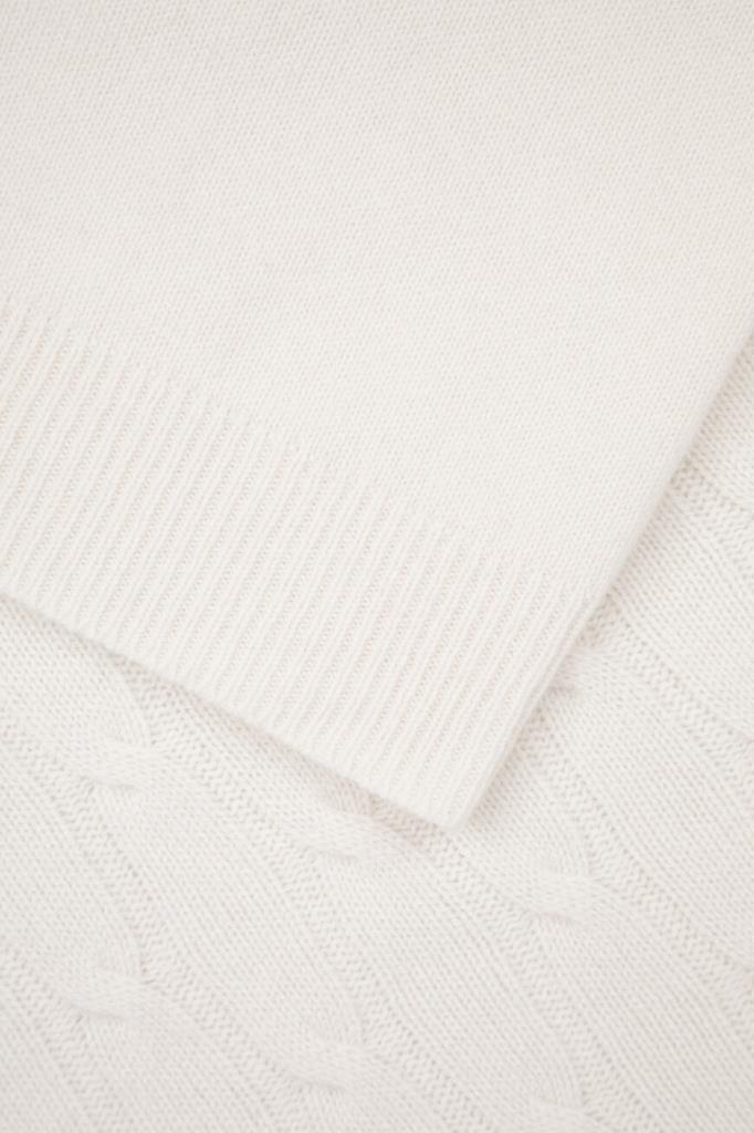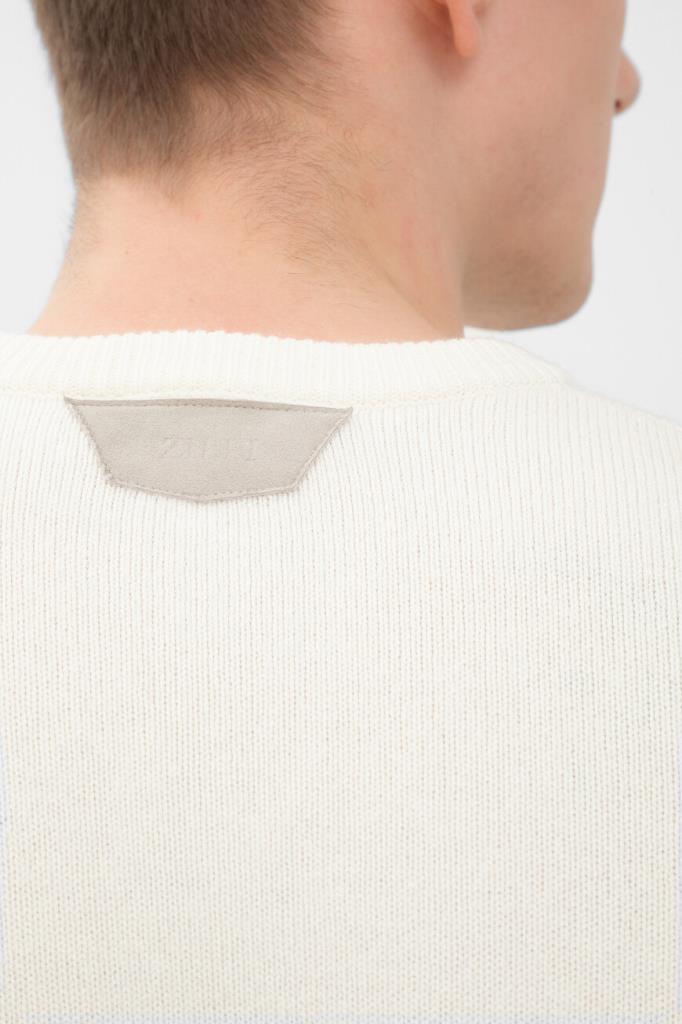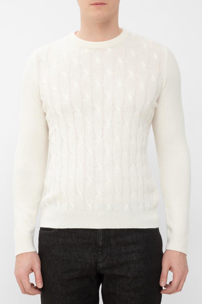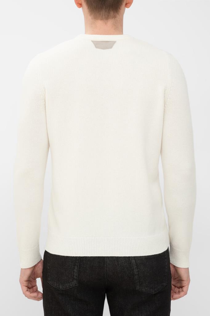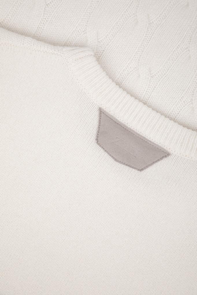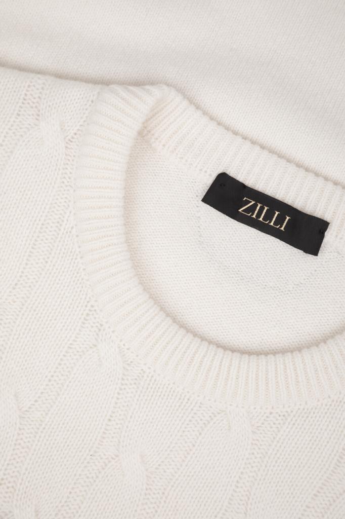 Прилегающий свитер с символикой бренда Zilli. Модель изготовлена из мягкого кашемира белого цвета чулочной вязкой. Декором выступают фактурный геометрический узор «косы» спереди в тон и серая вставка с тиснёным логотипом на спинке под воротником.