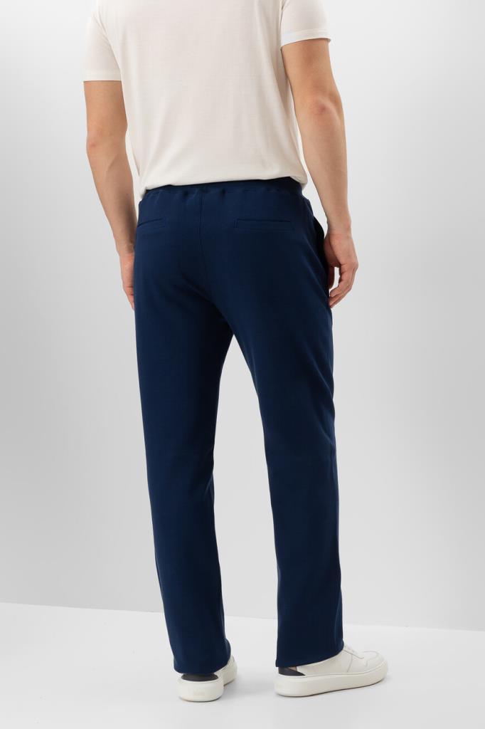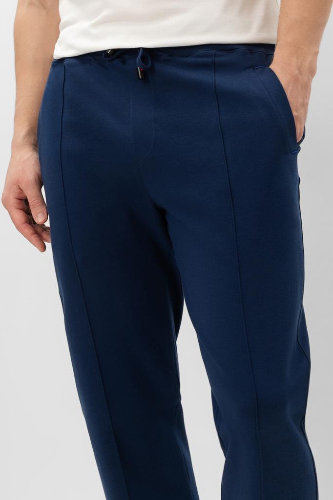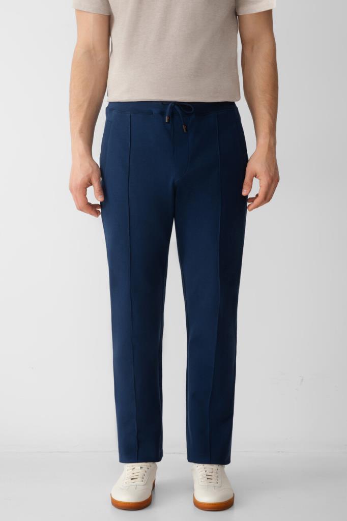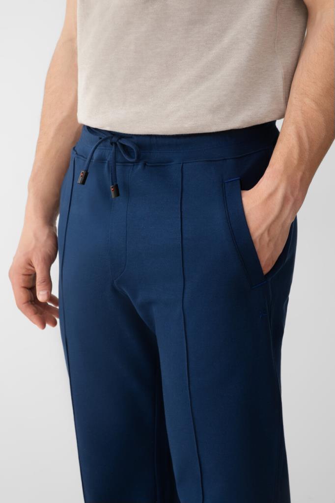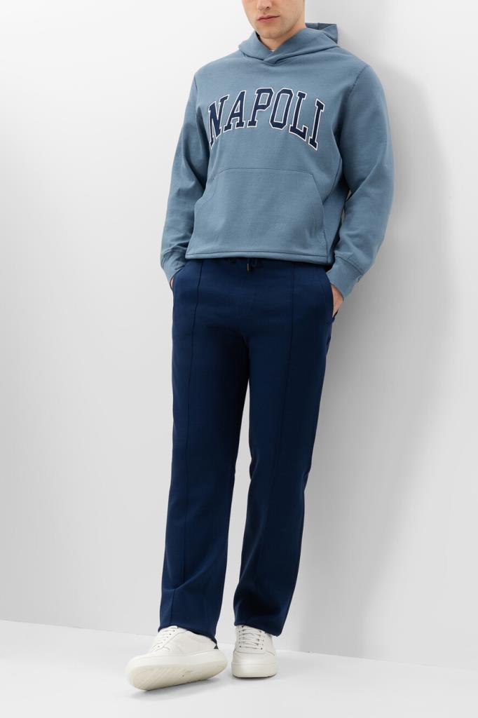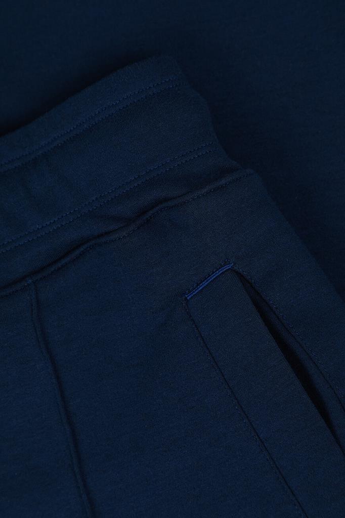 Брюки с широким эластичным поясом-кулиской от Isaia. Изделие выполнено из мягкого трикотажа на основе хлопка и прочного нейлона синего цвета. Особенностями спортивной модели стали прошитые стрелки спереди и наличие четырёх прорезных карманов. Брюки можно сочетать с курткой с отложным воротником из той же коллекции.