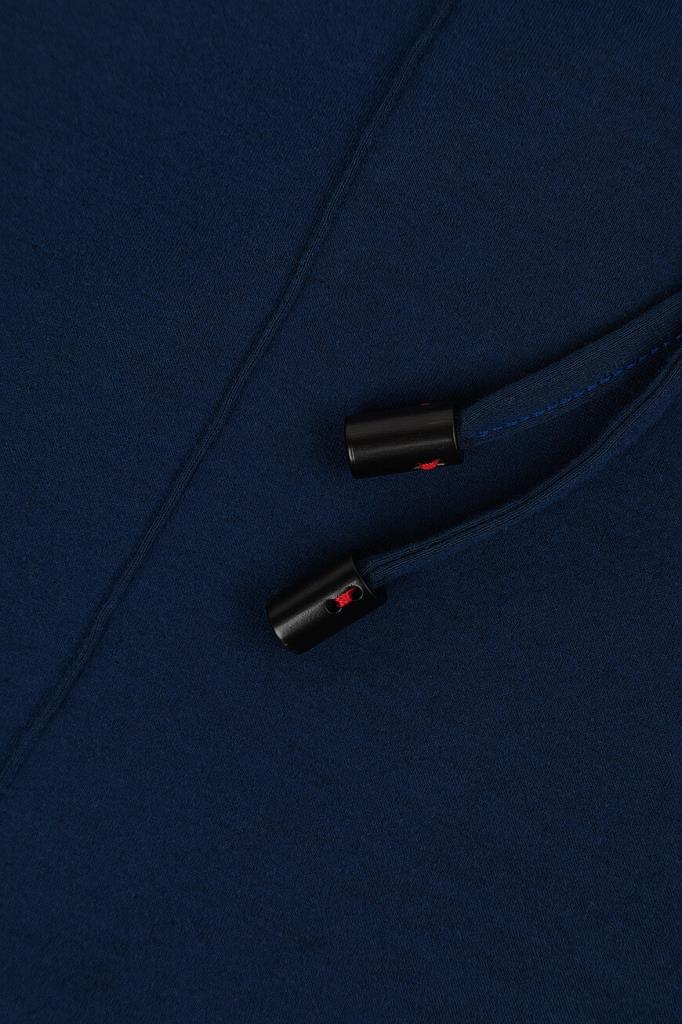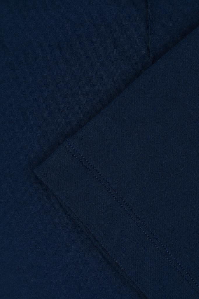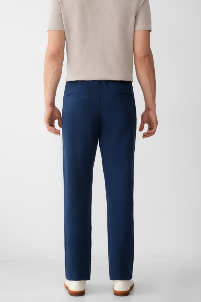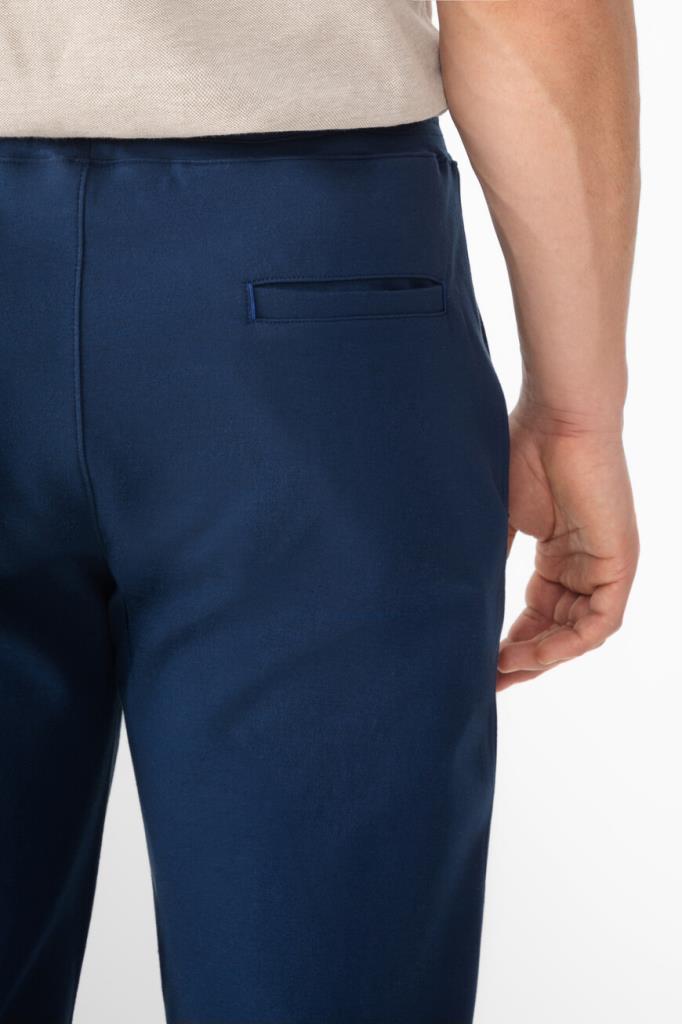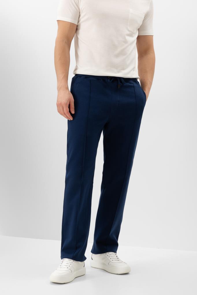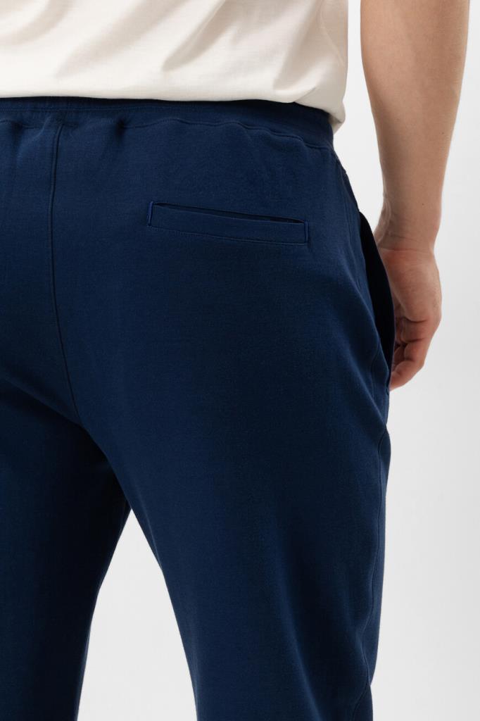 Брюки с широким эластичным поясом-кулиской от Isaia. Изделие выполнено из мягкого трикотажа на основе хлопка и прочного нейлона синего цвета. Особенностями спортивной модели стали прошитые стрелки спереди и наличие четырёх прорезных карманов. Брюки можно сочетать с курткой с отложным воротником из той же коллекции.