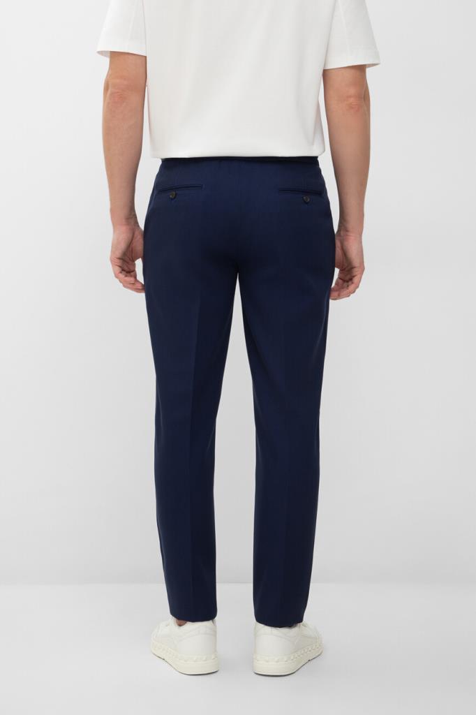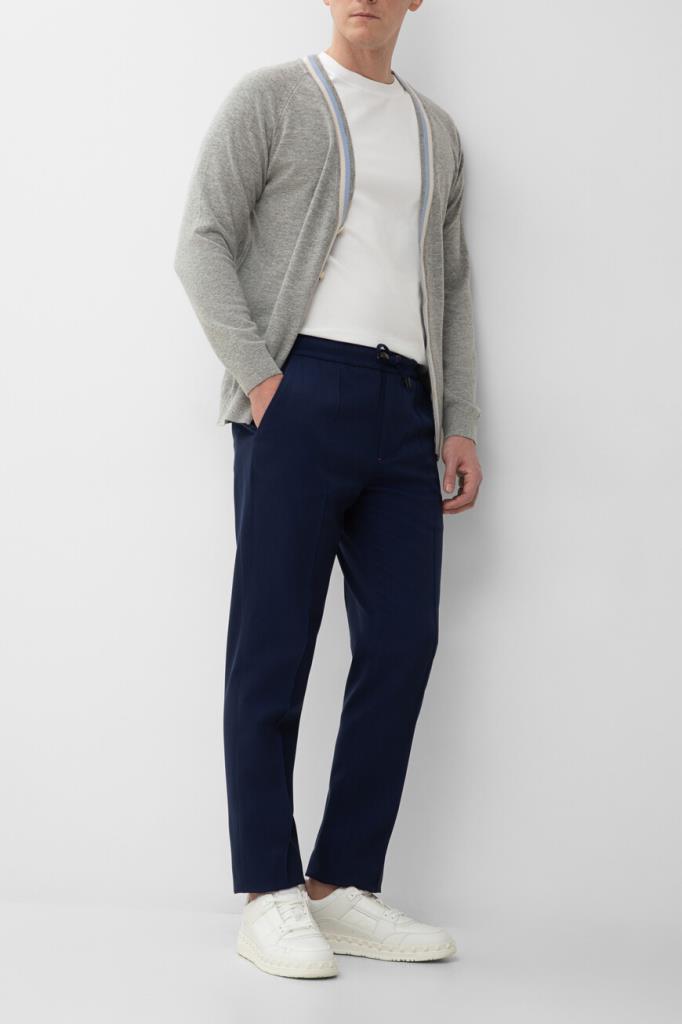 Спортивные брюки Isaia с диагональным саржевым переплетением. Изделие выполнено из хлопка и мягкой шерсти насыщенного синего цвета. Фасон модели прямого силуэта характеризуется наличием широкого эластичного пояса-кулиски для оптимальной посадки и четырёх прорезных карманов: с диагональным входом по бокам и двух на роговой пуговице сзади. Декором выступает вышитая знаковая символика Дома - коралловая ветвь за левым передним карманом.