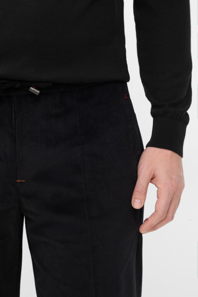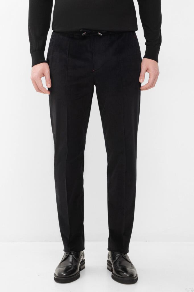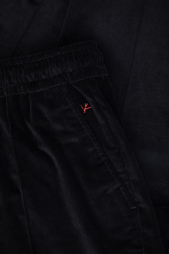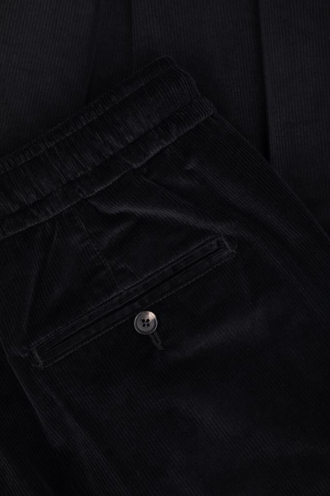 Вельветовые брюки Isaia с четырьмя прорезными карманами. Модель изготовлена на основе хлопка стрейч и мягкой шерсти чёрного цвета с бархатистой текстурой. Фасон изделия предполагает прямой силуэт и отутюженные складки. Оптимальную посадку брюк по линии талии обеспечивает широкий эластичный пояс-кулиска. Декором выступает вышитая знаковая символика Дома - ярко-красная коралловая ветвь.