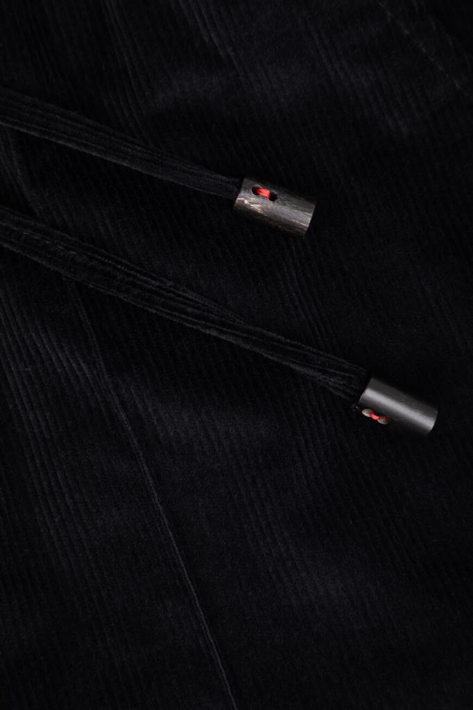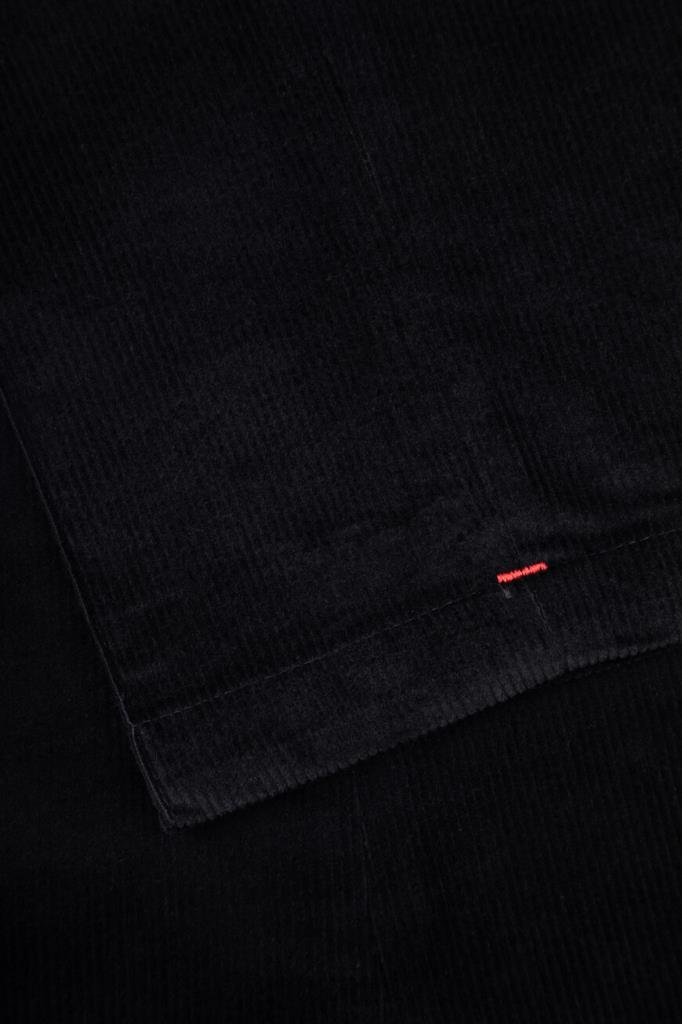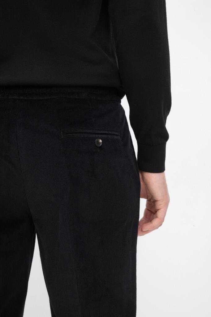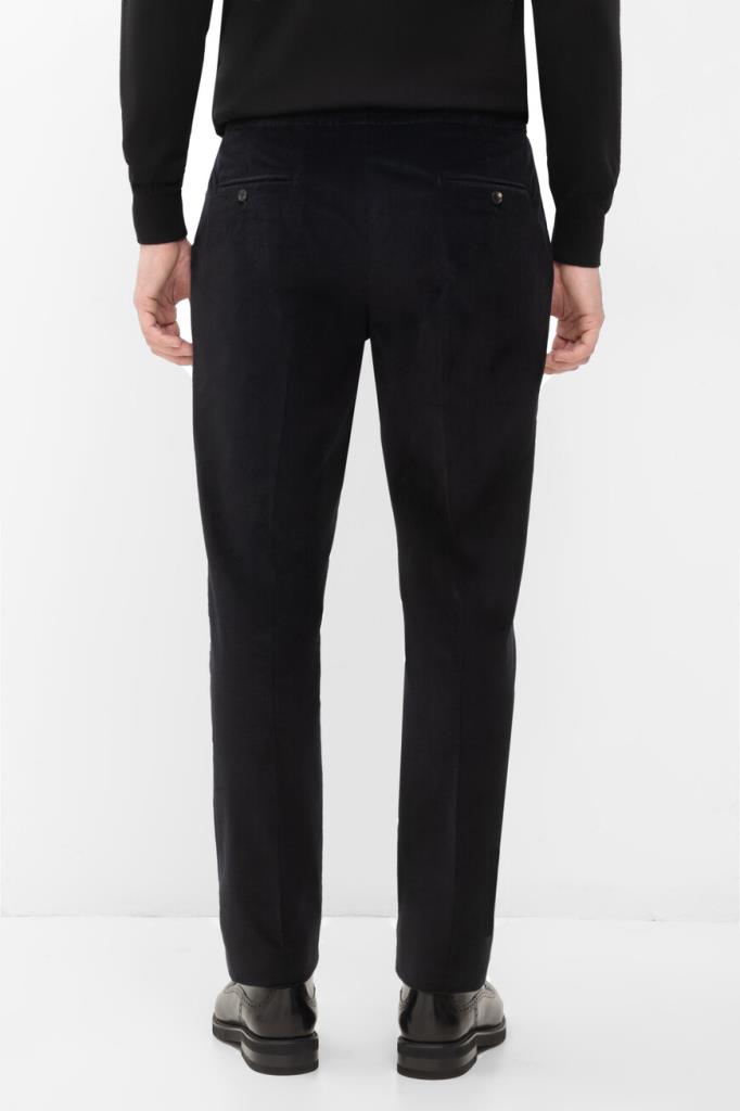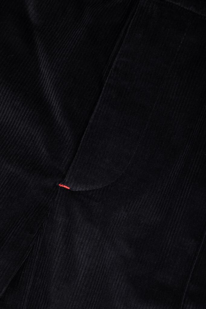 Вельветовые брюки Isaia с четырьмя прорезными карманами. Модель изготовлена на основе хлопка стрейч и мягкой шерсти чёрного цвета с бархатистой текстурой. Фасон изделия предполагает прямой силуэт и отутюженные складки. Оптимальную посадку брюк по линии талии обеспечивает широкий эластичный пояс-кулиска. Декором выступает вышитая знаковая символика Дома - ярко-красная коралловая ветвь.
