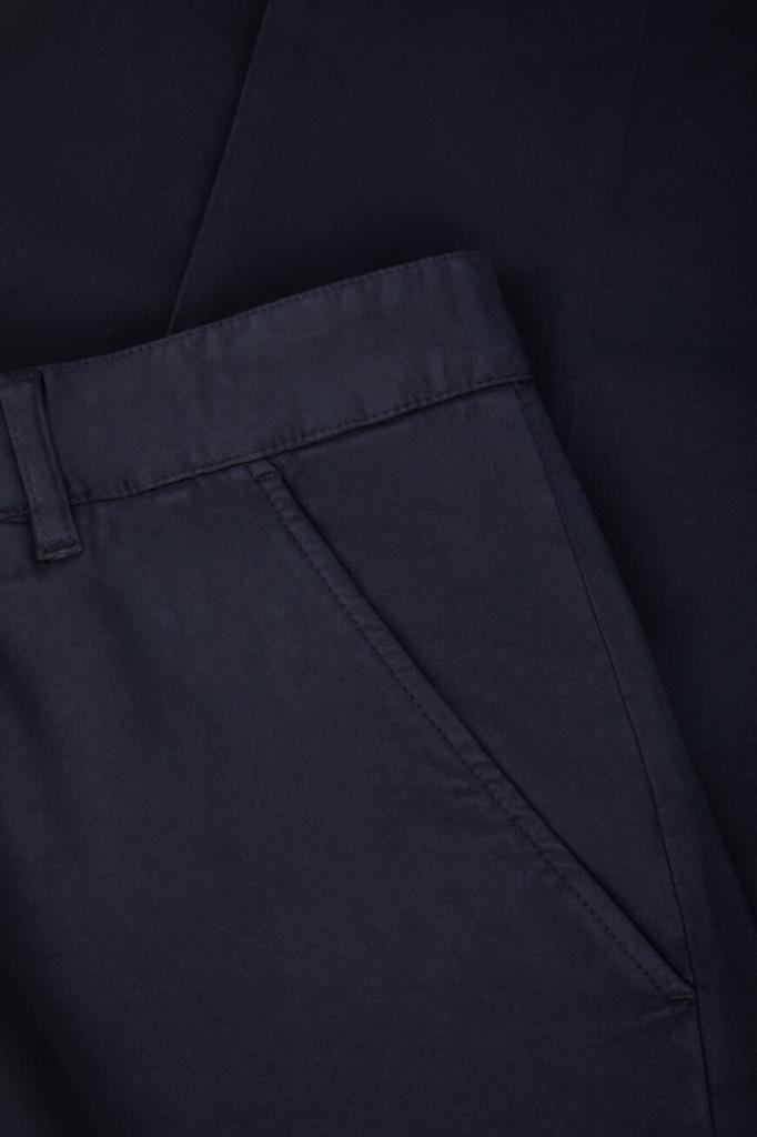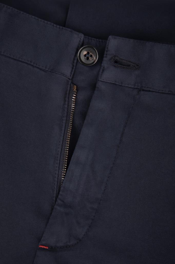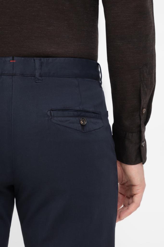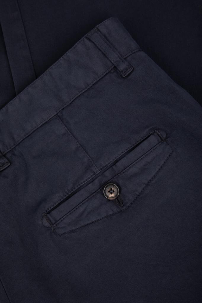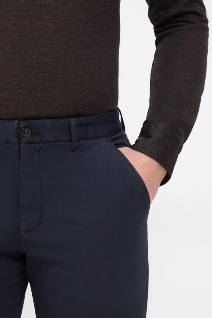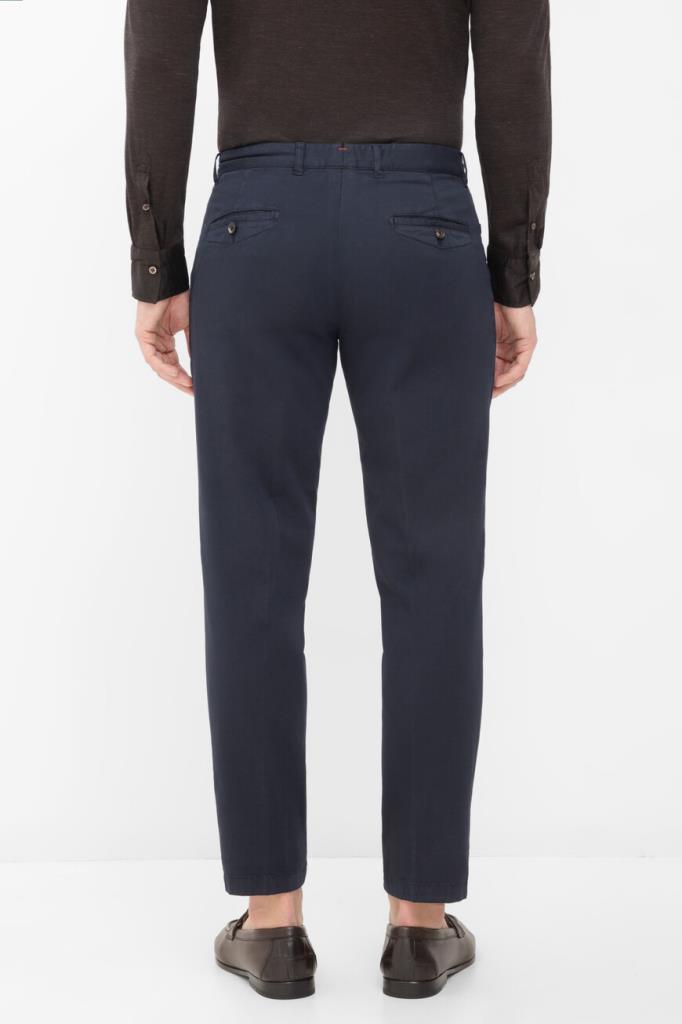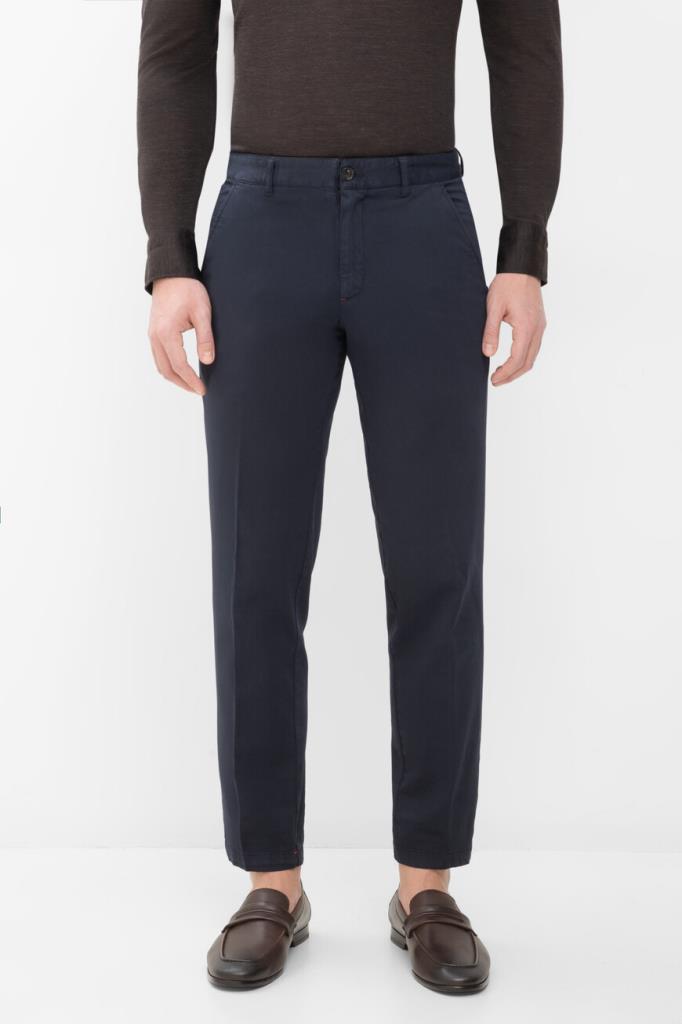 Брюки на потайной молнии и роговой пуговице с планкой от Isaia. Модель изготовлена из мягкого трикотажа на основе хлопка стрейч и кашемира тёмно-синего цвета. Фасон изделия предполагает прямой силуэт с классическими стрелками и наличие четырёх карманов: двух прорезных по бокам и прорезных с клапанами на крупной пуговице сзади.