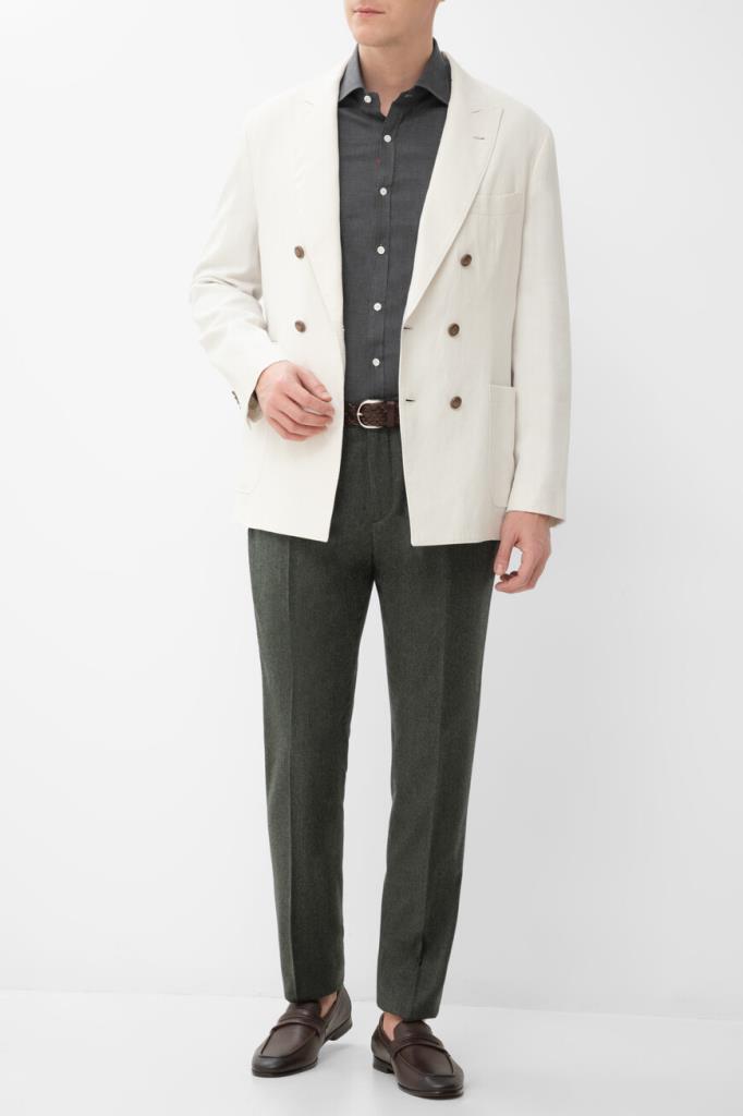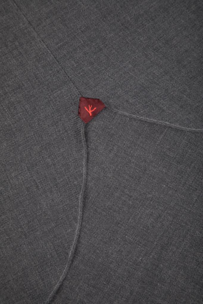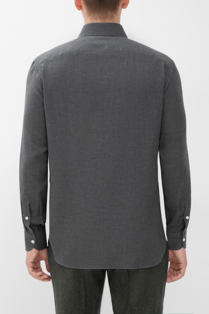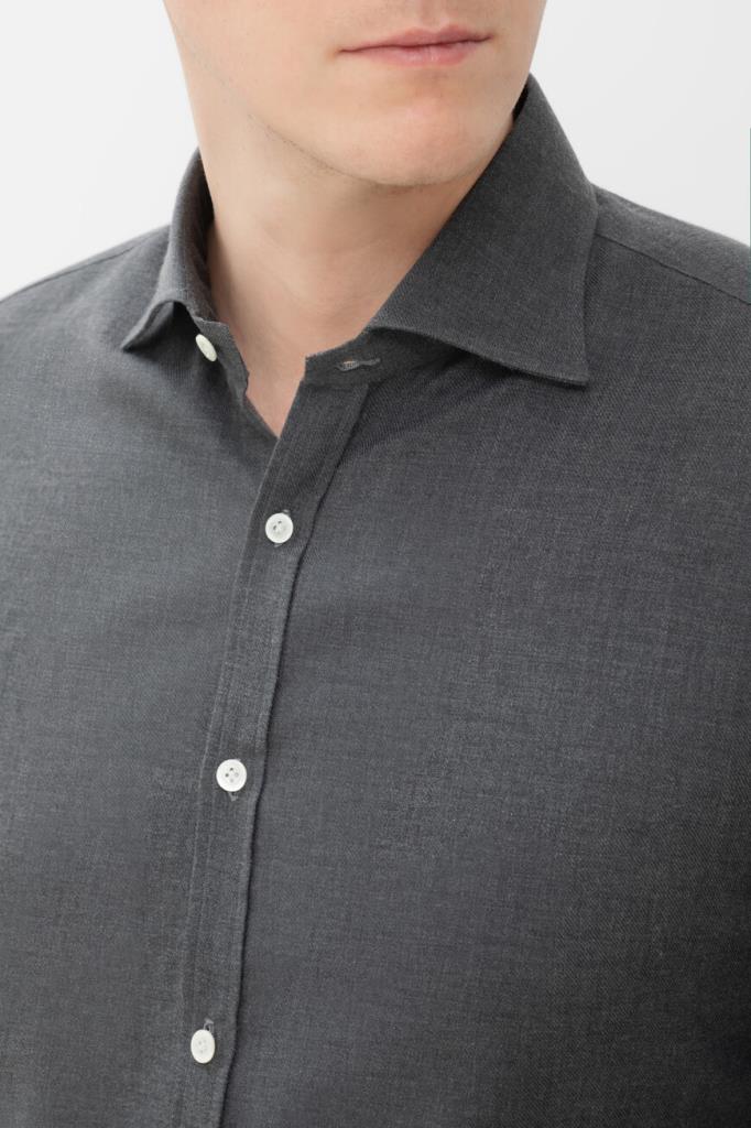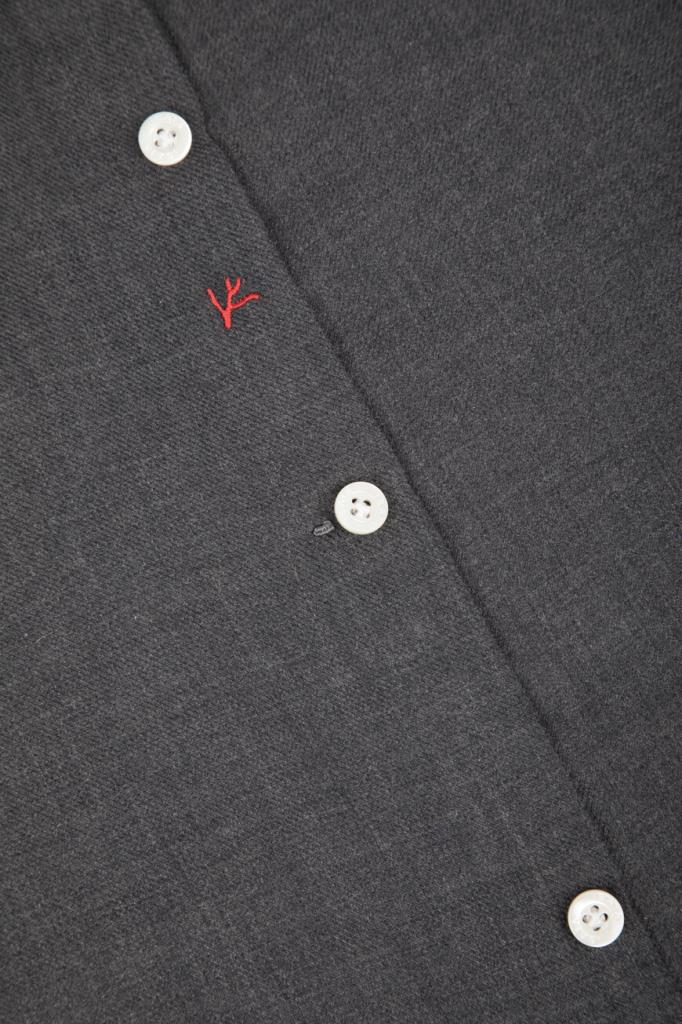 Трикотажная рубашка Isaia с длинным рукавом. Изделие полуприлегающего силуэта выполнено на основе хлопка и кашемира тёмно-серого цвета. Конструкция повседневной модели предполагает застёжку на перламутровые пуговицы с очерченной планкой и наличие неглубоких боковых разрезов с бордовыми вставками и коралловой ветвью.