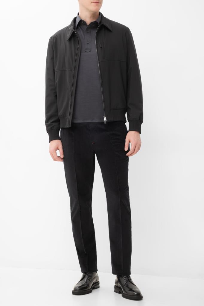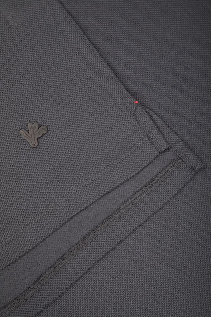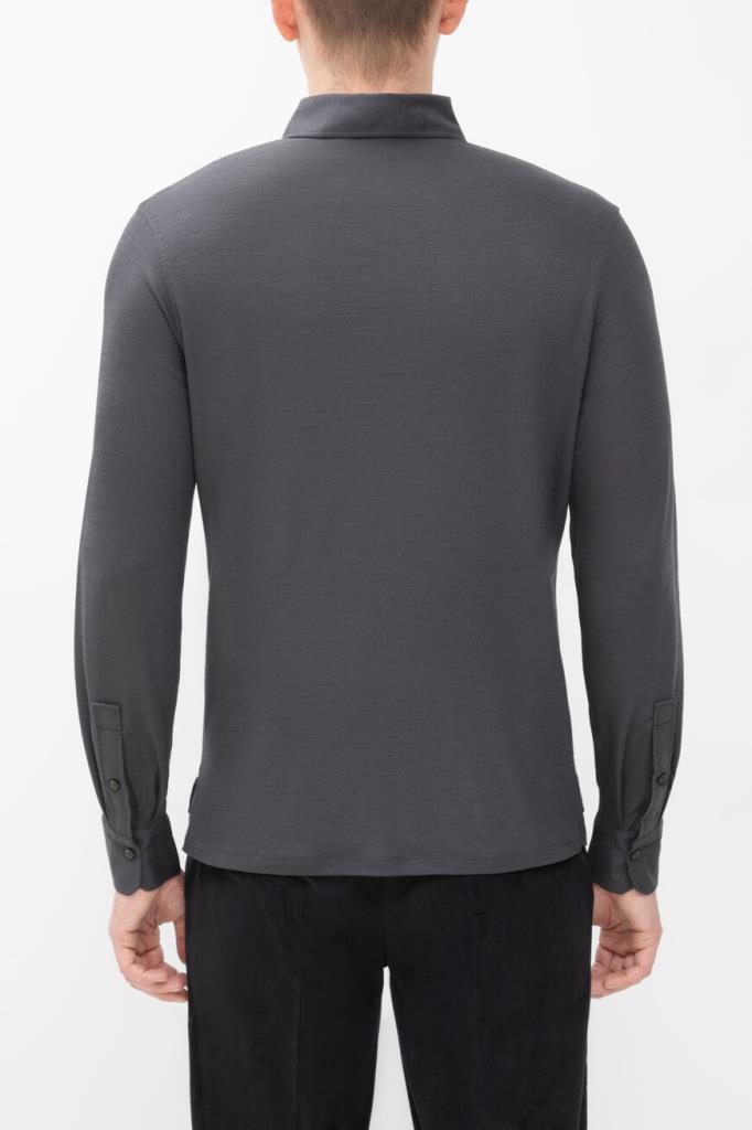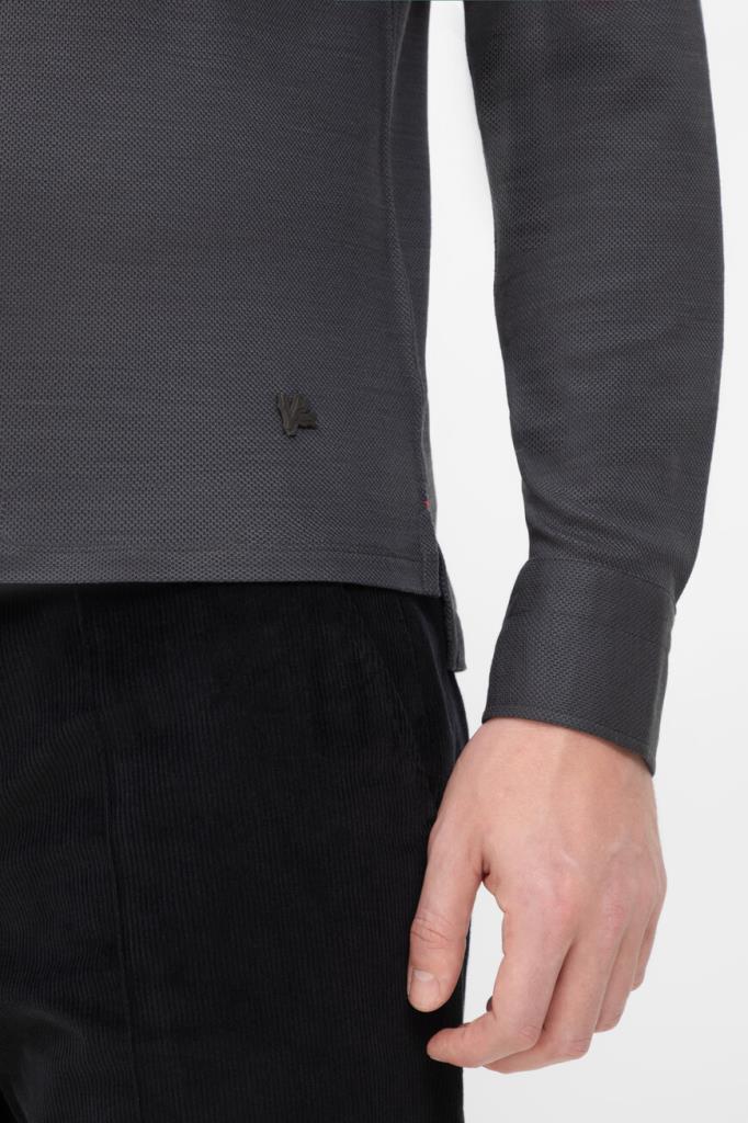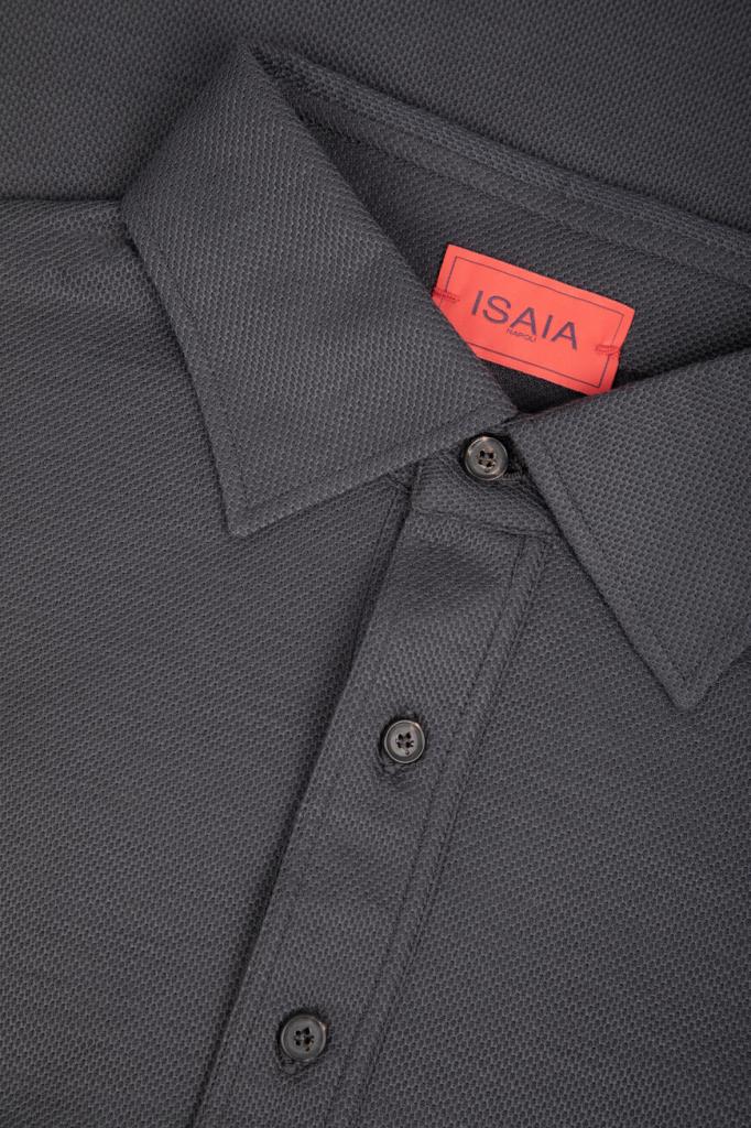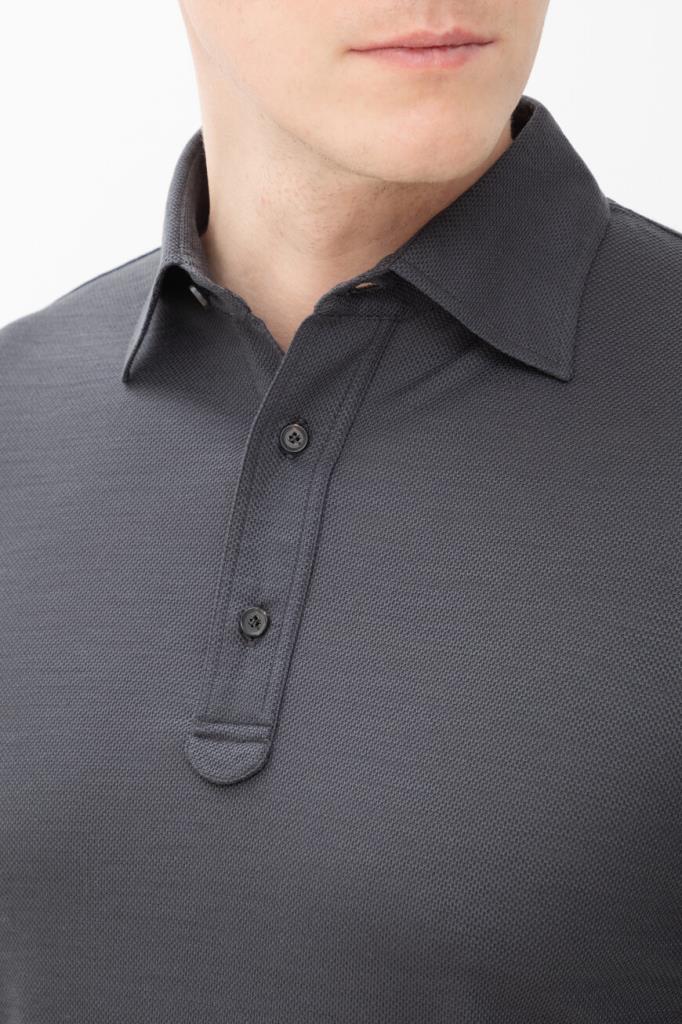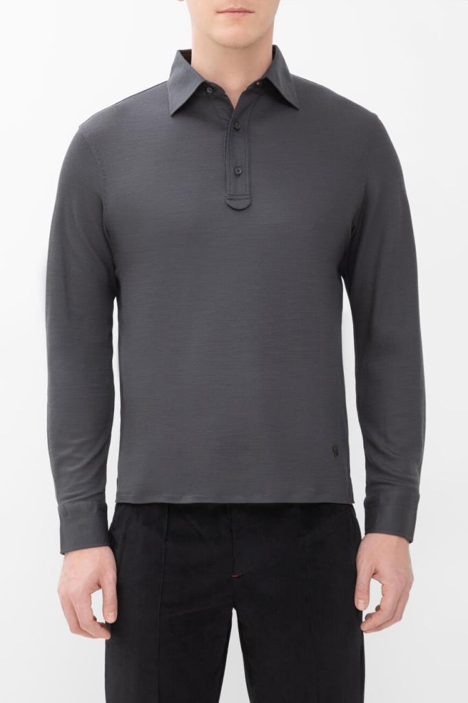 Тёмно-серое поло с застёжкой на три роговые пуговицы сверху от Isaia. Для создания модели прилегающего силуэта выбрана плотная, но тонкая тактильно приятная шерсть. Отличительными деталями являются фактурный сетчатый узор в тон и знаковая символика Дома - кожаный тёмно-коричневый патч в виде коралловой ветви спереди снизу. Изделие с длинными рукавами станет хорошей альтернативой футболке в холодную погоду.