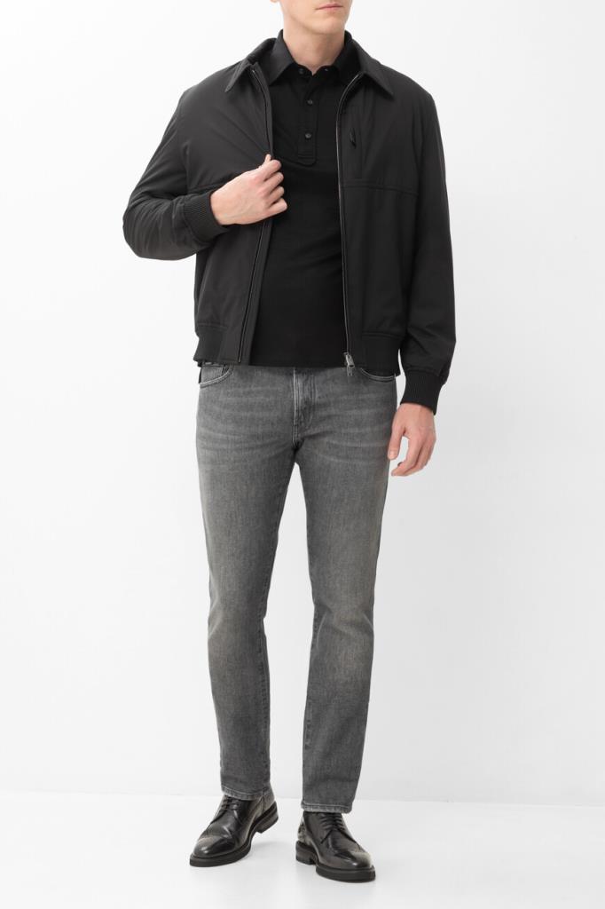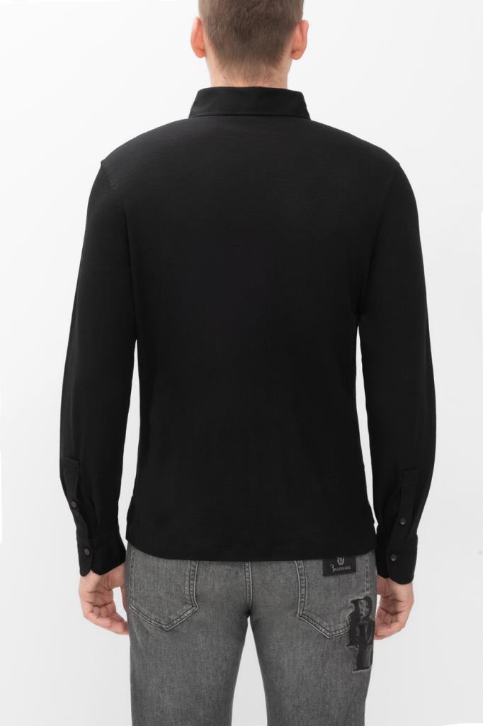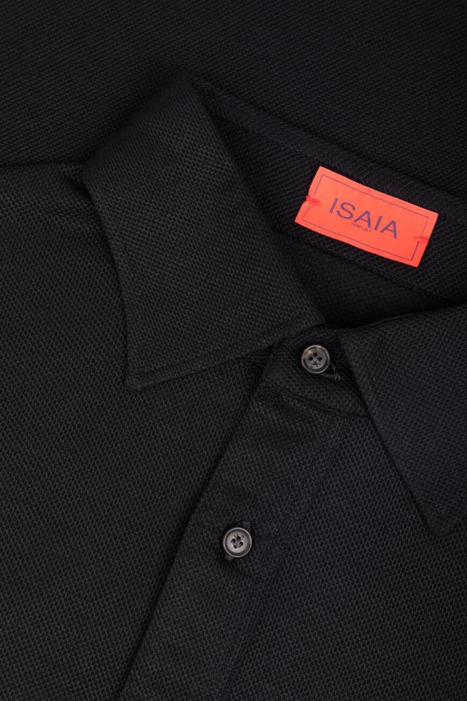 Шерстяное поло прилегающего силуэта от Isaia. Изделие с длинными рукавами, которые делают его похожим на рубашку, окрашено в чёрный базовый оттенок и оснащено застёжкой на три роговые пуговицы сверху. Поверхность модели покрыта сетчатым фактурным узором в тон, а спереди снизу расположена тёмно-коричневая знаковая символика - кожаный патч в виде коралловой ветви.