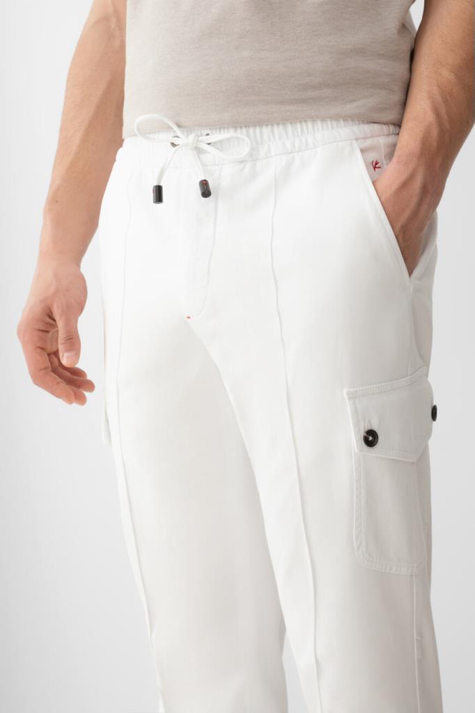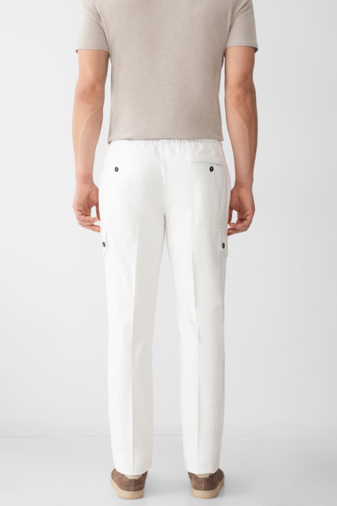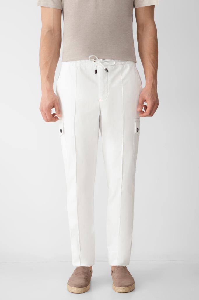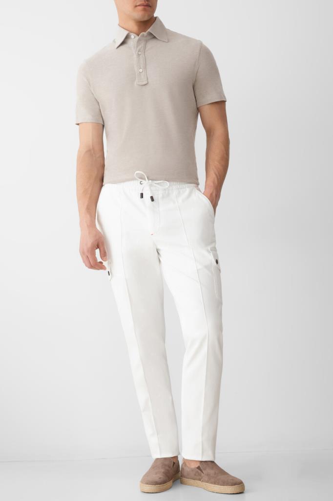 Стрейчевые брюки-карго белого цвета от Isaia. Для пошива изделия прямого силуэта используются мягкий хлопок и кашемир. Оптимальную посадку модели с отутюженными складками по фигуре обеспечивает широкий эластичный пояс-кулиска. Декором выступает знаковая ярко-красная вышивка в виде коралловой ветви за левым карманом спереди. Создайте превосходный комплект с серым поло с очерченной планкой сверху из той же коллекции.