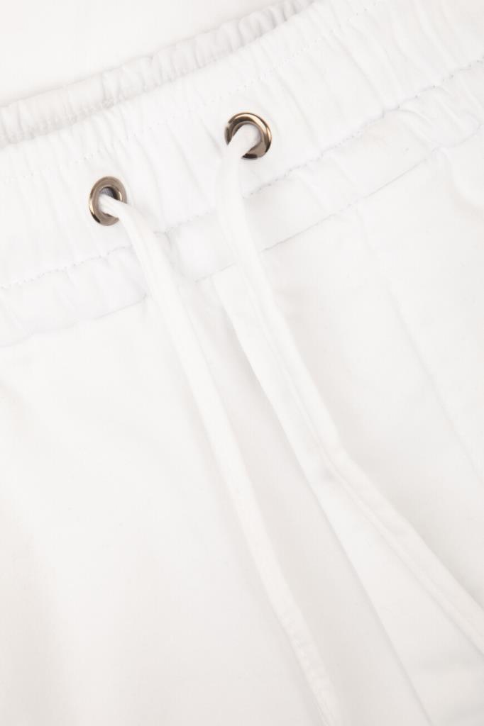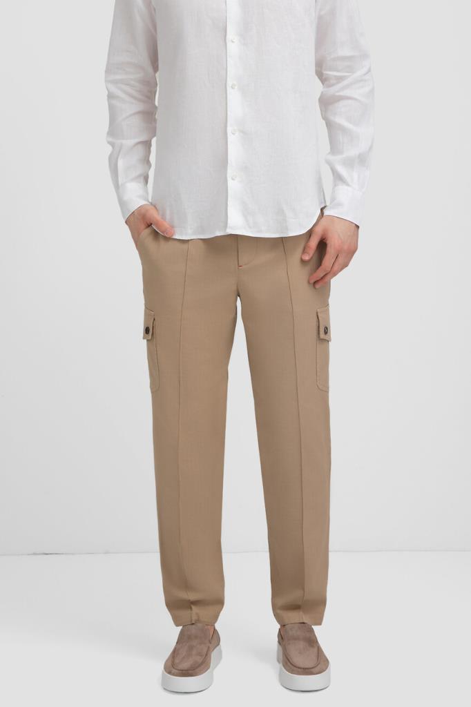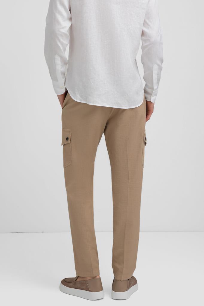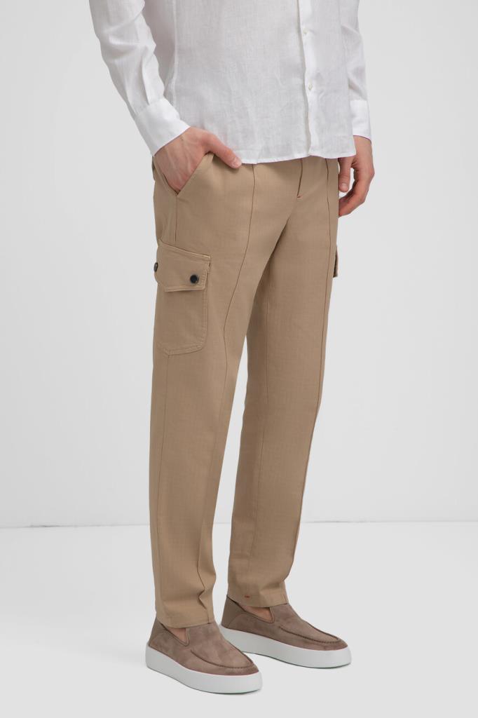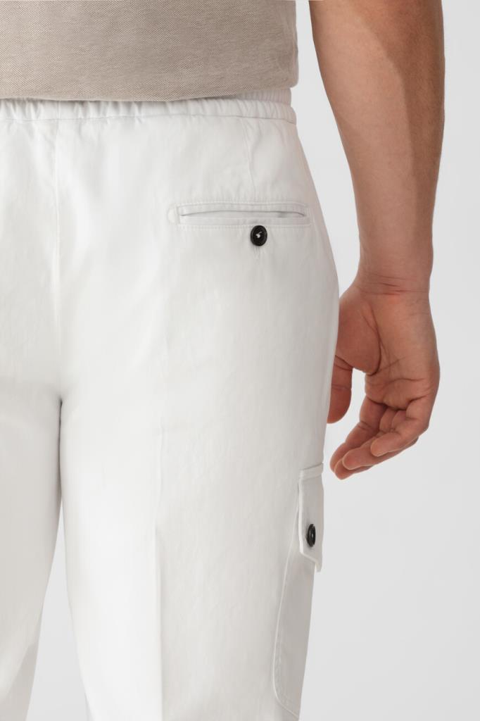 Стрейчевые брюки-карго белого цвета от Isaia. Для пошива изделия прямого силуэта используются мягкий хлопок и кашемир. Оптимальную посадку модели с отутюженными складками по фигуре обеспечивает широкий эластичный пояс-кулиска. Декором выступает знаковая ярко-красная вышивка в виде коралловой ветви за левым карманом спереди. Создайте превосходный комплект с серым поло с очерченной планкой сверху из той же коллекции.