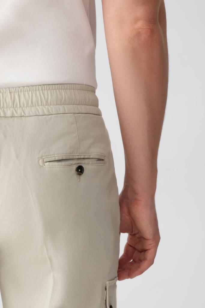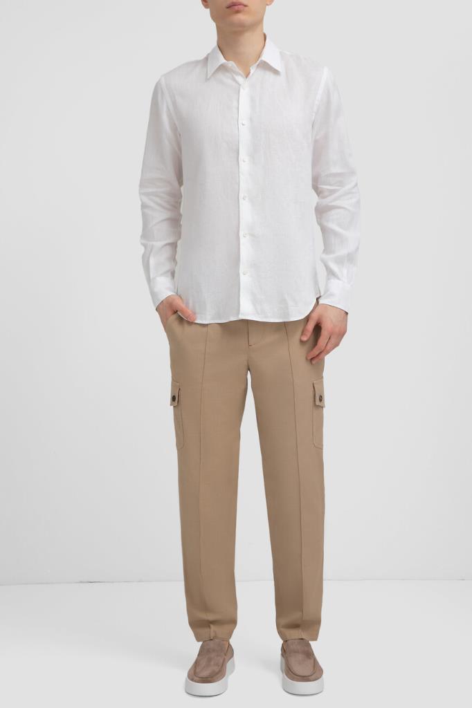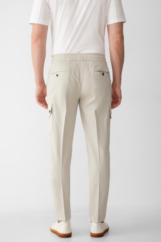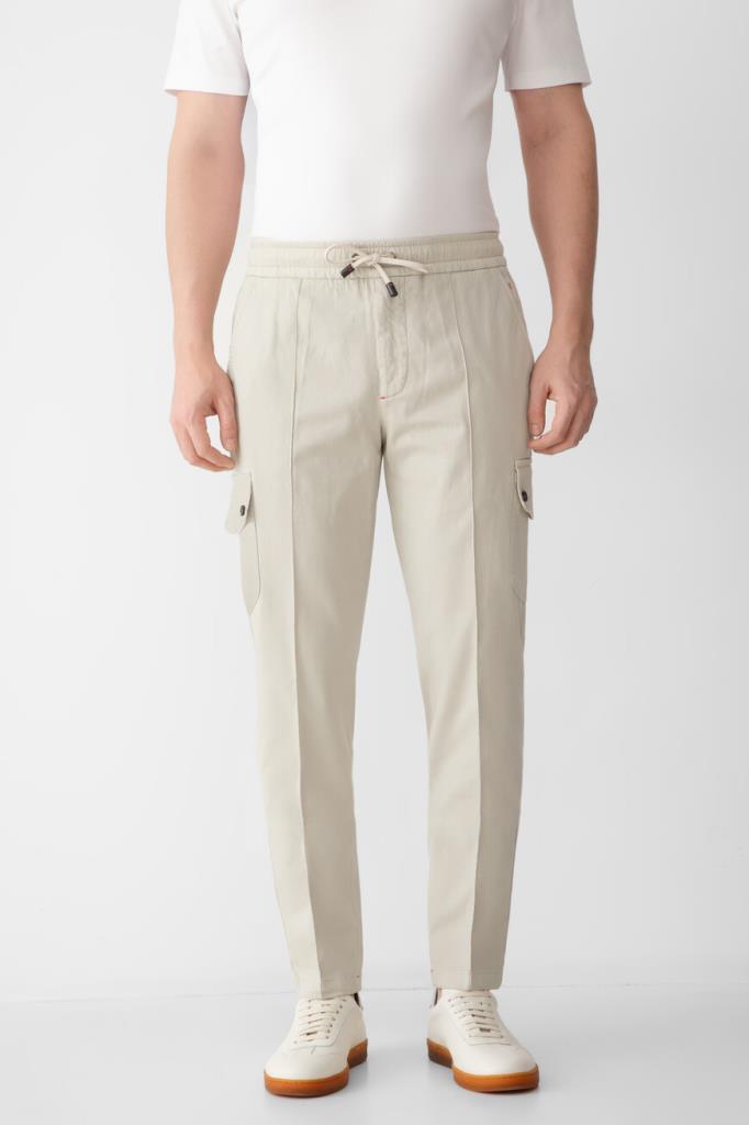 Брюки-карго от Isaia из хлопка и кашемира с добавлением стрейчевых волокон. Оптимальную посадку модели с тремя парами функциональных карманов по фигуре обеспечивает широкий эластичный пояс-кулиска. О принадлежности изделия прямого силуэта Дому деликатно напоминает вышитая коралловая ветвь ярко-красного оттенка за левым карманом спереди. Для создания органичного комплекта носите брюки с отутюженными складками спереди и сзади в комплекте с поло из той же коллекции.