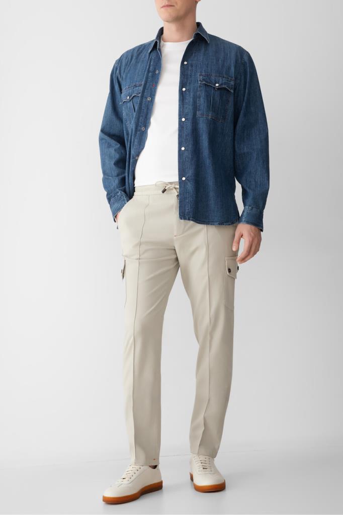 Брюки-карго от Isaia из хлопка и кашемира с добавлением стрейчевых волокон. Оптимальную посадку модели с тремя парами функциональных карманов по фигуре обеспечивает широкий эластичный пояс-кулиска. О принадлежности изделия прямого силуэта Дому деликатно напоминает вышитая коралловая ветвь ярко-красного оттенка за левым карманом спереди. Для создания органичного комплекта носите брюки с отутюженными складками спереди и сзади в комплекте с поло из той же коллекции.