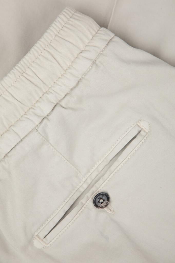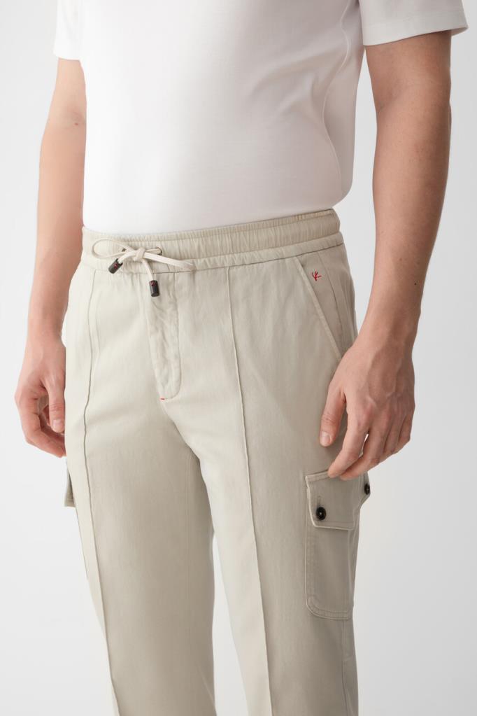 Брюки-карго от Isaia из хлопка и кашемира с добавлением стрейчевых волокон. Оптимальную посадку модели с тремя парами функциональных карманов по фигуре обеспечивает широкий эластичный пояс-кулиска. О принадлежности изделия прямого силуэта Дому деликатно напоминает вышитая коралловая ветвь ярко-красного оттенка за левым карманом спереди. Для создания органичного комплекта носите брюки с отутюженными складками спереди и сзади в комплекте с поло из той же коллекции.