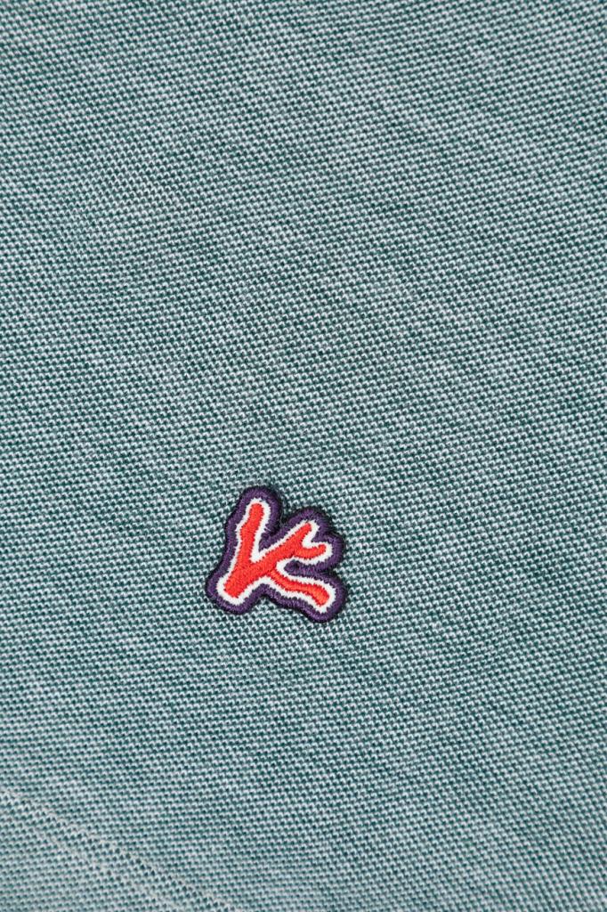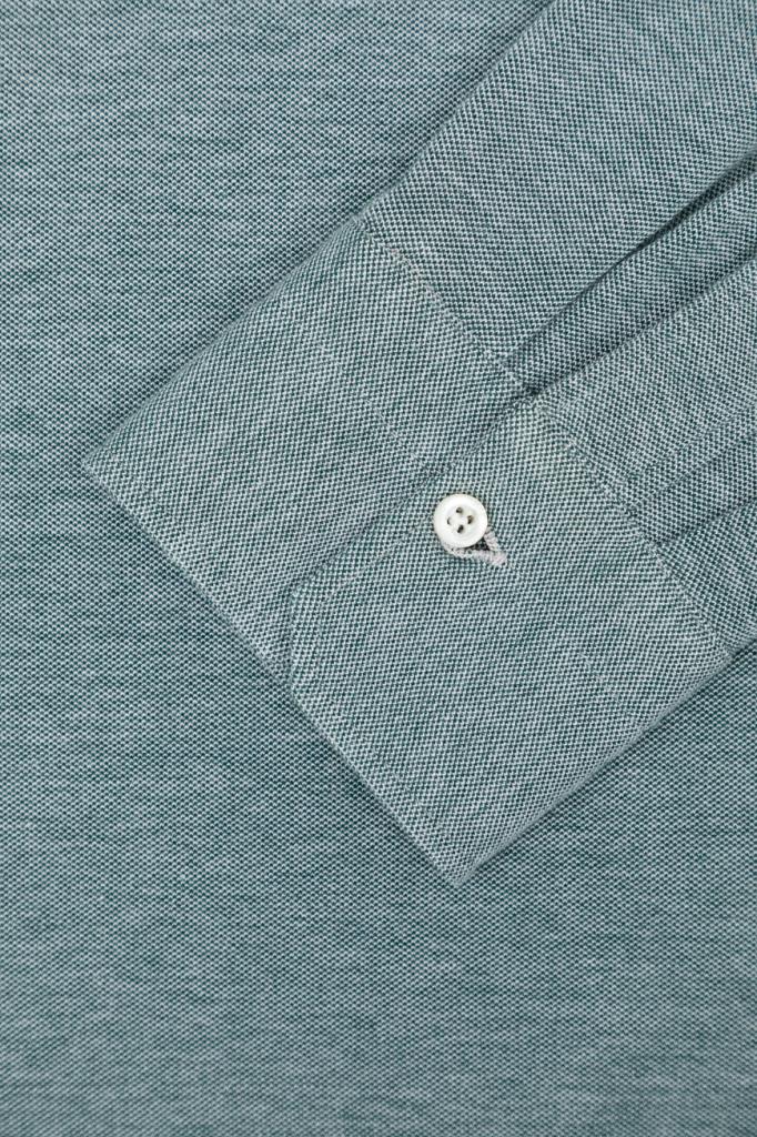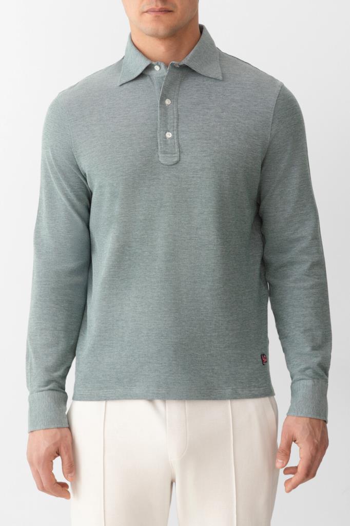 Поло на трёх перламутровых пуговицах сверху от Isaia. Изделие выполнено из мягкого хлопкового трикотажа-пике с характерным сетчатым узором. Отличительной особенностью модели с длинными рукавами стало наличие неглубоких ассиметричных разрезов снизу: передняя сторона поло короче задней. Роль знакового декора передана трёхцветной рельефной вышивке-патчу в виде коралловой ветви спереди.