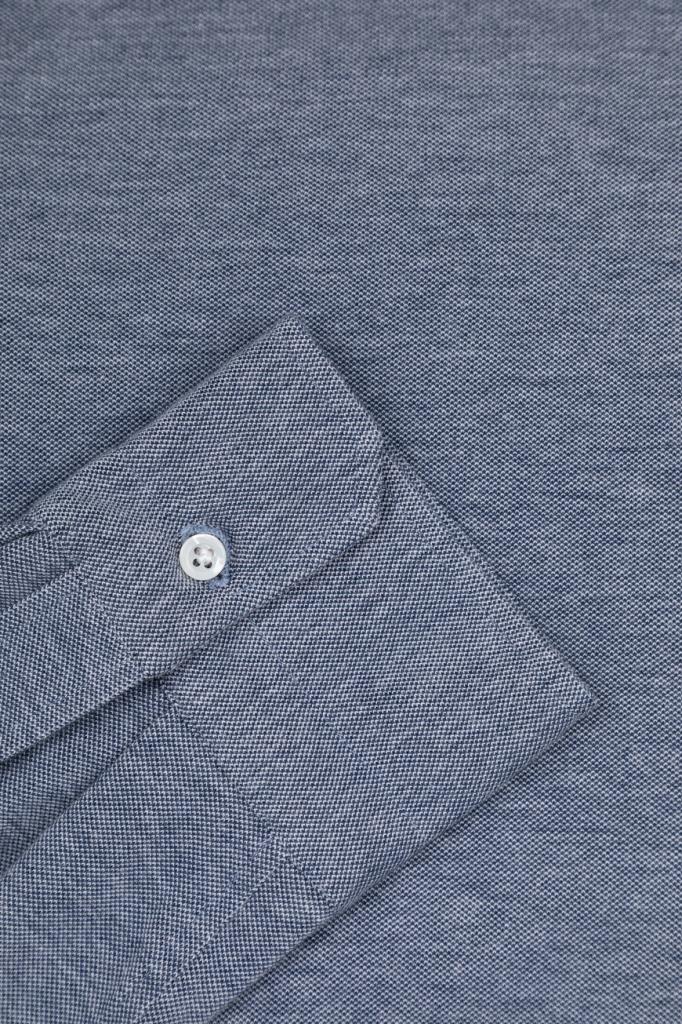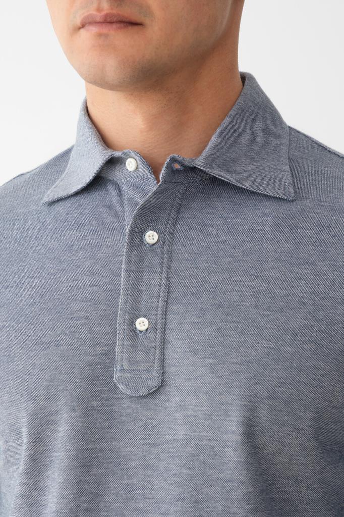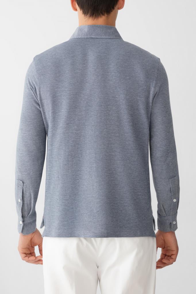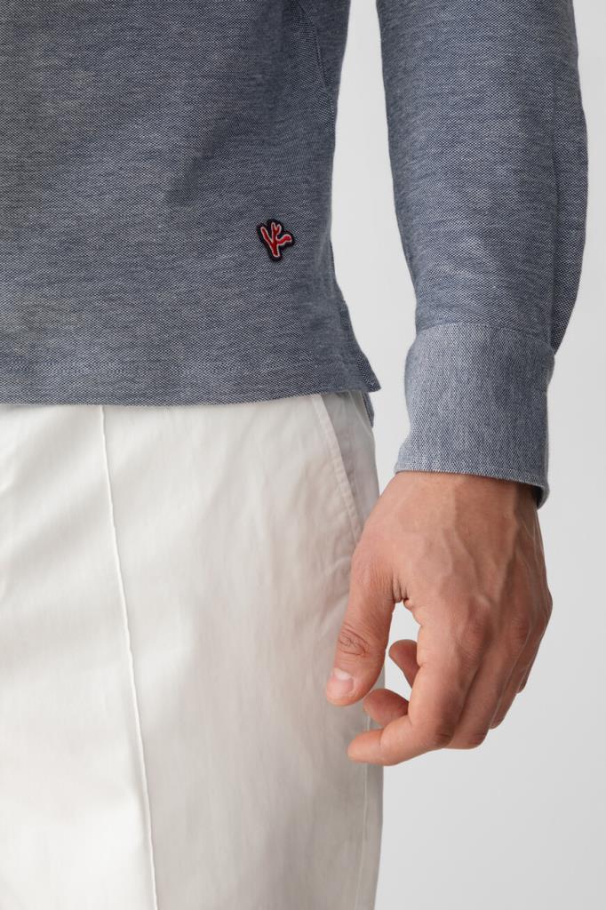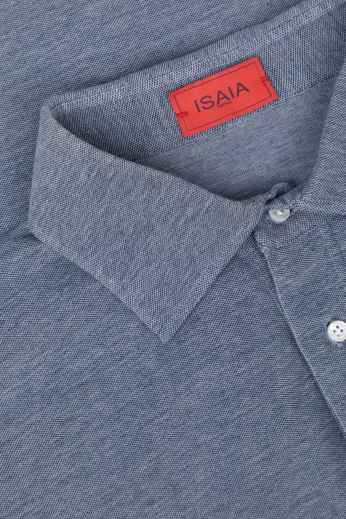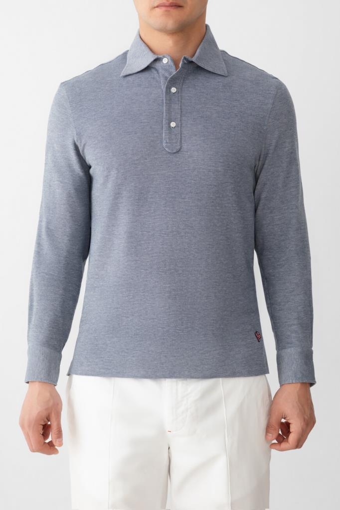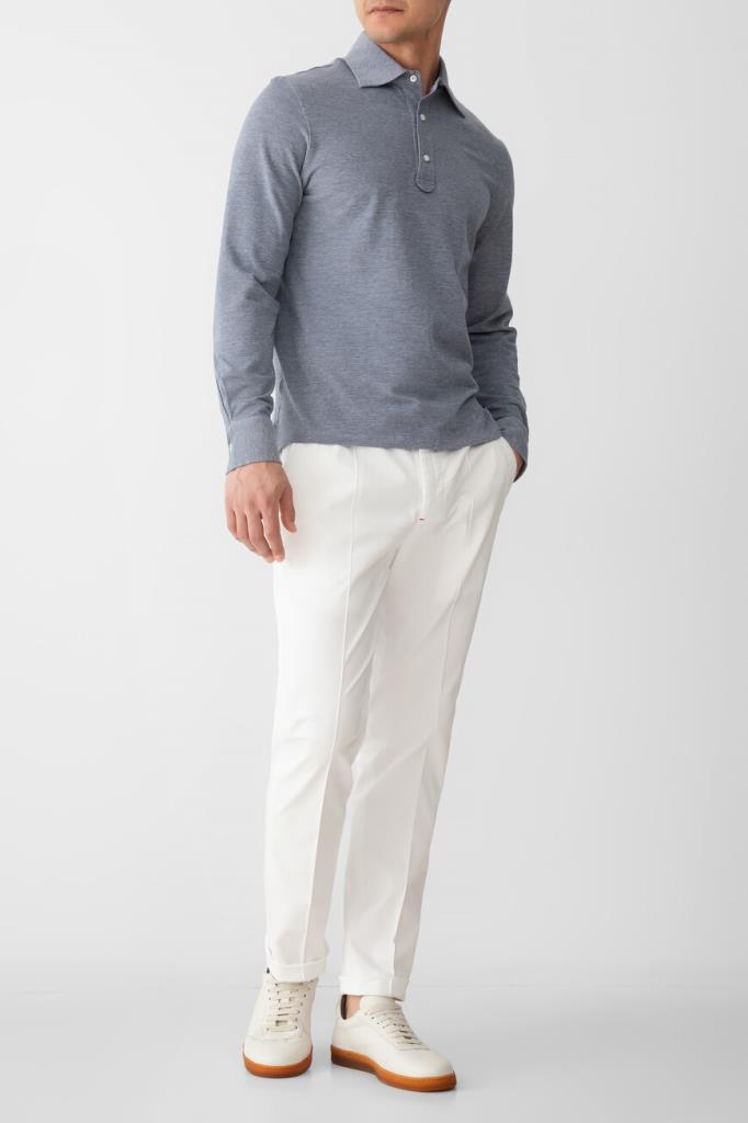 Хлопковое поло полуприлегающего силуэта от Isaia. Фасон повседневной модели с характерной текстурой пике предполагает наличие длинных рукавов и застёжки на перламутровые пуговицы с очерченной планкой сверху. Атрибутом Дома выступает трёхцветная рельефная вышивка-патч в виде коралловой ветви спереди слева. Носите изделие в комплекте с белыми брюками с подворотами снизу из той же коллекции.