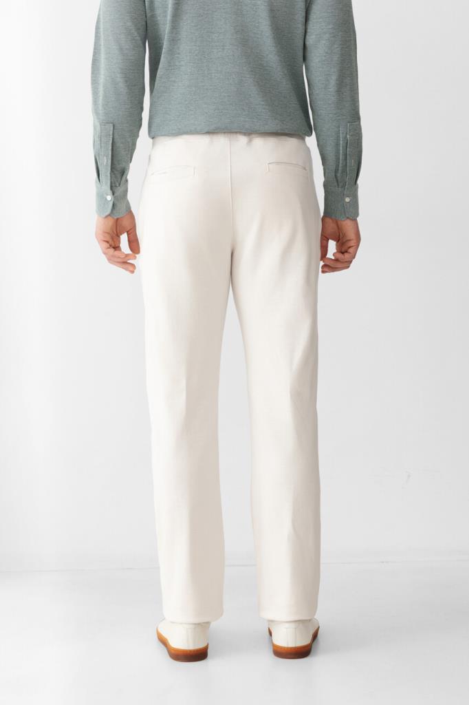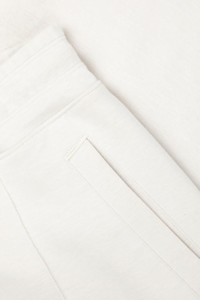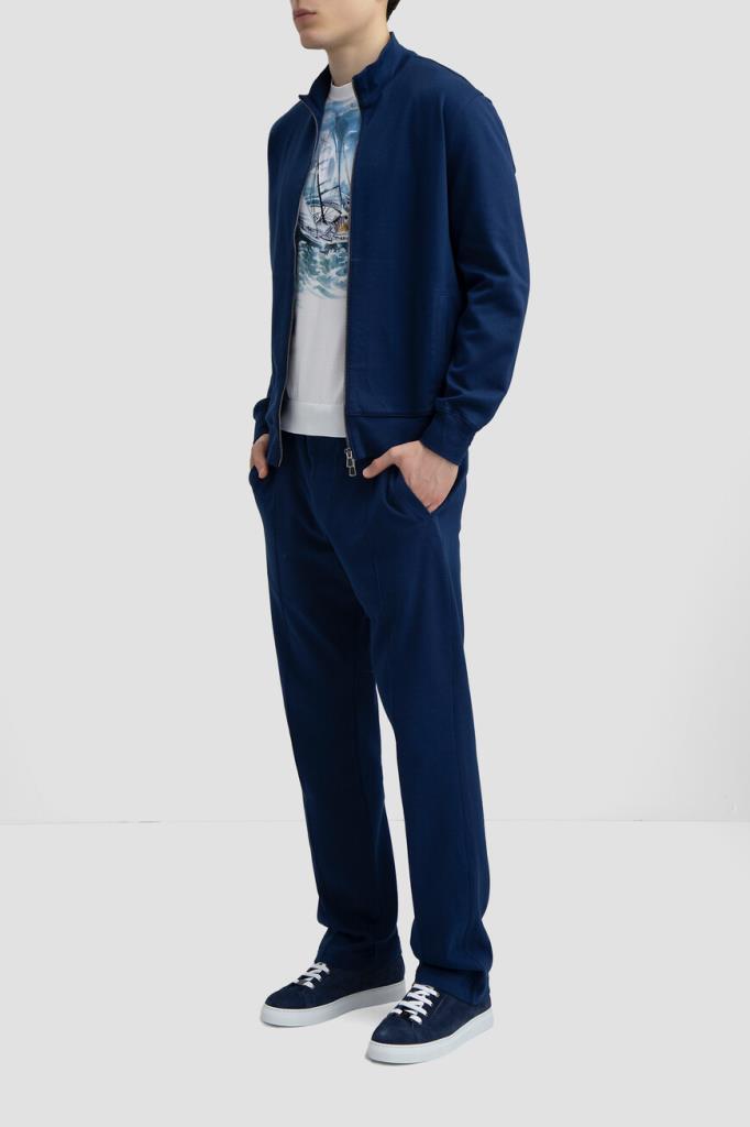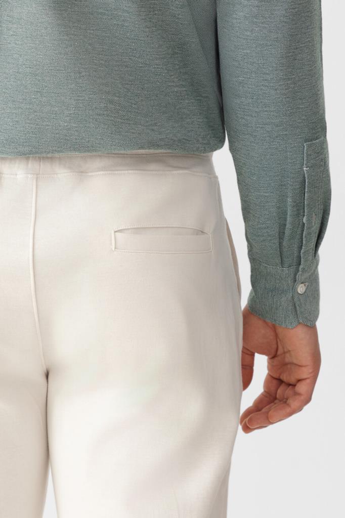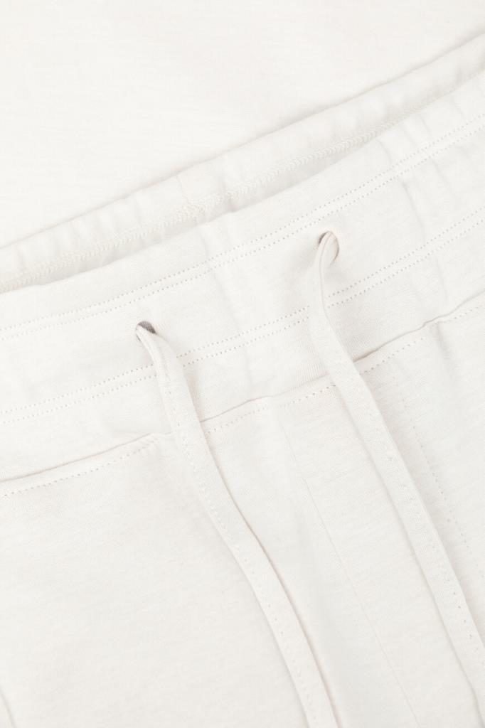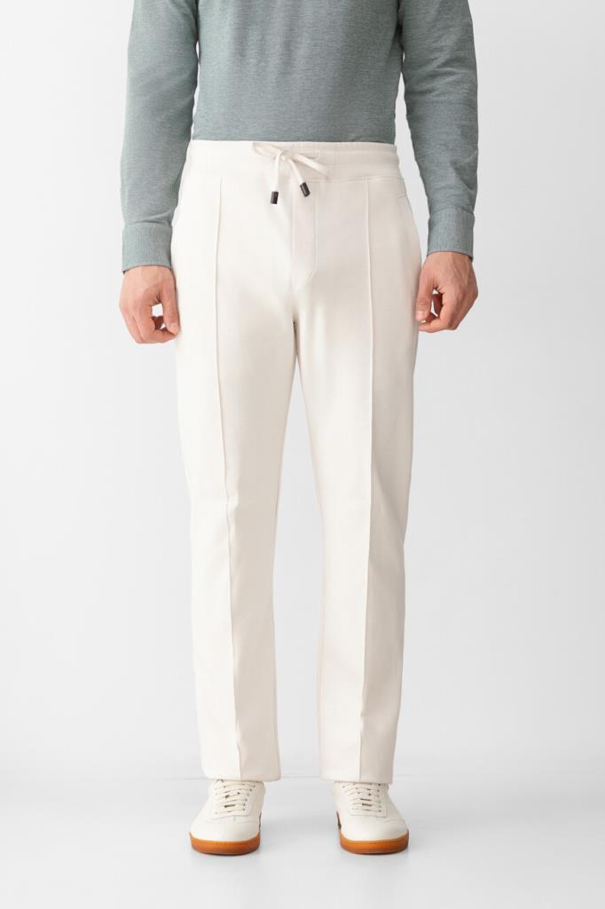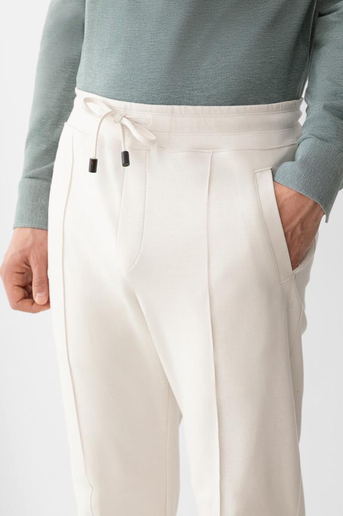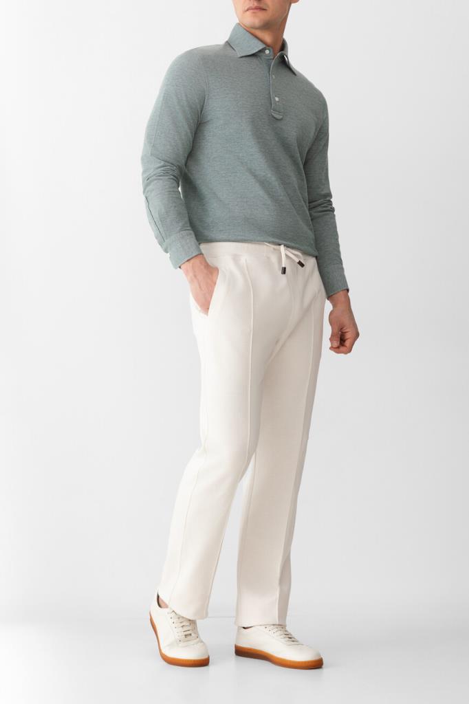 Спортивные брюки Isaia с четырьмя прорезными карманами. Модель изготовлена из мягкого трикотажа на основе хлопка и нейлона белого цвета с декоративной строчкой. О принадлежности изделия с прошитыми стрелками спереди Дому напоминает вышитая знаковая символика - коралловая ветвь в тон под левым передним карманом.