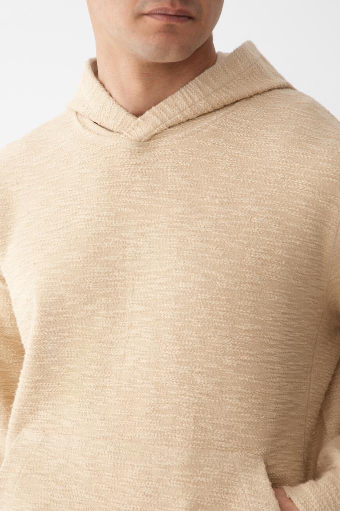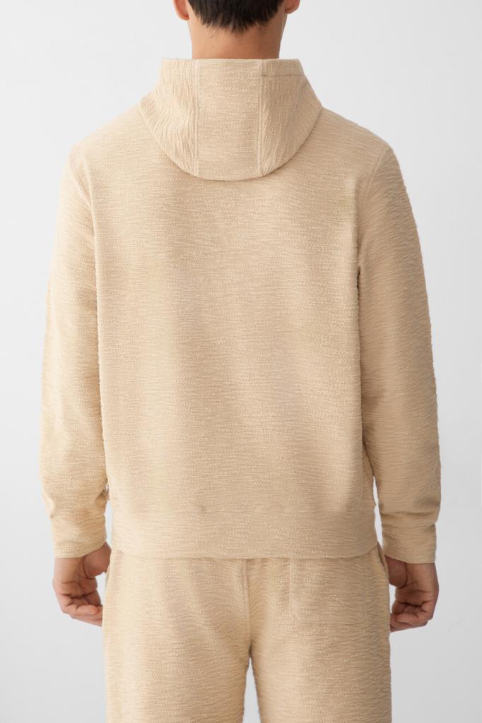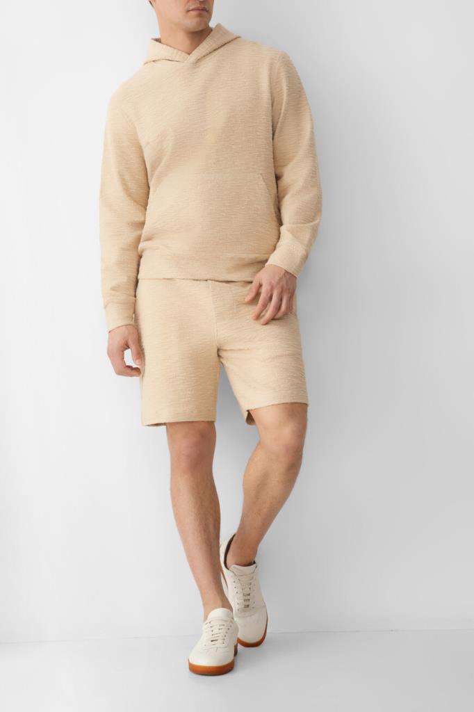 Свободное худи Isaia с крупным карманом-кенгуру. Модель с глубоким капюшоном выполнена из мягкого хлопкового трикотажа бежевого оттенка с фактурным узором в тон. Для создания органичного спортивного комплекта носите изделие с парными бермудами на кулиске из той же коллекции.