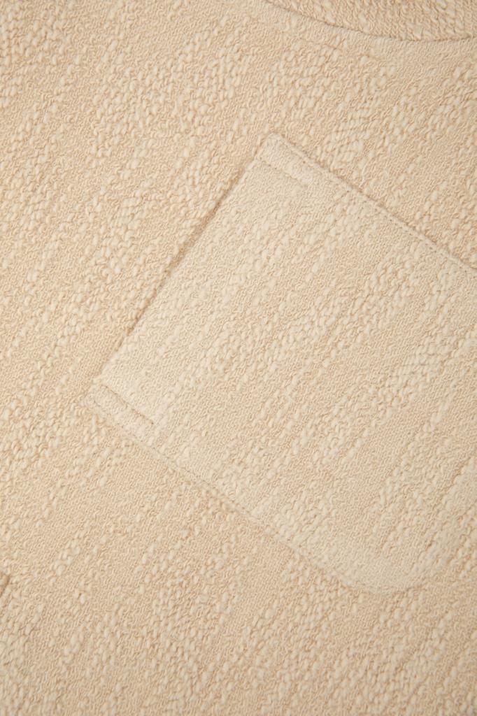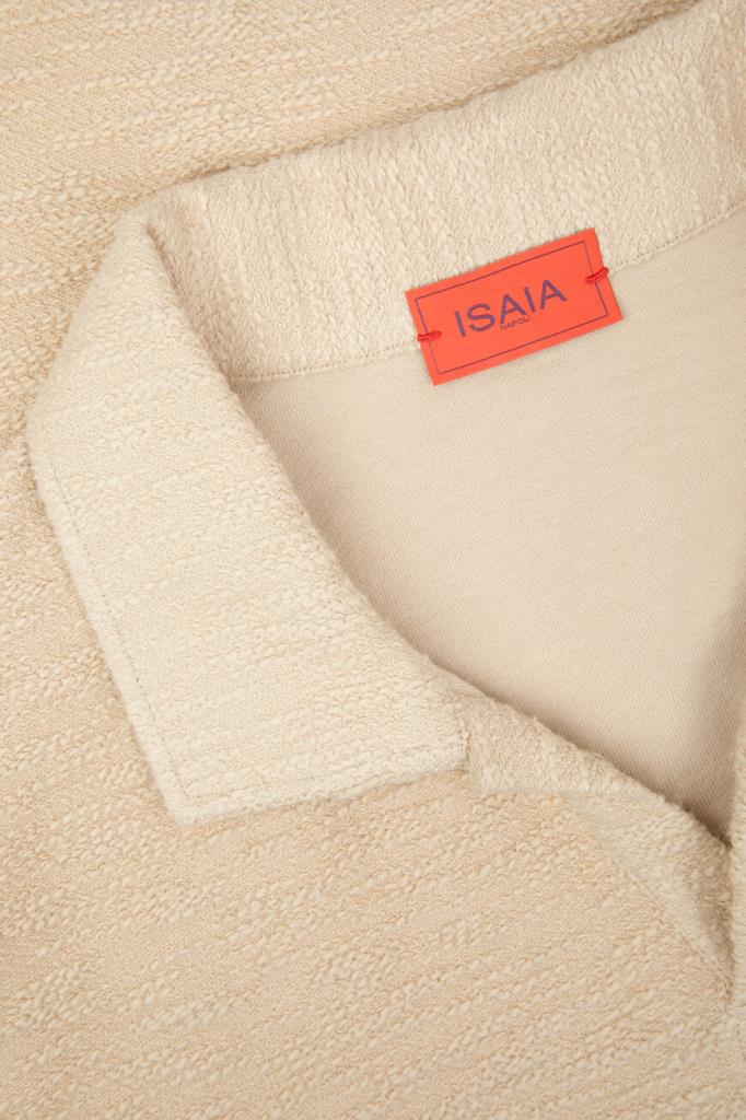 Бежевое поло Isaia выполнено без застёжки. Для изготовления прямой модели используется мягкий хлопковый трикотаж с фактурным узором в тон. Отличительными особенностями изделия являются наличие нагрудного накладного кармана слева и неглубоких боковых разрезов. Поло станет основой образа с парными бермудами на кулиске из той же коллекции.