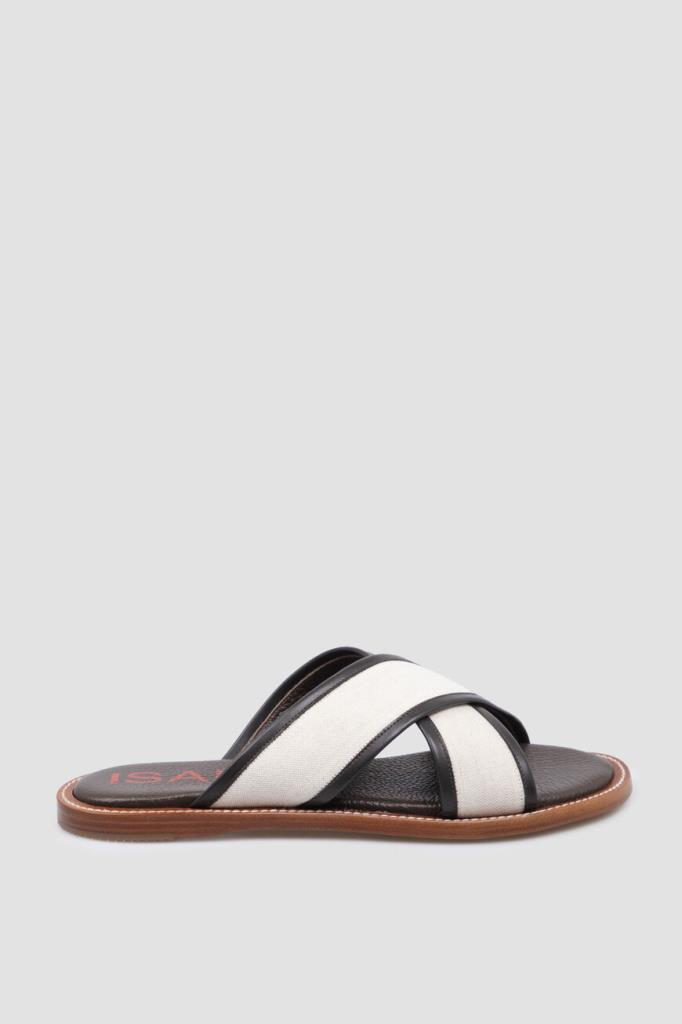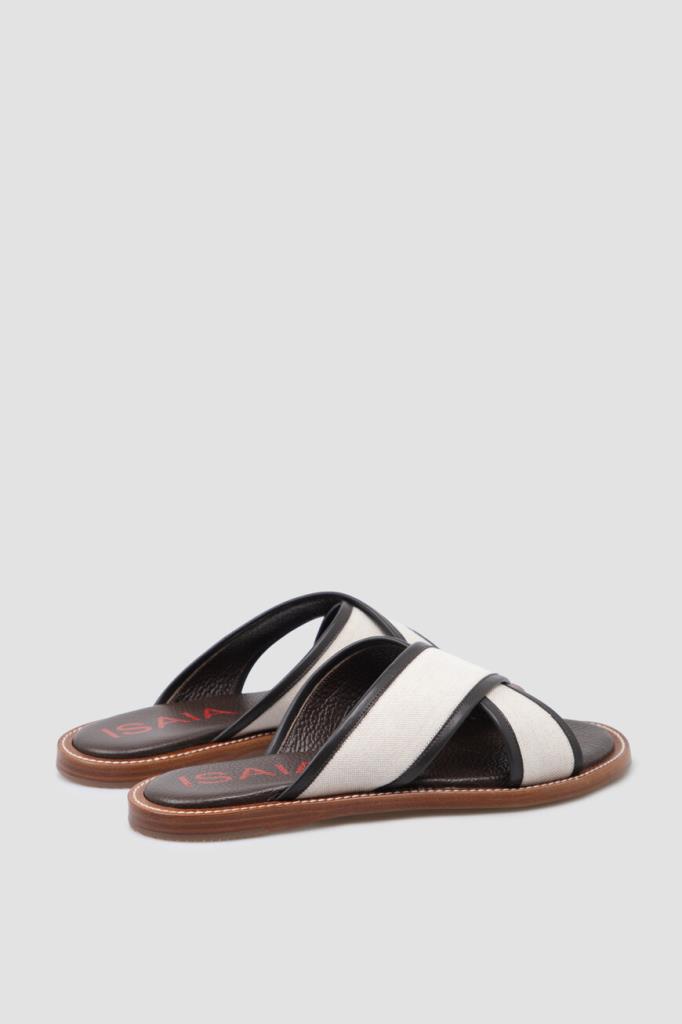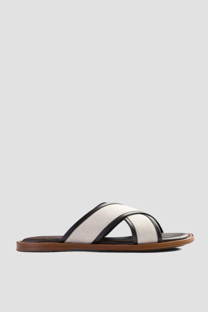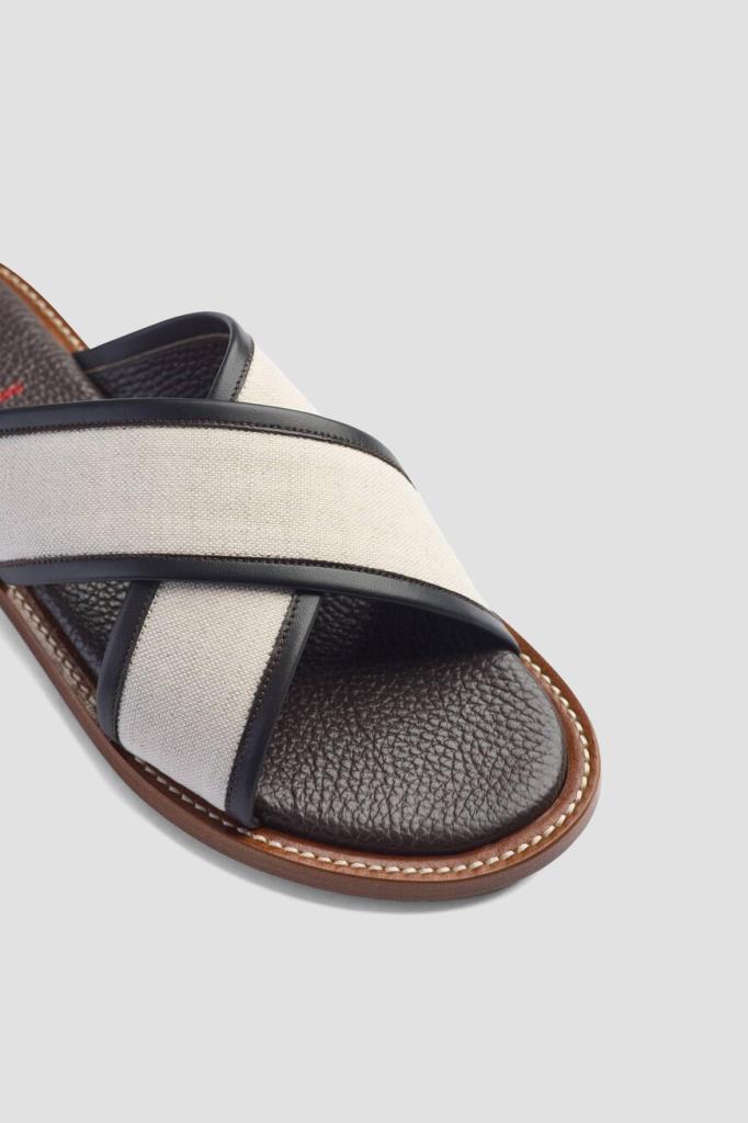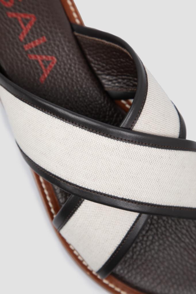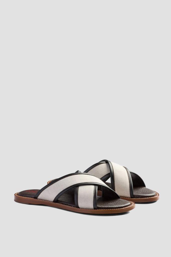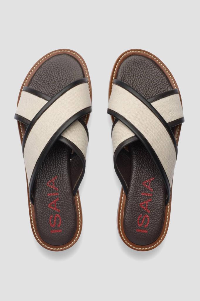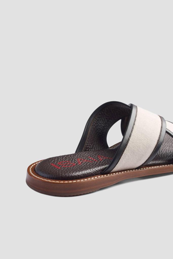 Шлёпанцы ISAIA на плоской коричневой подошве с утолщением в задней части. Для изготовления союзки, представляющей собой два широких перекрещенных ремешка, используется плотный текстиль цвета слоновой кости. Мыс обрамлён чёрным кожаным кантом, а тёмно-коричневые стельки дополнены характерной зернистой текстурой и украшены крупными красными лого Дома.