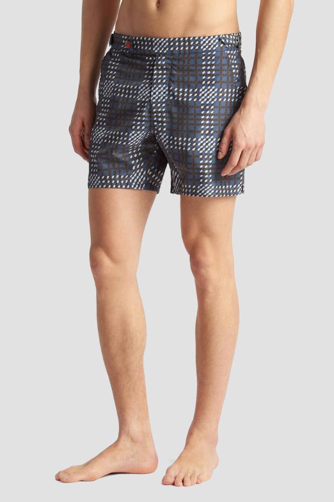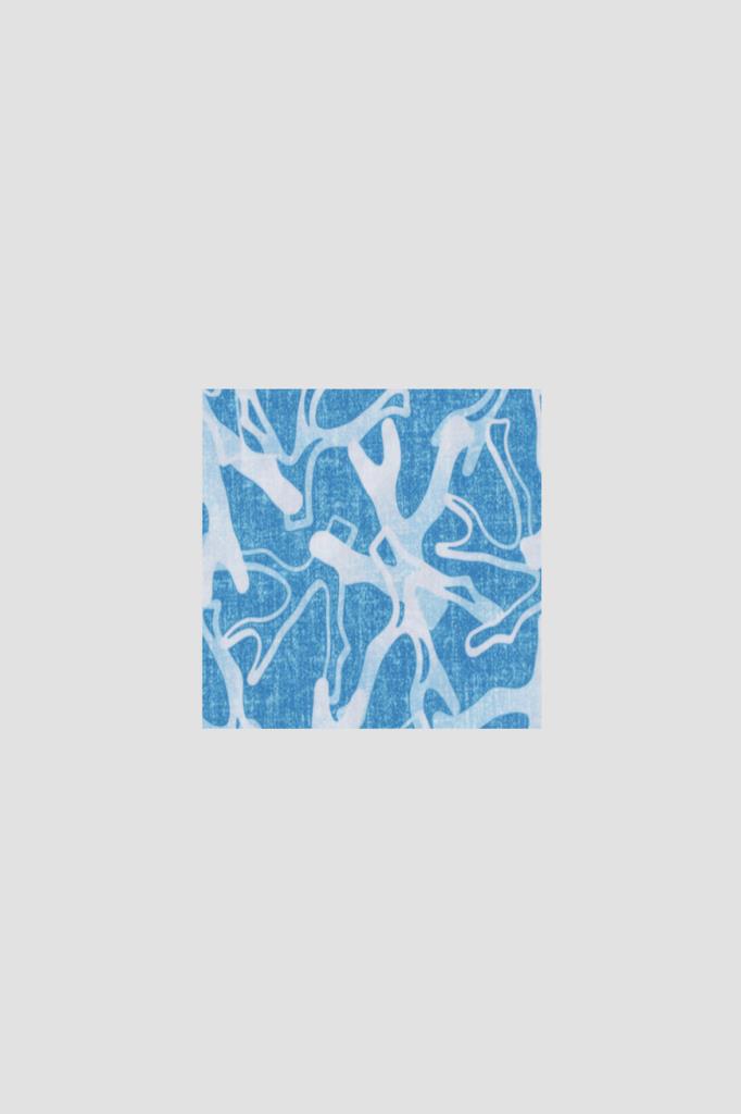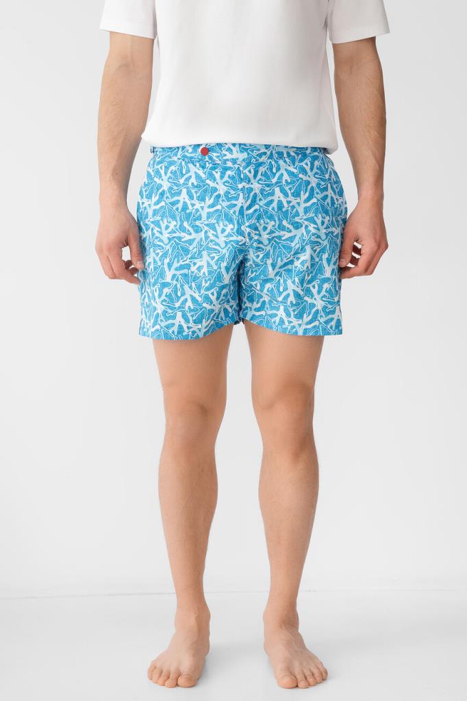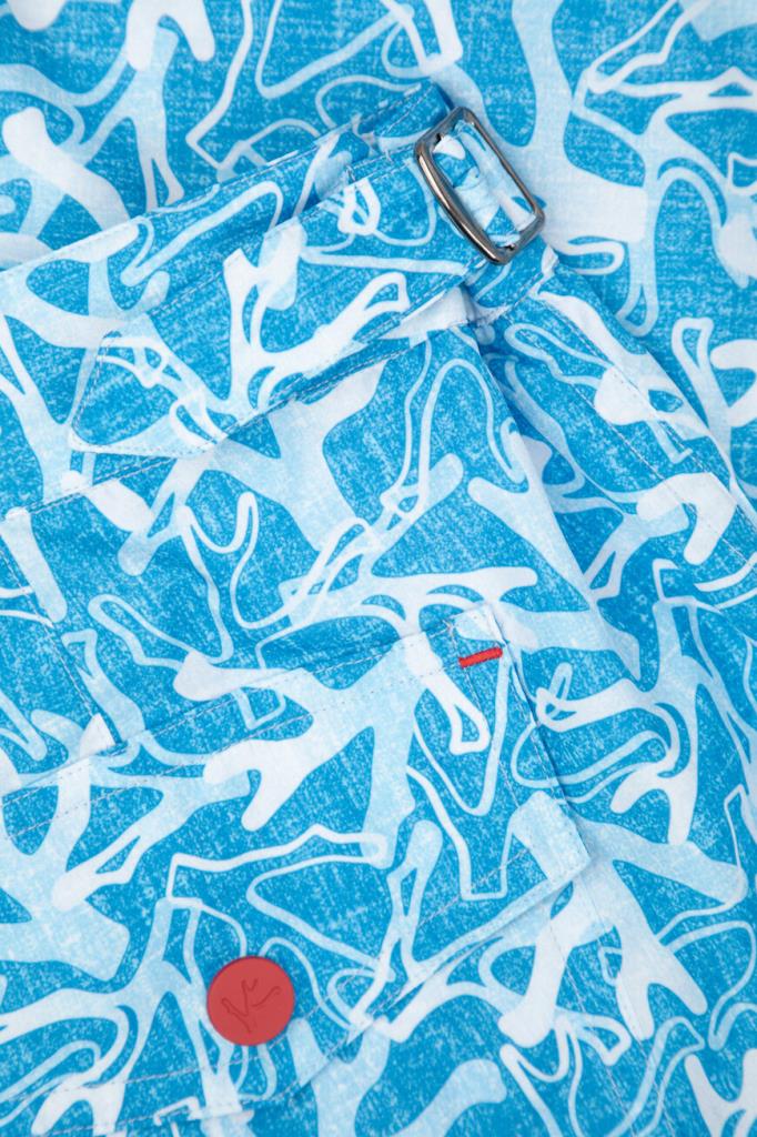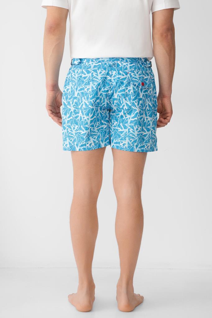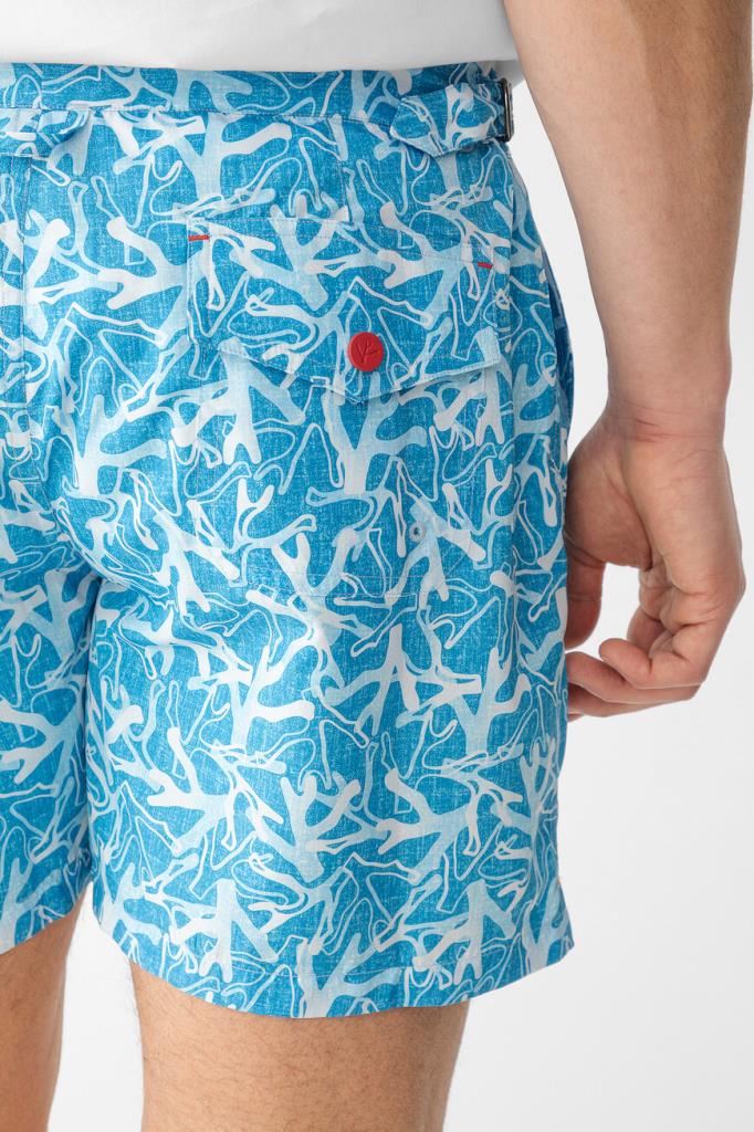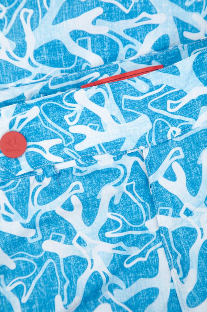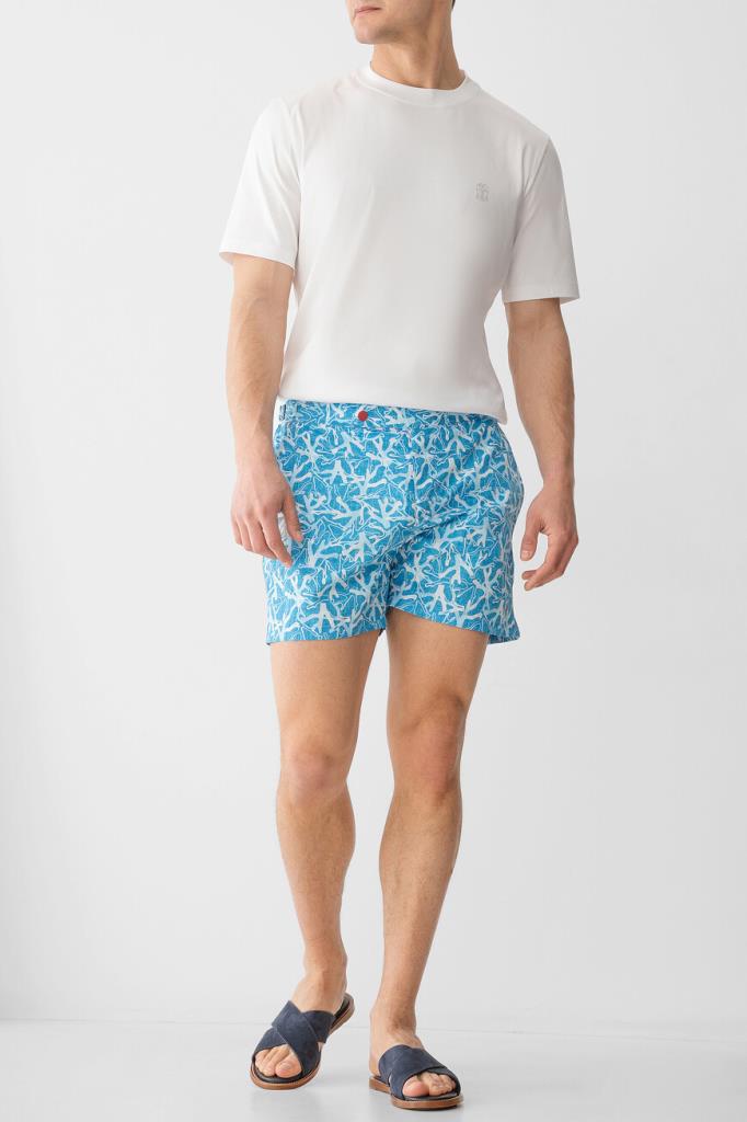 Плавки-шорты Isaia с дизайнерским принтом белого цвета на голубом фоне. Для производства модели прямого силуэта используется прочный полиэстер. Декором выступают геометрический мотив в виде коралловой ветви и вышитая знаковая символика Дома ярко-красного оттенка спереди. Посадка изделия регулируется ремешками с прямоугольными металлическими пряжками по бокам и застёжкой на потайную молнию и брендированную матовую клёпку с планкой.