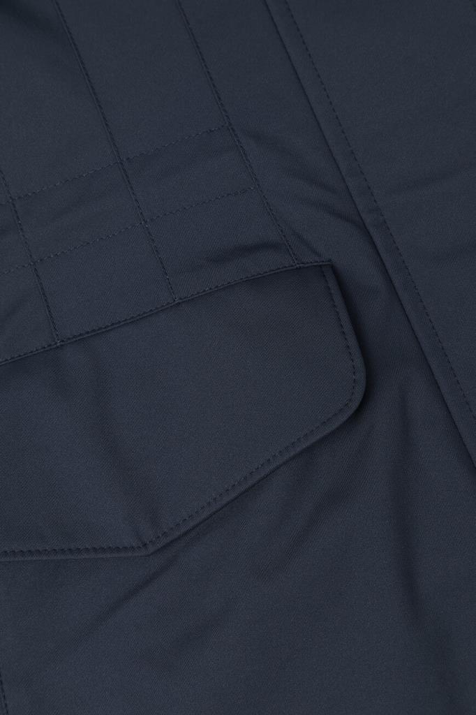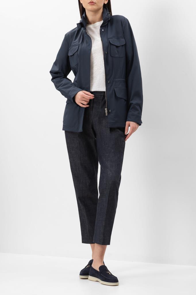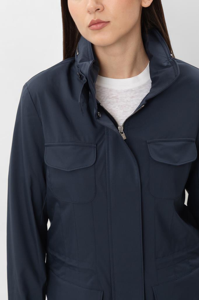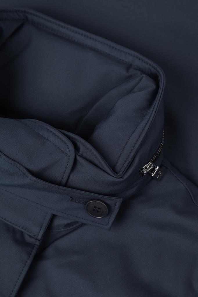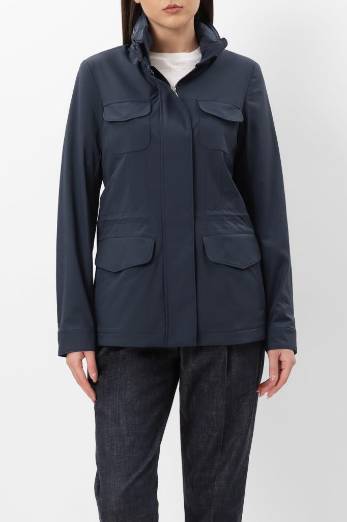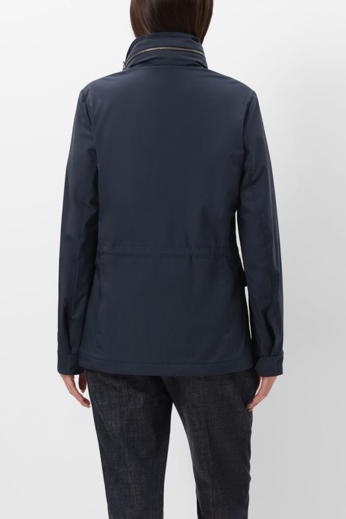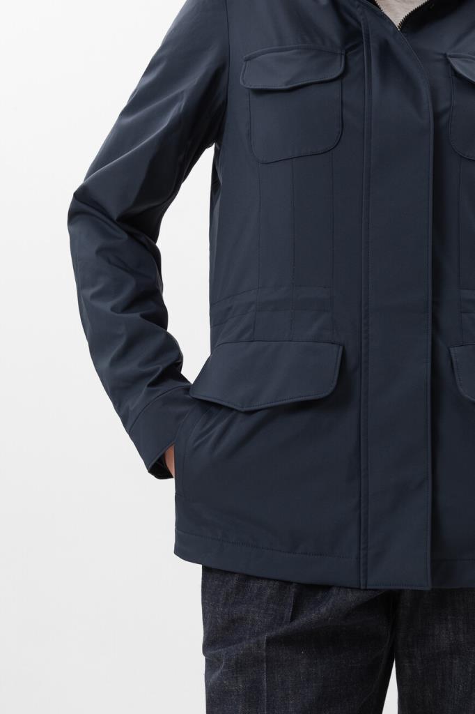 Тёмно-синяя куртка Traveller прилегающего силуэта от бренда Loro Piana. Для изготовления повседневной модели используется прочное эковолокно WindMate® Stretch с надёжным водоотталкивающим и ветроустойчивым покрытием. Особенностями изделия стало наличие четырёх крупных карманов с клапанами и подкладки из мягкого нежного кашемира на несколько тонов темнее основы. Внутри высокого воротника-стойки в отделении на молнии спрятан капюшон. Лёгкая куртка идеально подходит для путешествий и отдыха.
