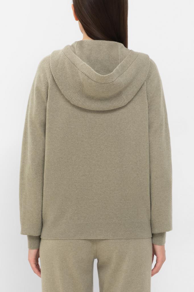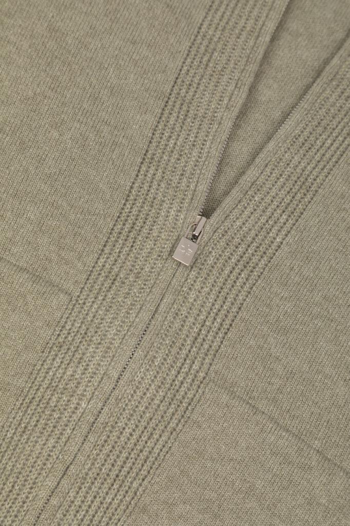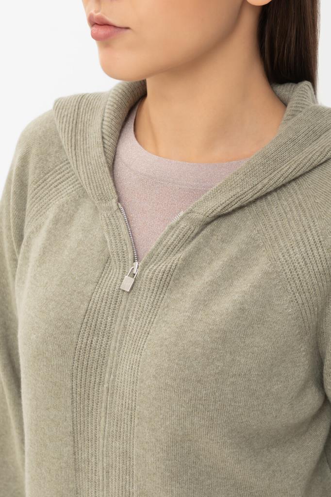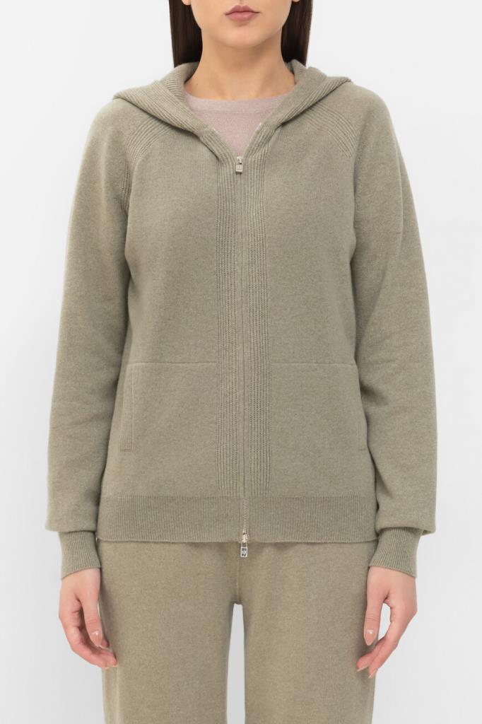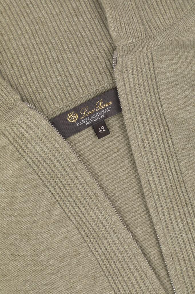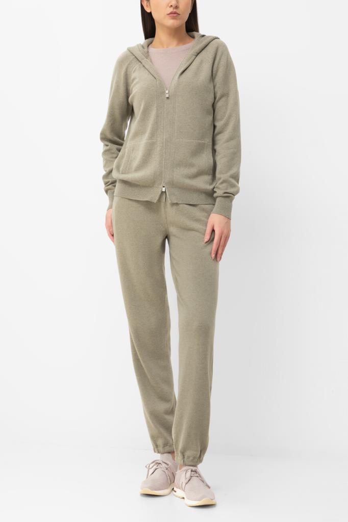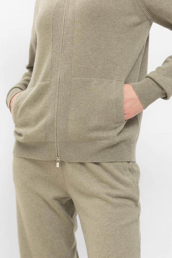 Бомбер Merano расслабленного силуэта от бренда Loro Piana. Для изготовления повседневной модели используется мягкий бэби кашемир из пуха козлят породы Hircus. Изделие характеризуется наличием глубокого капюшона и застёжкой на встречную молнию с двумя брендированными пуллерами. Особенностью бомбера является фактурный полосатый мотив в английскую резинку на капюшоне, в проймах рукавов, вдоль планки застёжки и в отделке боковых накладных карманов в тон. Лёгкая модель сочетается с парными брюками в спортивном стиле из той же коллекции.