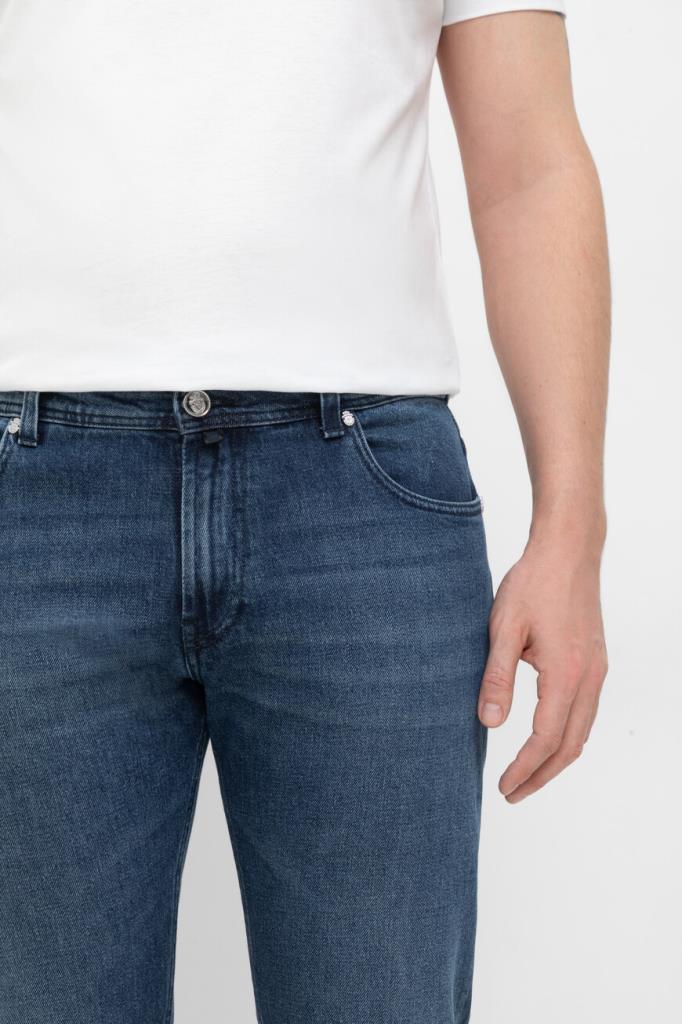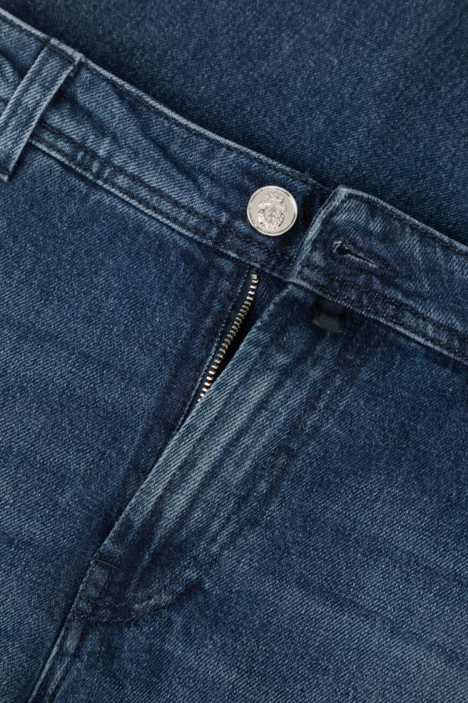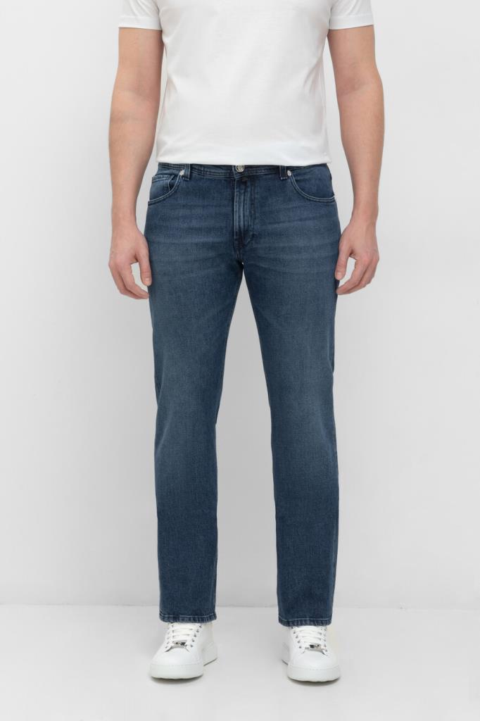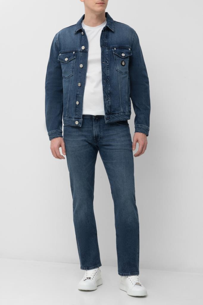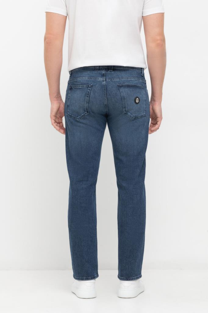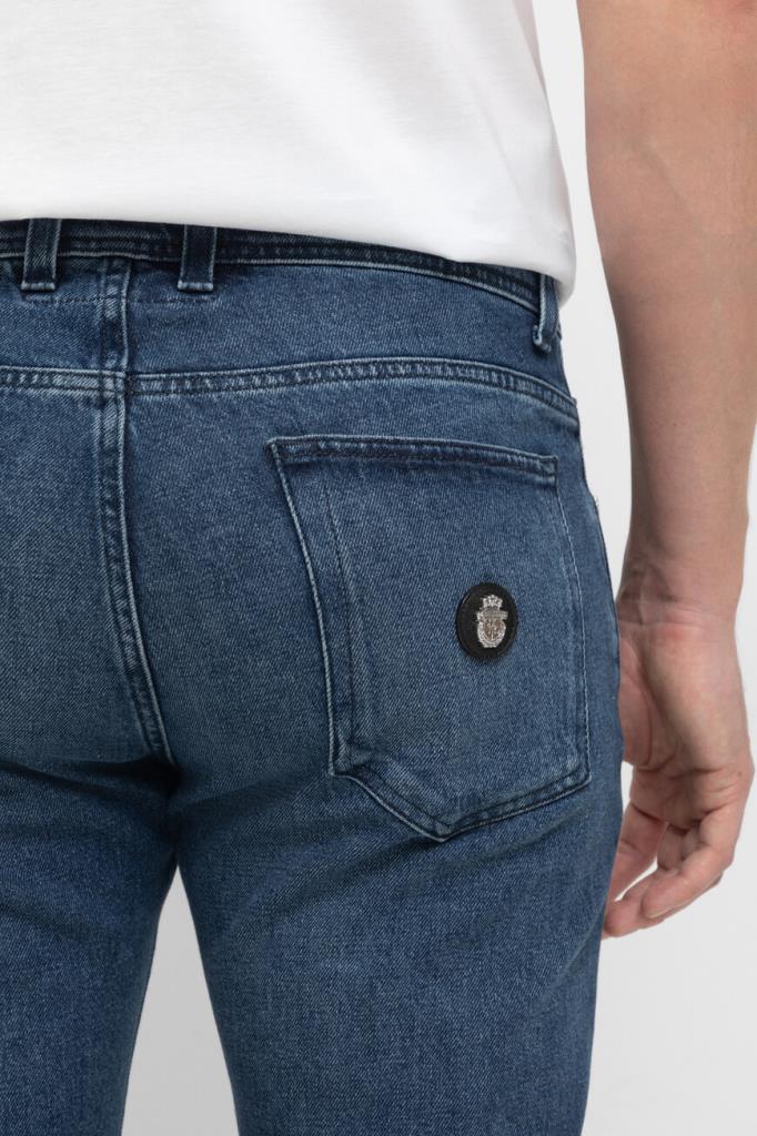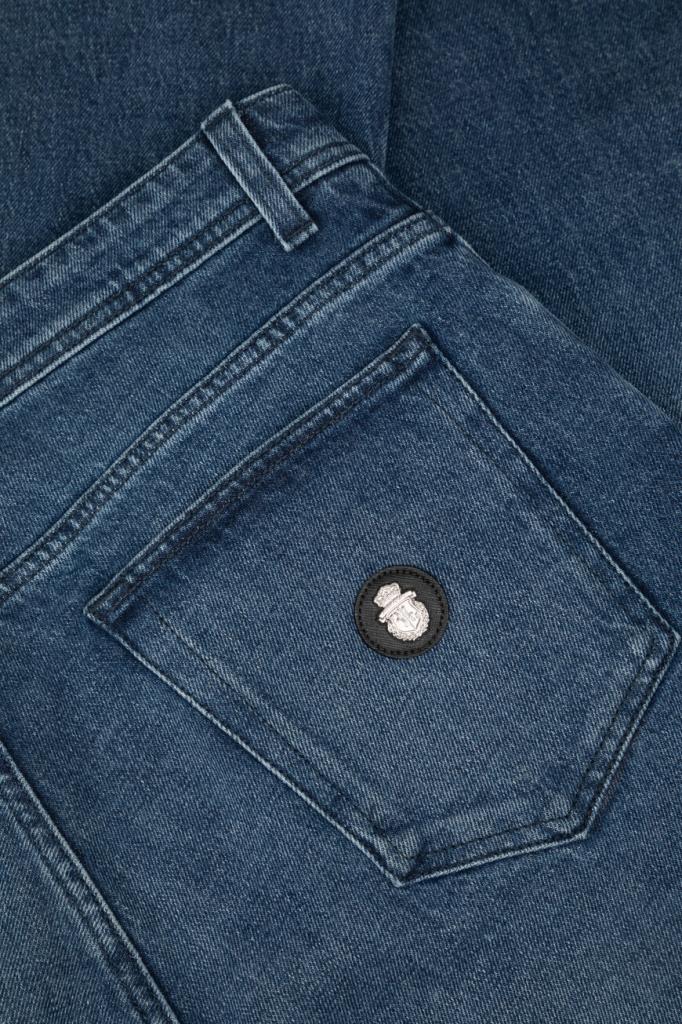 Синие джинсы Billionaire на потайной молнии и крупной брендированной пуговице. Для изготовления повседневной модели прямого силуэта используется эластичный хлопковый деним с эффектом делаве. Атрибутами Дома являются чёрная кожаная нашивка с металлическим гербом на заднем кармане и рельефные детали спереди. Для создания органичного комплекта носите изделие с курткой с отложным воротником из той же коллекции.