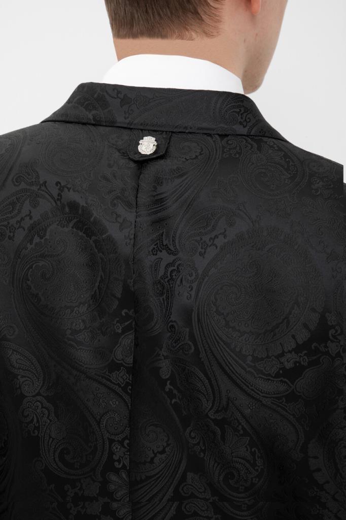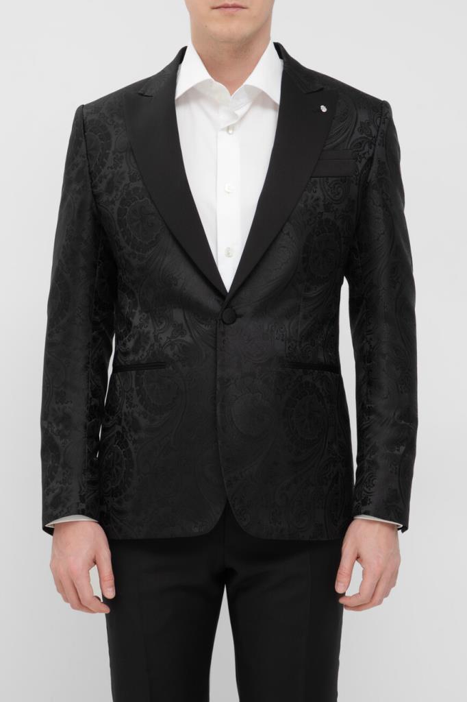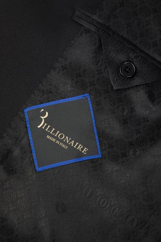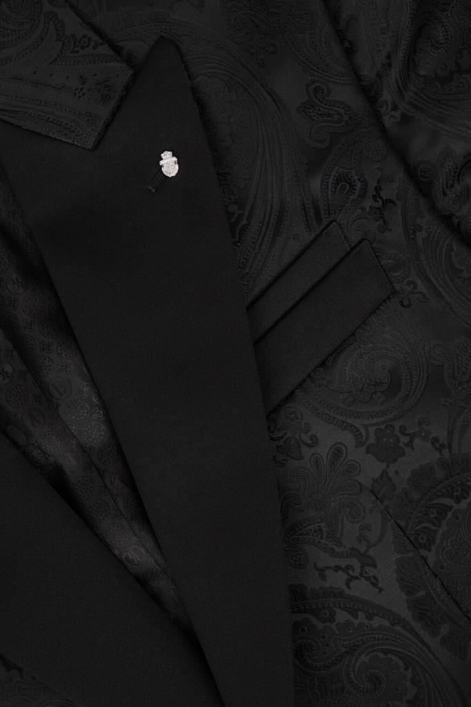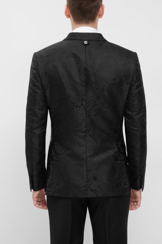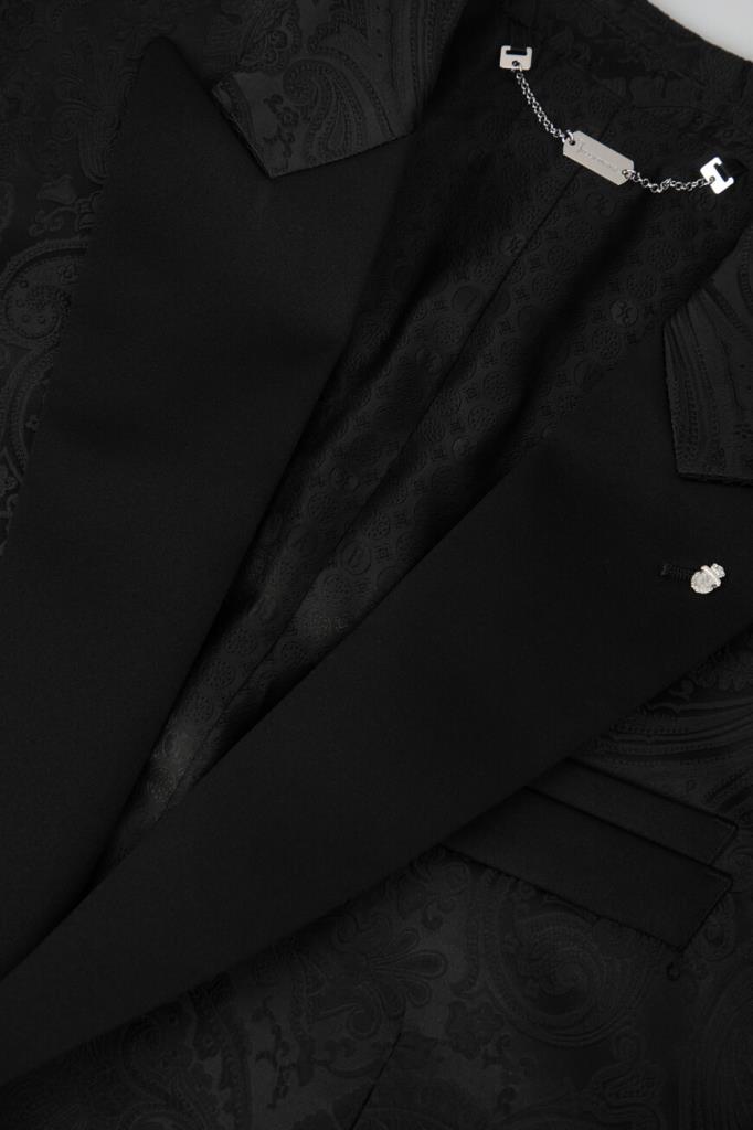 Жаккардовый блейзер из прочного чёрного полиэфира от Billionaire. Фасон изделия прилегающего силуэта, декорированного орнаментом в тон, характеризуется наличием заострённых однородных лацканов и однобортной застёжкой на крупную пуговицу. В качестве знакового декора выступают вставки в виде серебристого металлического герба бренда на левом лацкане и кокетке.