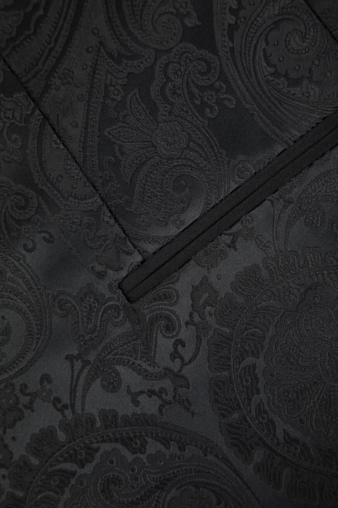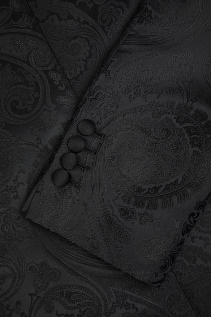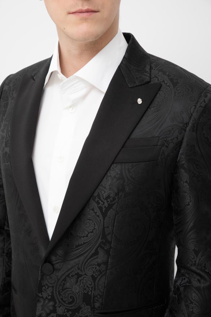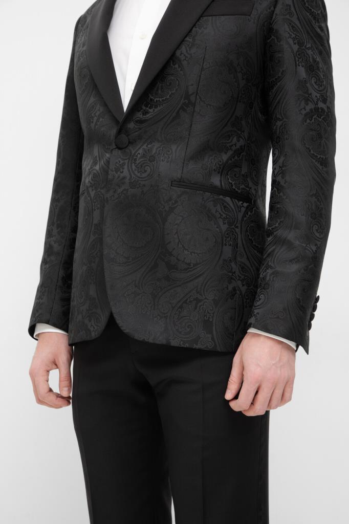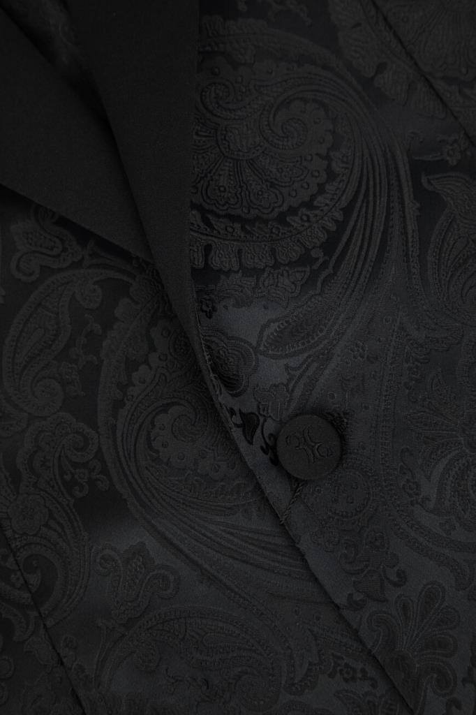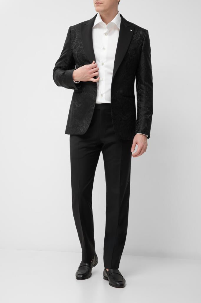 Жаккардовый блейзер из прочного чёрного полиэфира от Billionaire. Фасон изделия прилегающего силуэта, декорированного орнаментом в тон, характеризуется наличием заострённых однородных лацканов и однобортной застёжкой на крупную пуговицу. В качестве знакового декора выступают вставки в виде серебристого металлического герба бренда на левом лацкане и кокетке.