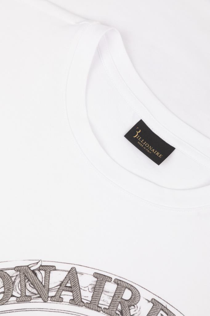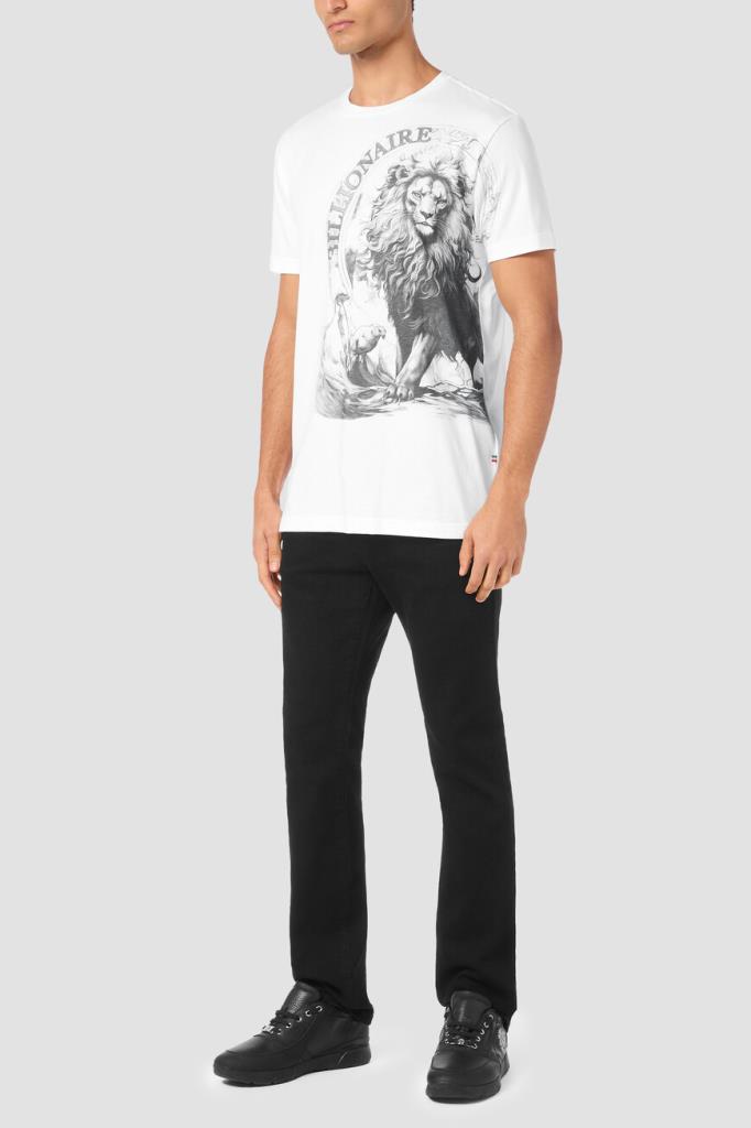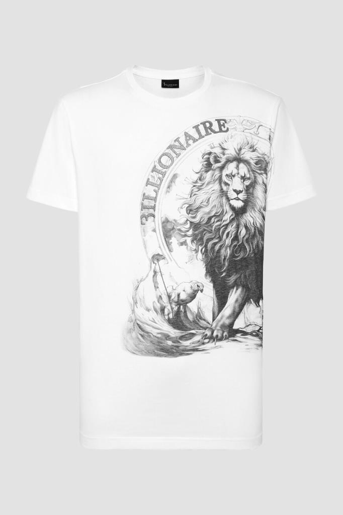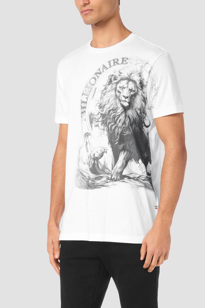 Белая принтованная футболка от Billionaire. Модель изготовлена из мягкого хлопкового джерси с крупными изображением льва и логотипом бренда спереди. Отличительной особенностью изделия стала отделка краёв двойной прострочкой. Футболка прямого силуэта станет основой Ваших casual-комплектов.