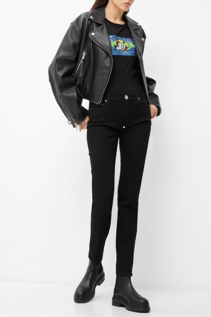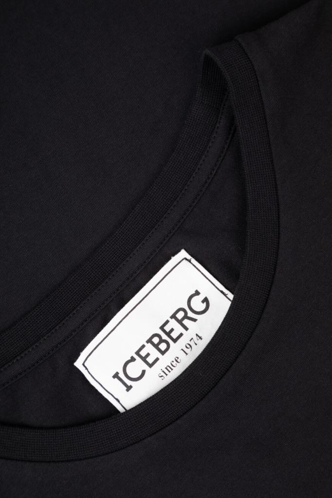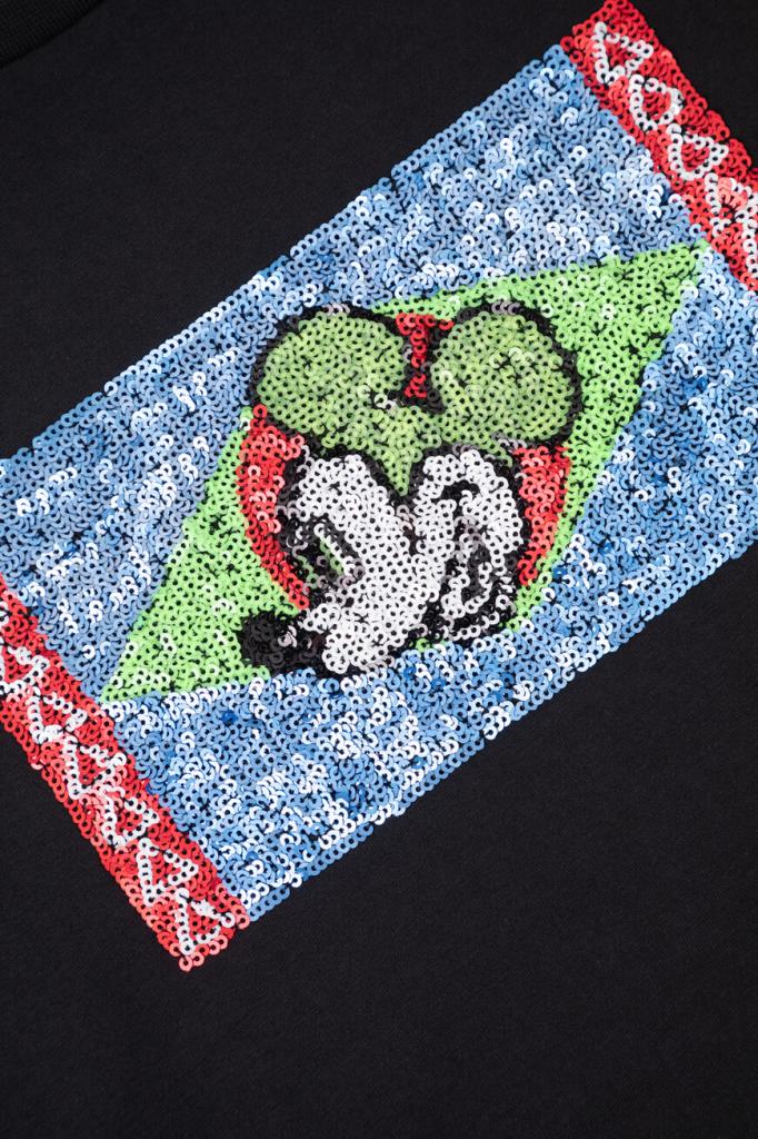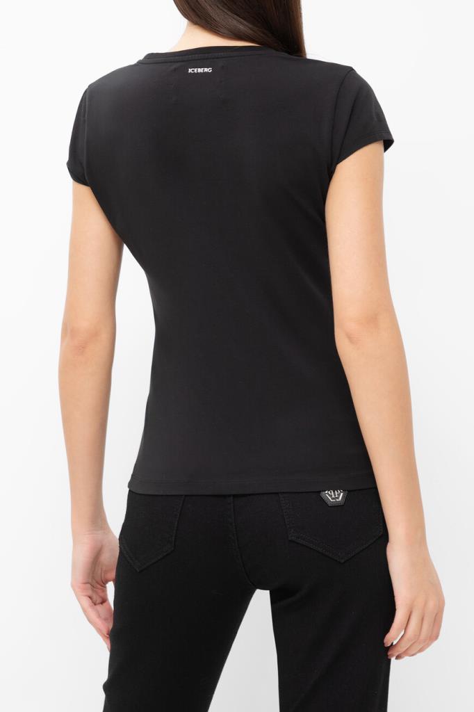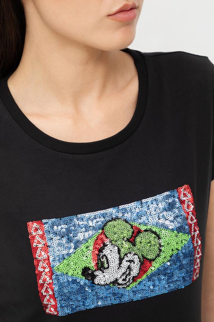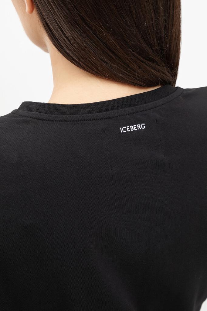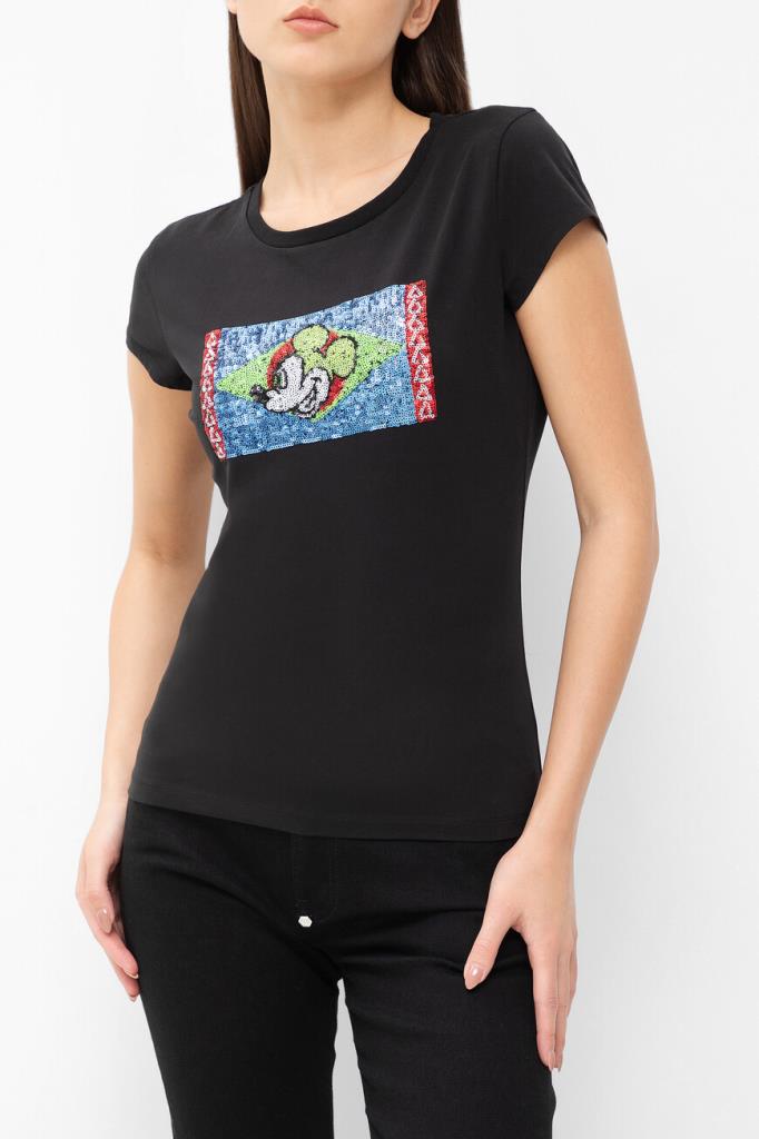 Лёгкая футболка с контрастным логотипом ICEBERG. Модель изготовлена из эластичного хлопкового джерси чёрного цвета и украшена прямоугольной вставкой с разноцветным мультипликационным принтом, выполненным из переливающихся на солнце пайеток. Вышивка представляет собой геометрический рисунок и изображение Микки Мауса в центре.