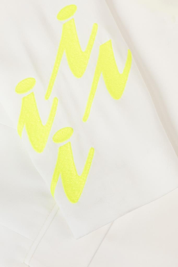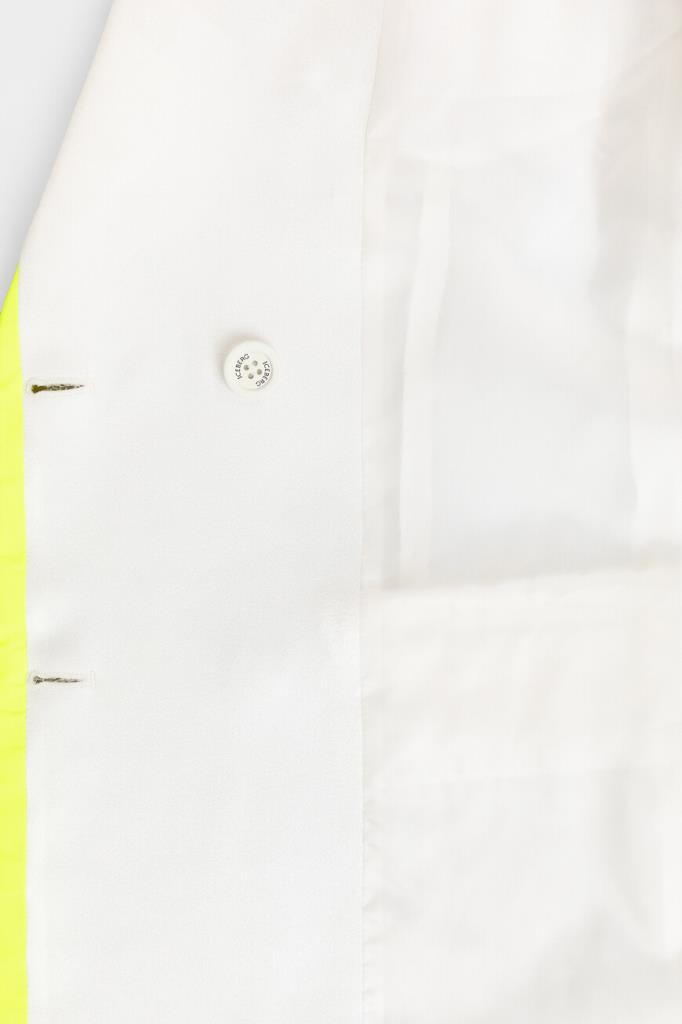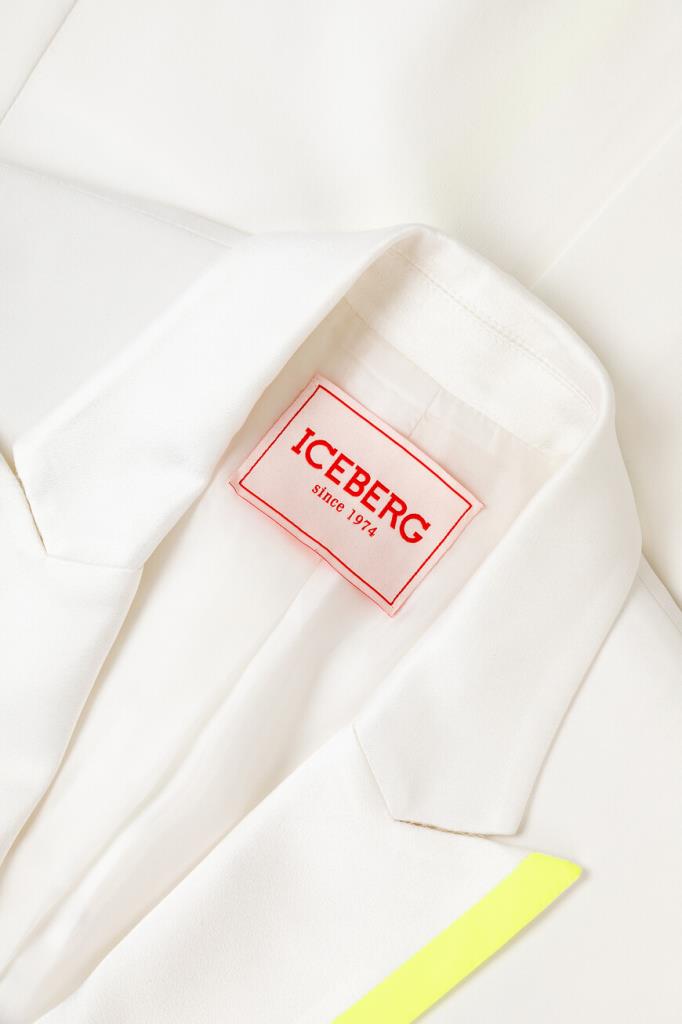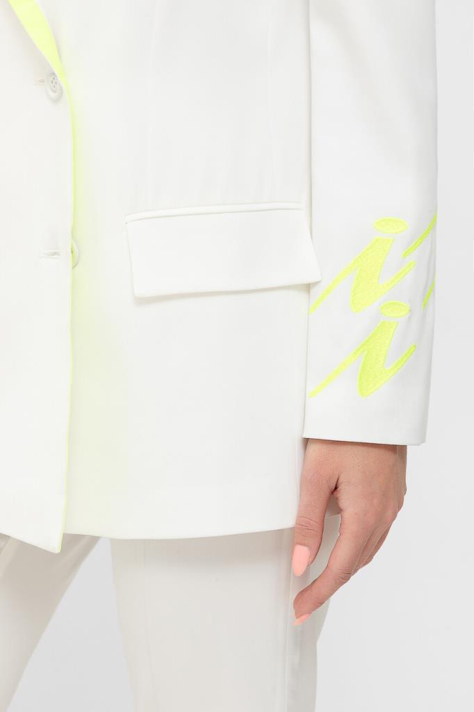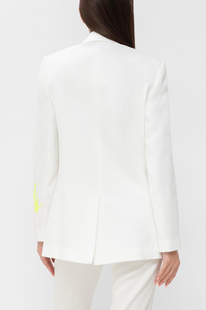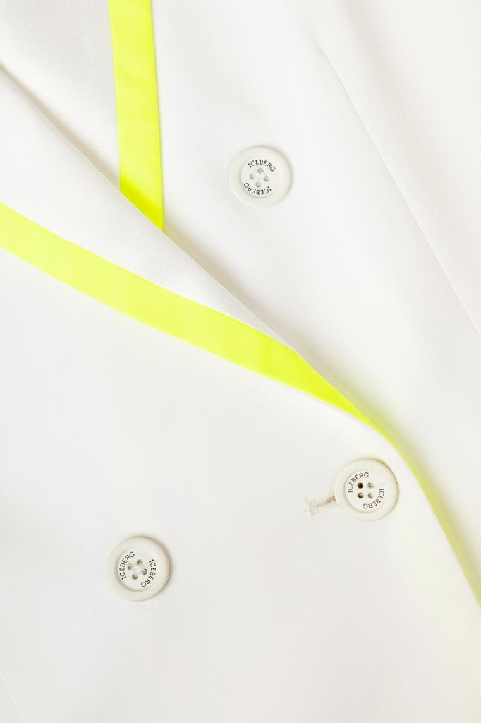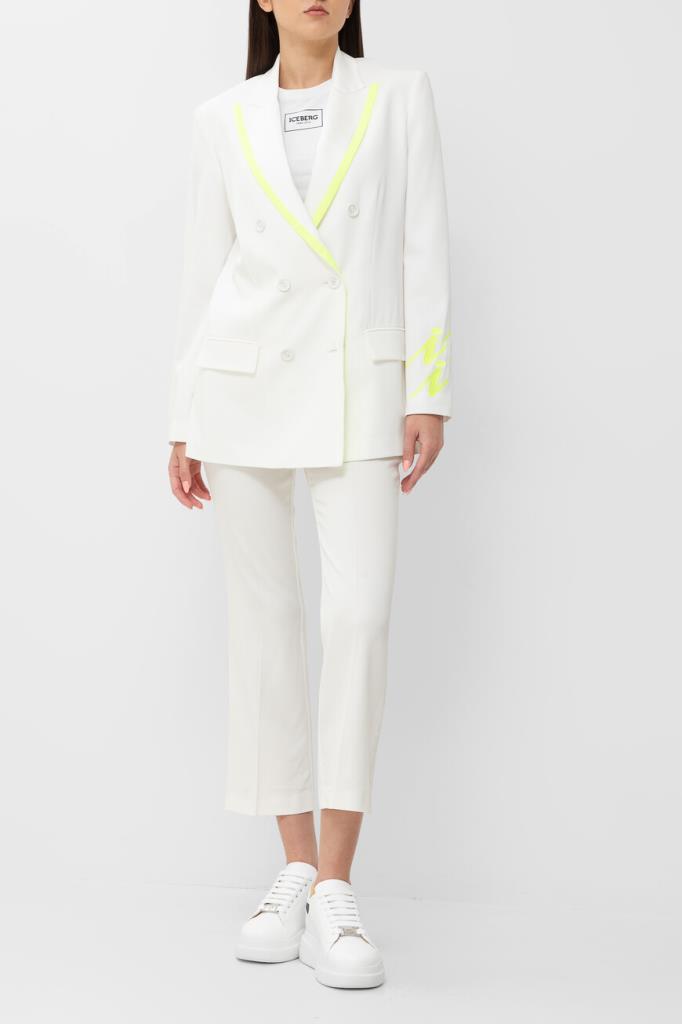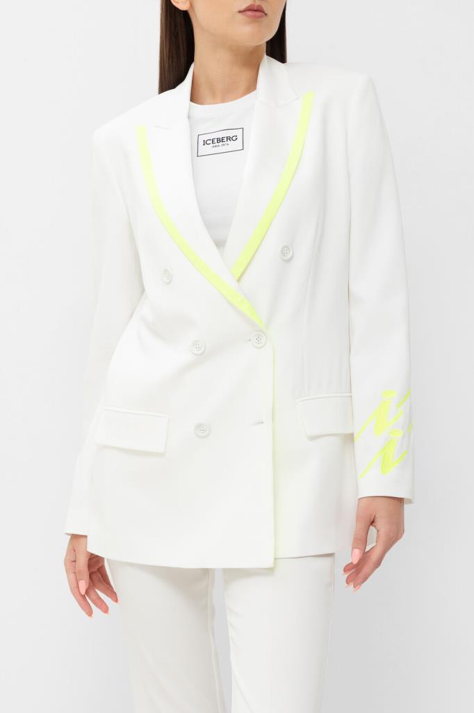 Женский пиджак ICEBERG из мягкого натурального вискозного джерси белого цвета. Приталенная двубортная модель с острыми прямоугольными лацканами, длинными рукавами, контрастной жёлтой окантовкой на воротнике спереди и внутренней стороне застёжки, шлицей сзади, стильным жёлтым принтом на левом рукаве и прорезными карманами с клапанами по бокам.