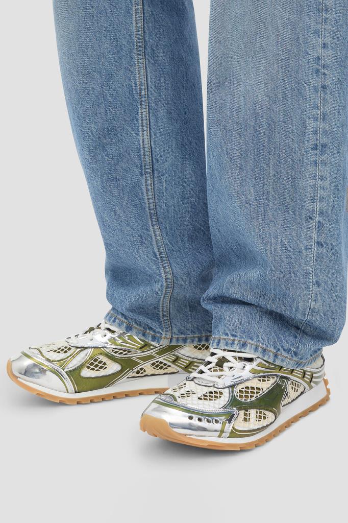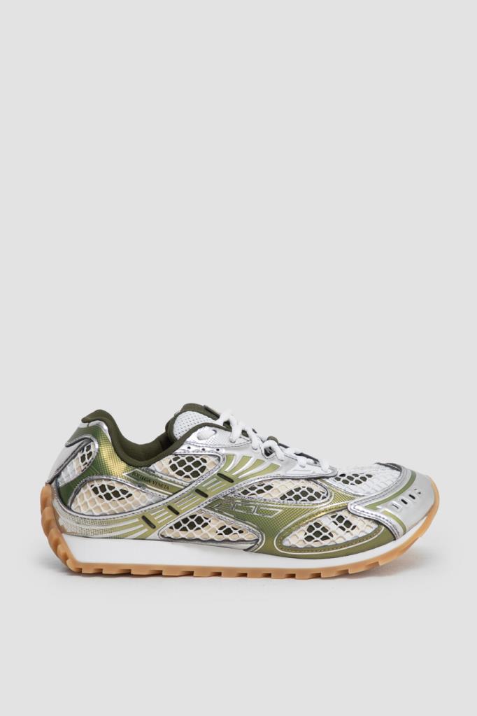 Беговые сникеры Orbit от BOTTEGA VENETA с закрытым типом шнуровки. Для изготовления модели с широкой колодкой выбраны плотный эластичный текстиль, крупная сетка и полимерное волокно (металлизированные вставки). Отличительными особенностями изделия стали укреплённые округлый носок и задник и плоская двухцветная подошва с промежуточным слоем из EVA и шевронным протектором для дополнительной устойчивости.