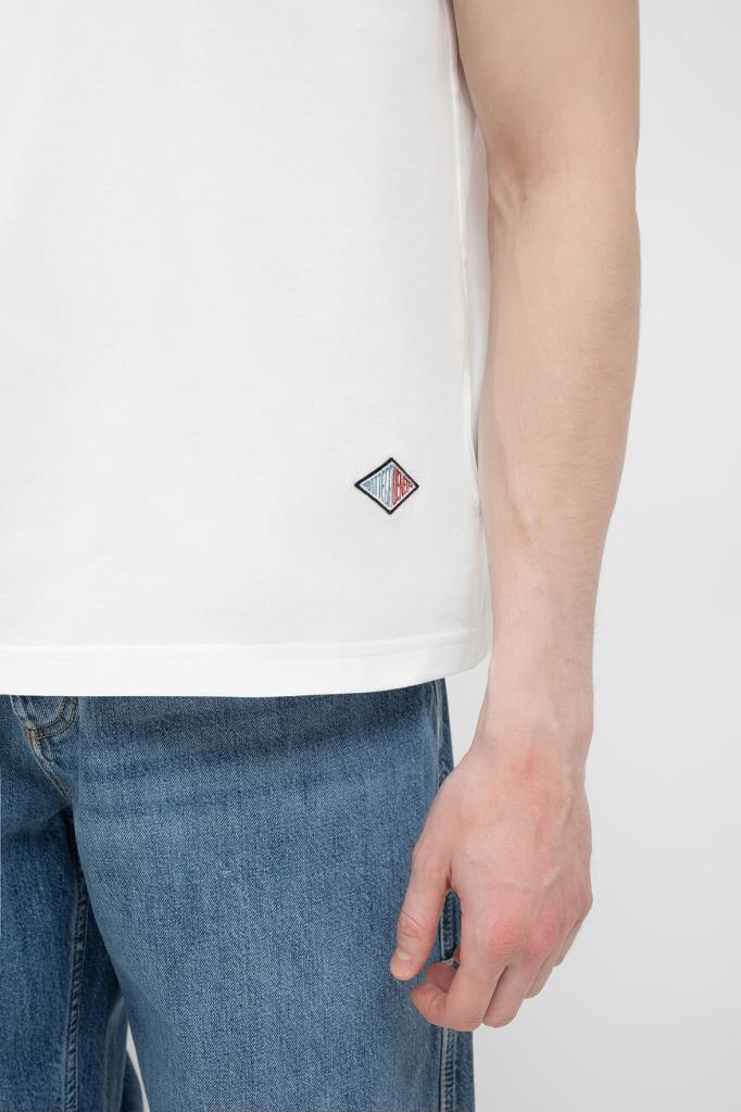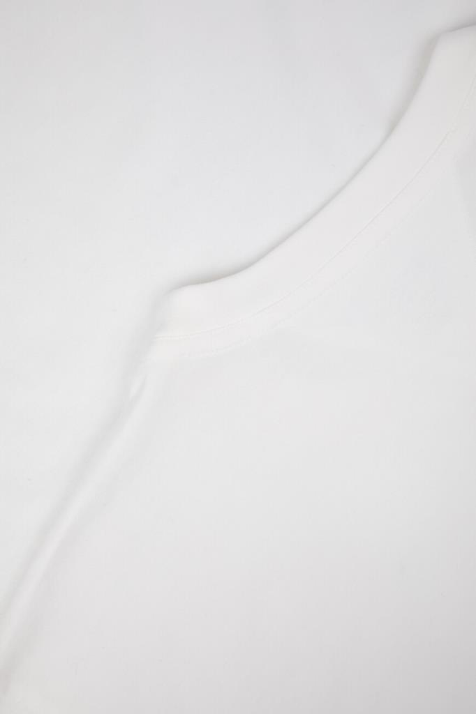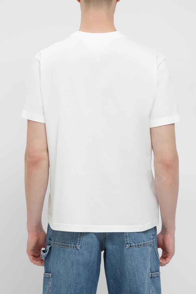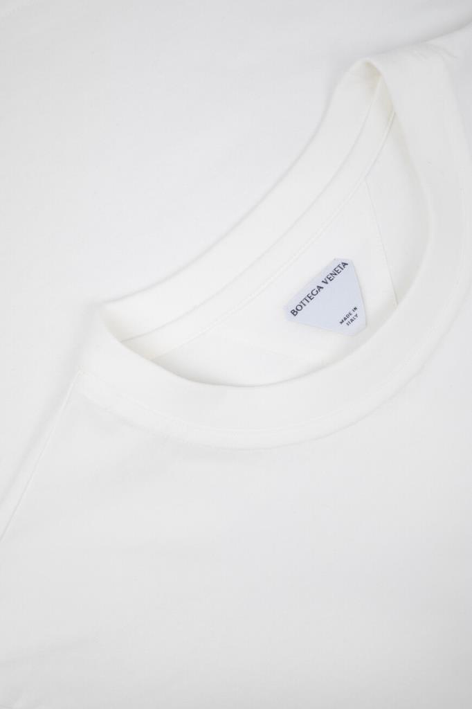 Базовая футболка BOTTEGA VENETA с перевёрнутым треугольником на спинке. Модель изготовлена из лёгкого хлопкового джерси белого цвета. Фасон изделия предполагает расслабленный силуэт и наличие круглого выреза горловины на резинке. Атрибутом Дома является ромбовидный патч с вышитым двухцветным логотипом спереди.