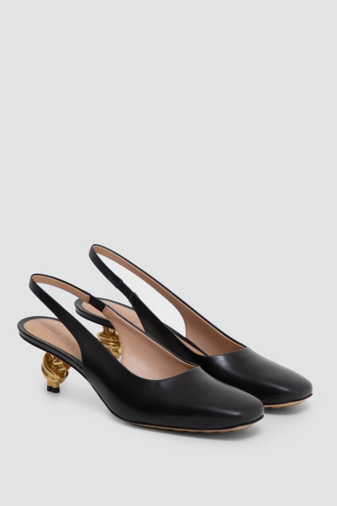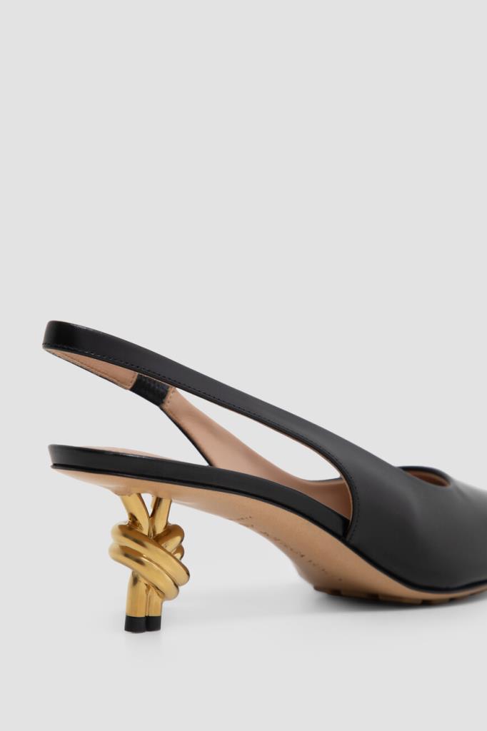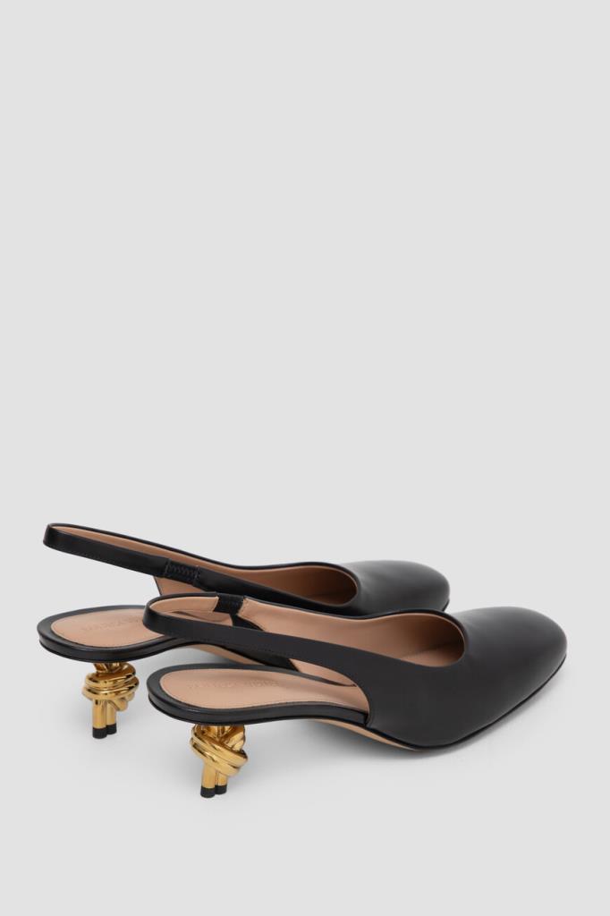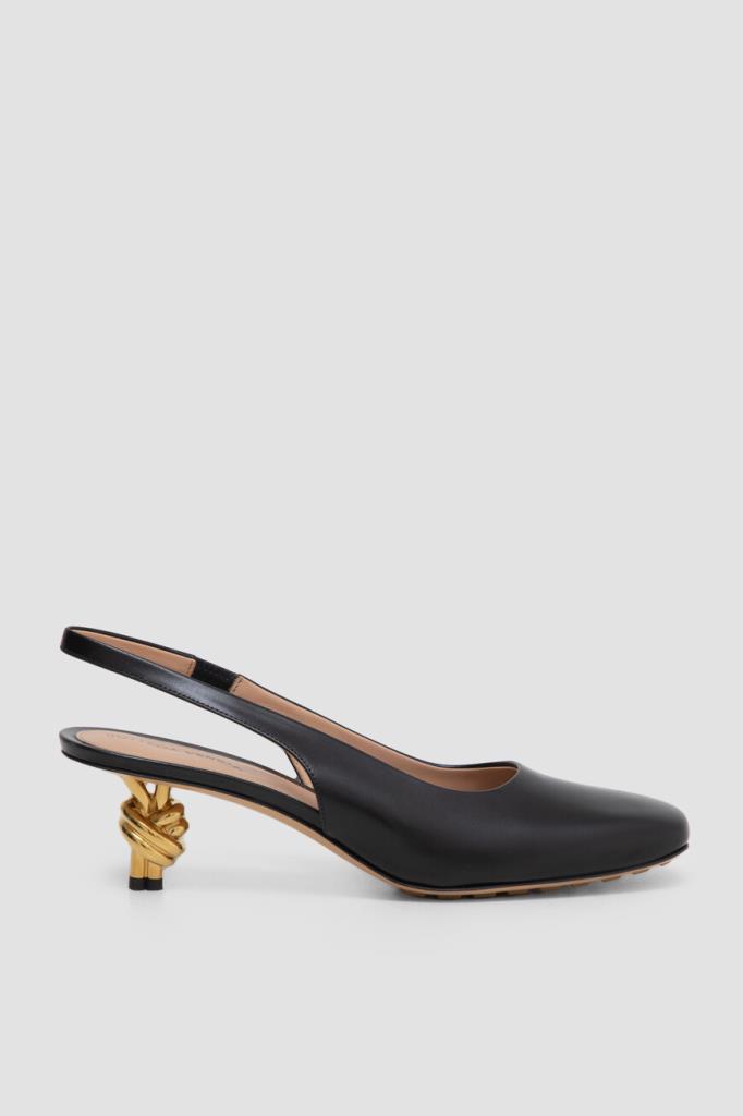 Кожаные туфли Knot чёрного цвета от BOTTEGA VENETA. Модель изготовлена из гладкой кожи телёнка и установлена на светло-коричневую подошву с дизайнерским каблуком и противоскользящими резиновыми накладками-протектором для надёжного сцепления с дорогой. Устойчивый скульптурный каблук выполнен в виде узла из латуни золотого оттенка с гальваническим покрытием, а кожаные стельки декорированы тиснёным логотипом Дома.