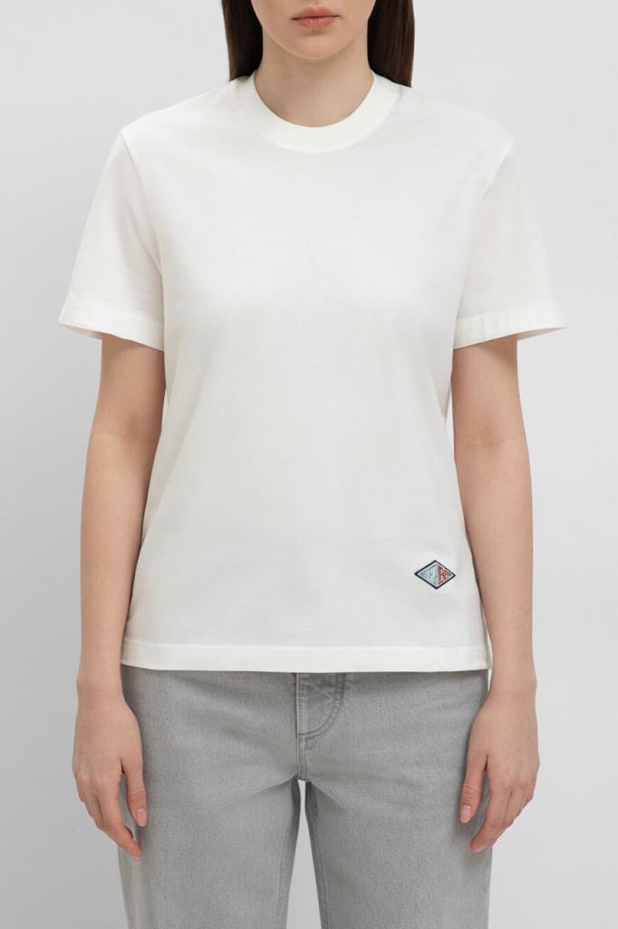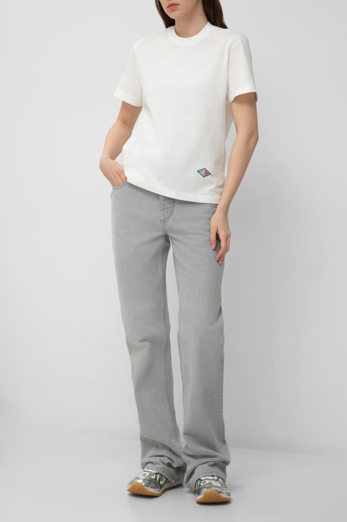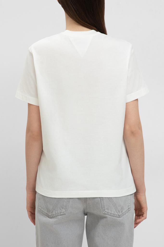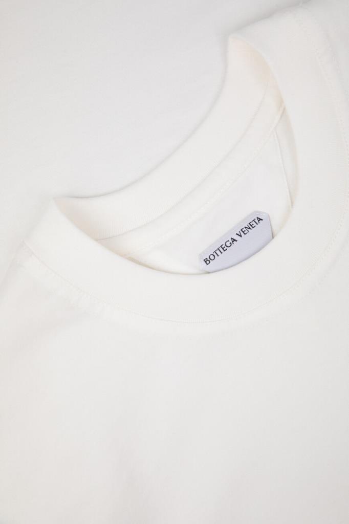 Белая футболка расслабленного силуэта от BOTTEGA VENETA. Изделие сшито из лёгкого хлопкового джерси и украшено ромбовидным патчем с вышитым двухцветным логотипом Дома спереди снизу. Отличительной деталью также является вставка в виде перевёрнутого треугольника на спинке.