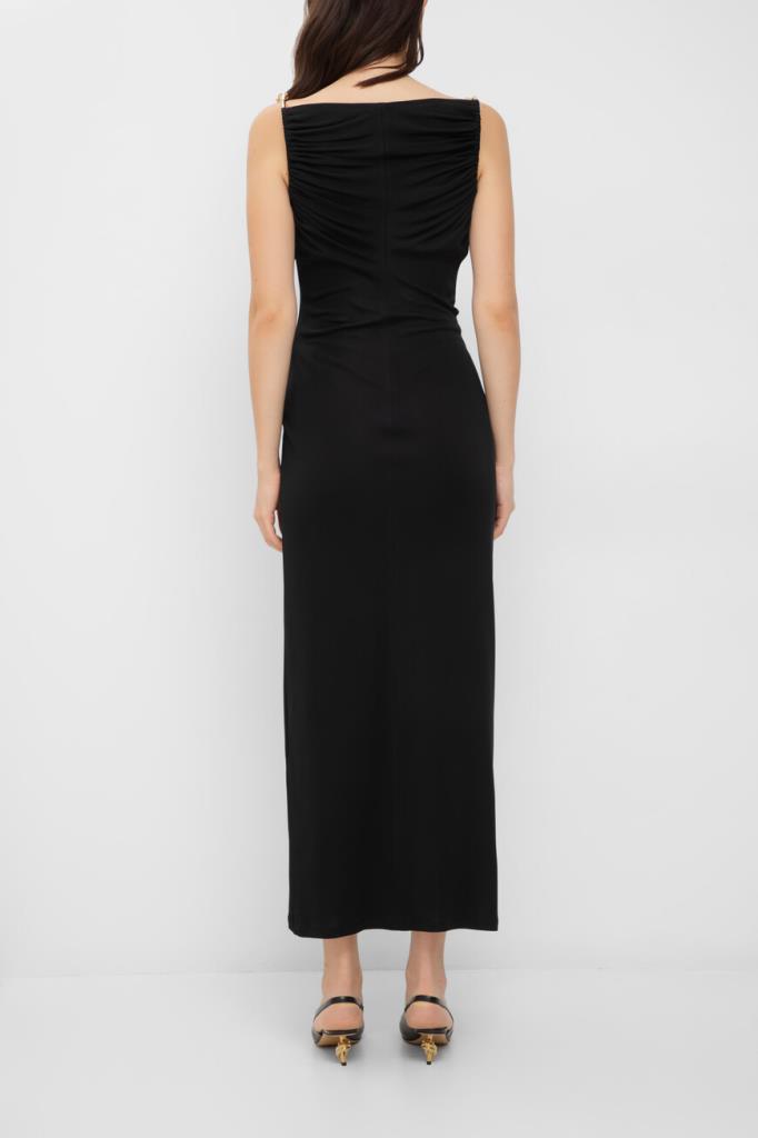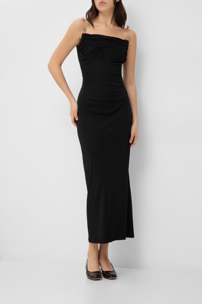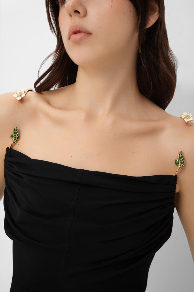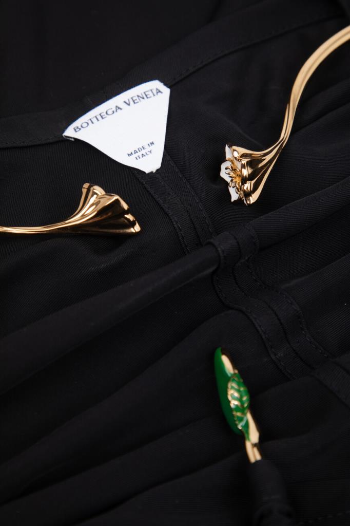 Длинное платье чёрного цвета от BOTTEGA VENETA. Для пошива изделия прилегающего силуэта выбрано мягкое вискозное джерси. Модель интересна наличием плиссированных деталей спереди и сзади сверху и отсутствием рукавов. Платье оснащено сборкой и жёсткими деталями в виде листьев и цветов вместо традиционных бретелей.