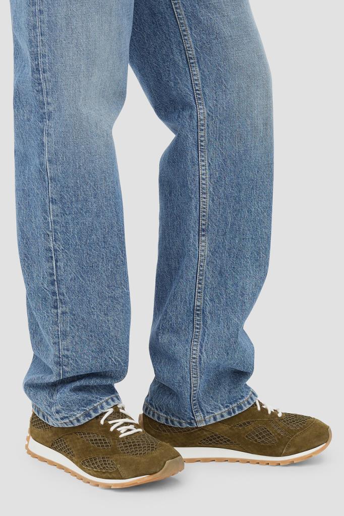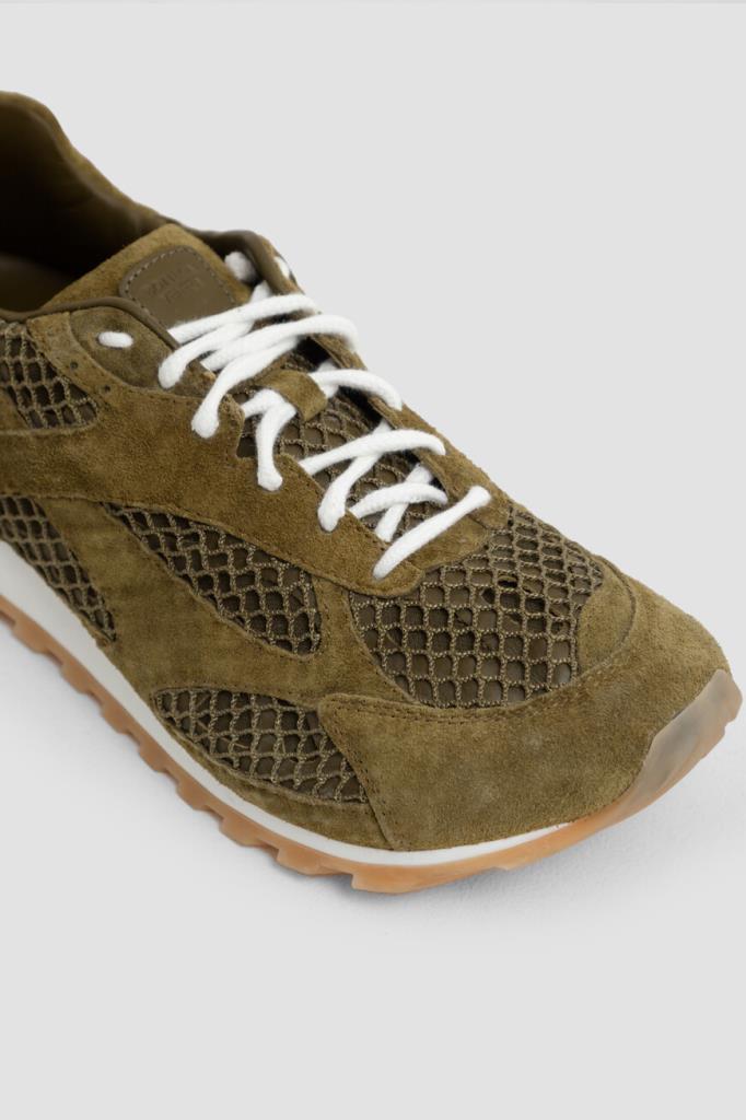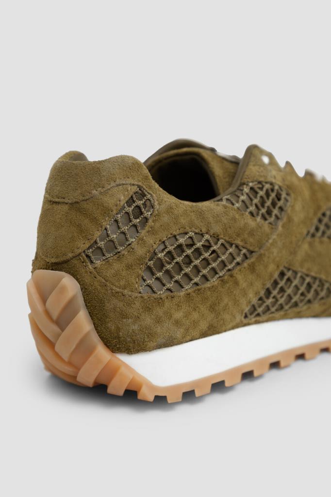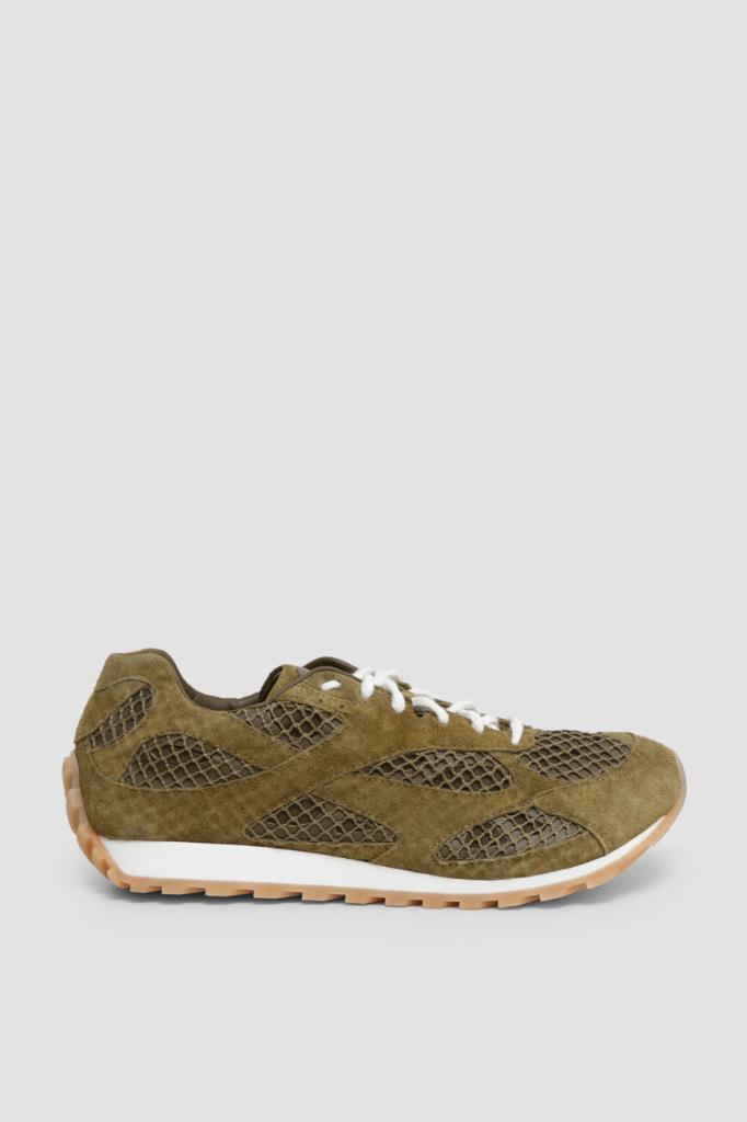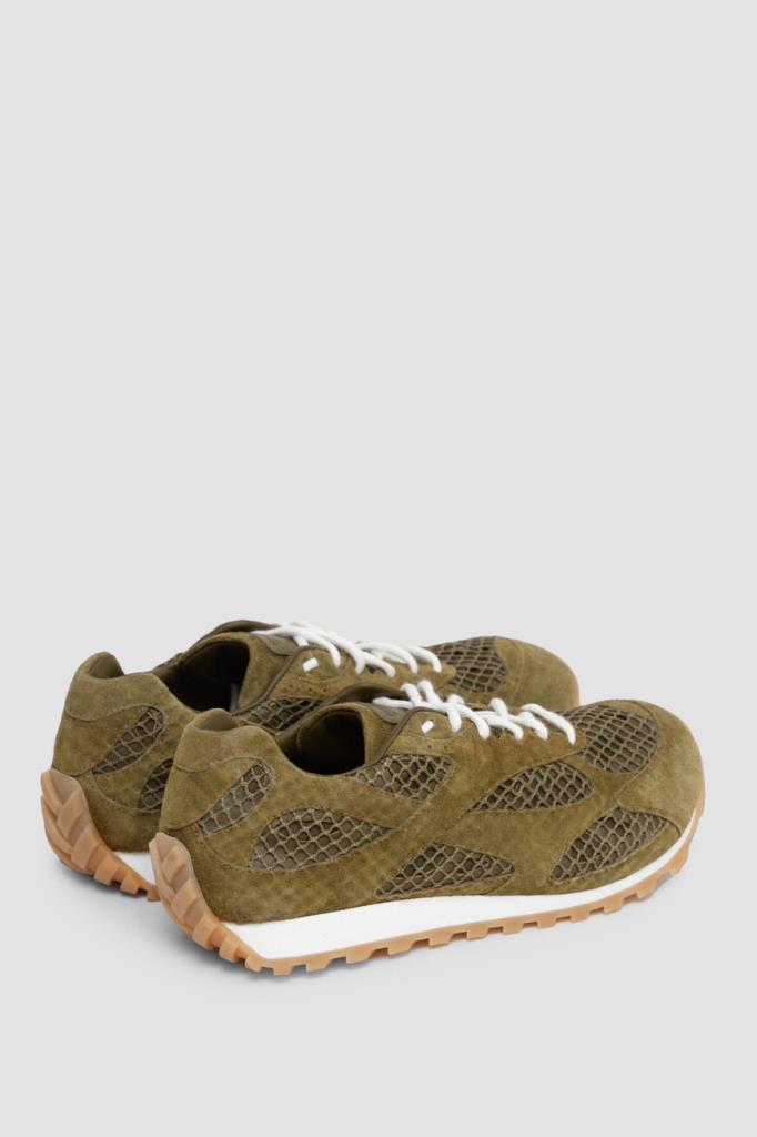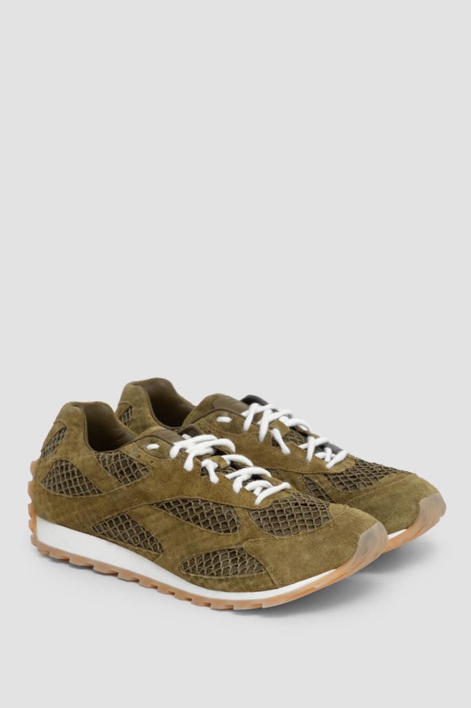 Сникеры Orbit от BOTTEGA VENETA с укреплёнными округлым носком и задником. Лёгкая модель изготовлена из комбинации бархатистой замши и плотного текстиля в крупную сетку оливкового оттенка. Конструкция удобной пары предполагает наличие закрытой белой шнуровки и плоской двухцветной подошвы с протектором для дополнительной устойчивости.