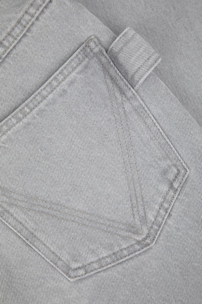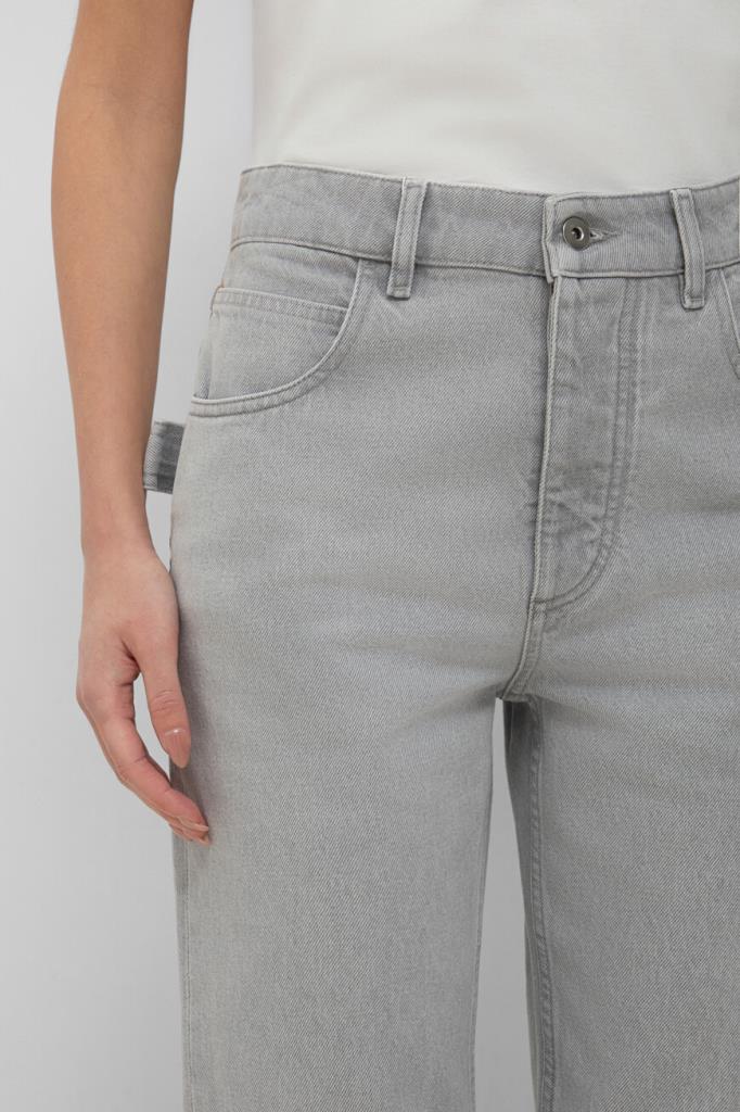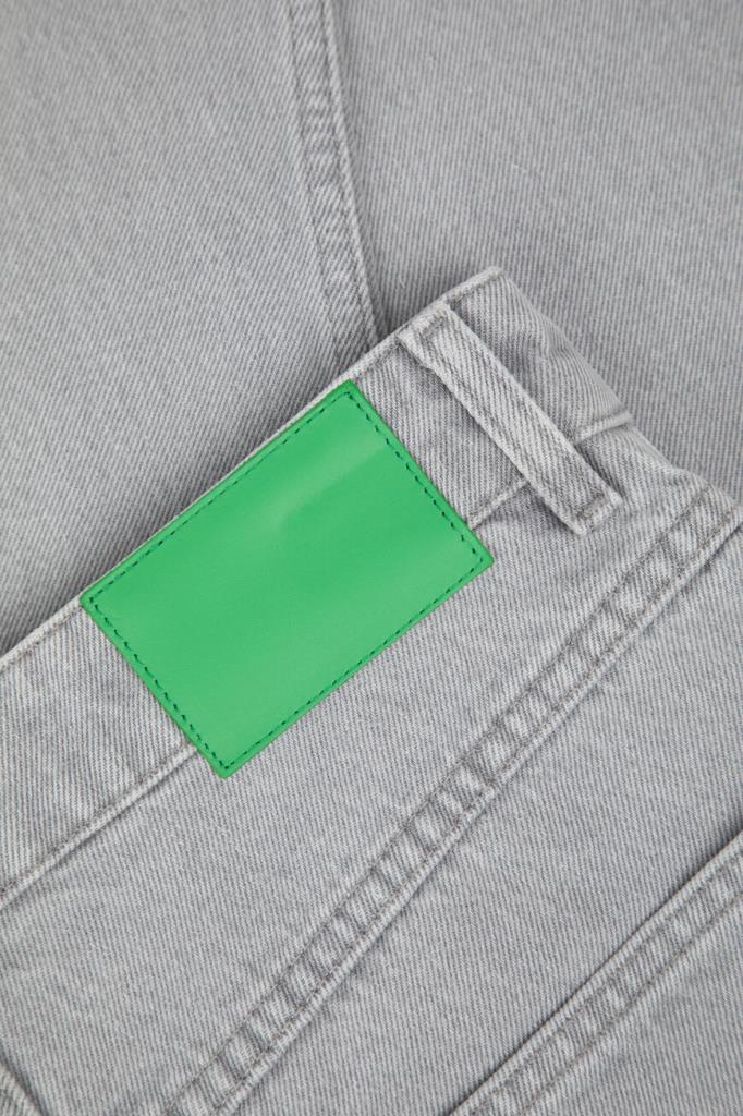 Джинсы-клёш светло-серого цвета от BOTTEGA VENETA. Для изготовления повседневной модели используется мягкий хлопковый деним с выбеленным эффектом. На поясе сзади присутствует прямоугольная зелёная накладка, а задние карманы украшает тройная дизайнерская строчка-вышивка в виде литеры «V». Носите изделие с кардиганом с широким воротником в два сложения из той же коллекции.