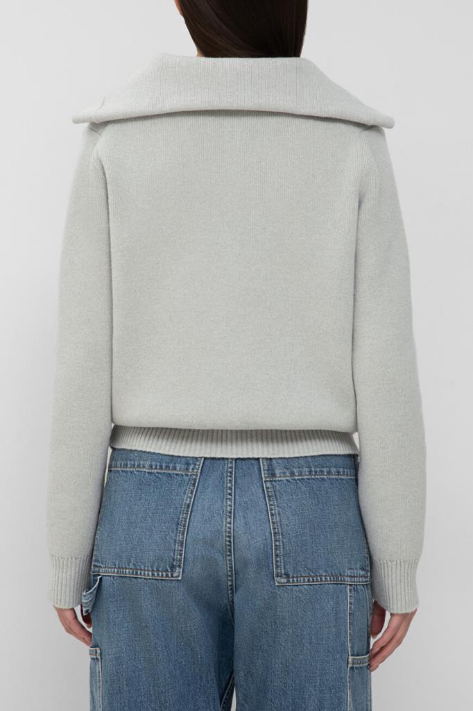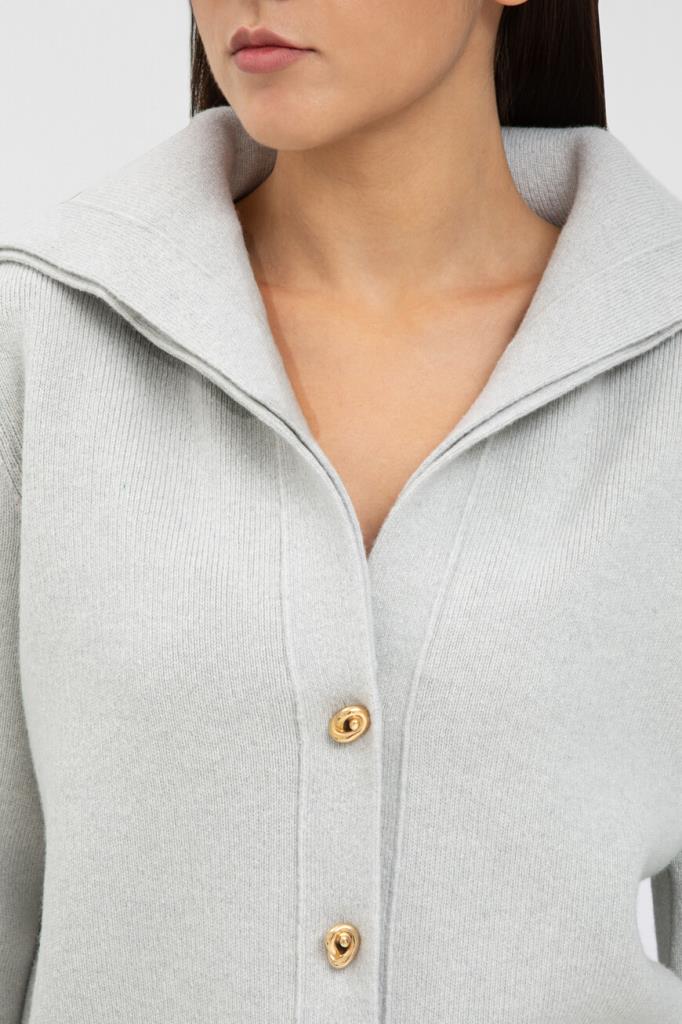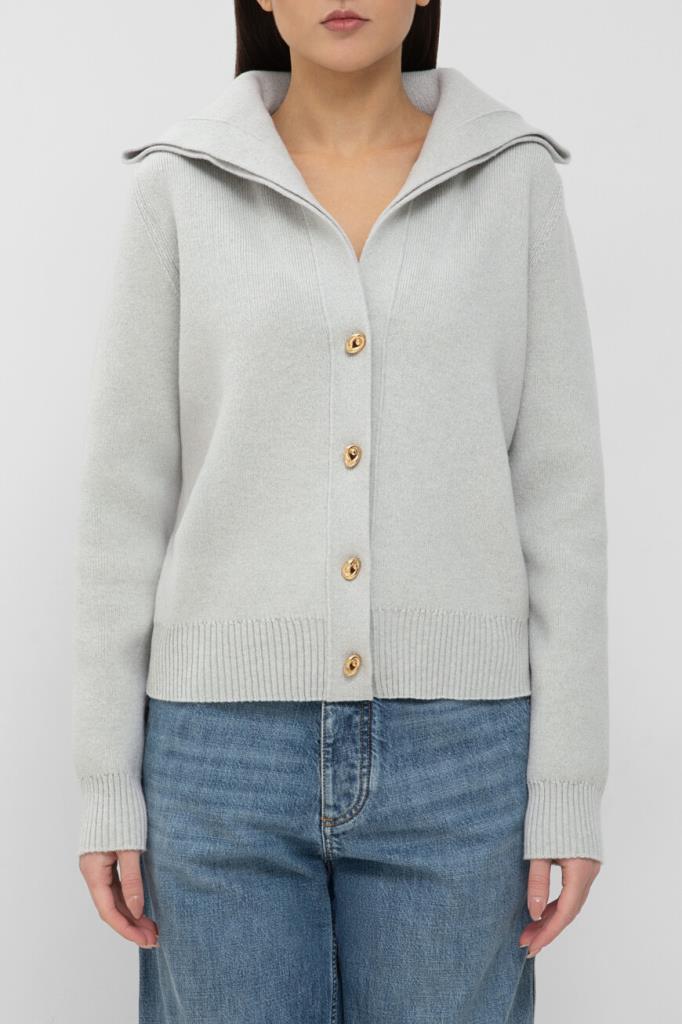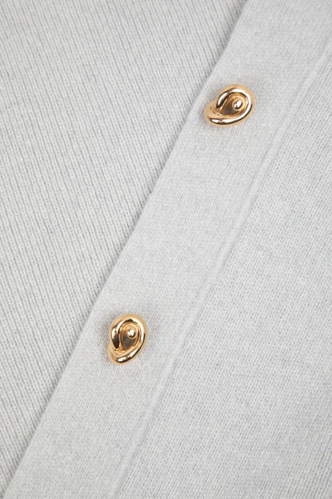 Кардиган BOTTEGA VENETA на крупных фигурных пуговицах в виде узлов. Для изготовления повседневной модели выбрана мягкая плотная шерсть светло-серого оттенка. Изделие прямого силуэта отличается широким воротником, выполненным в два сложения, и очерченной планкой застёжки. Кардиган нейтрального цвета станет основой Ваших casual-комплектов.